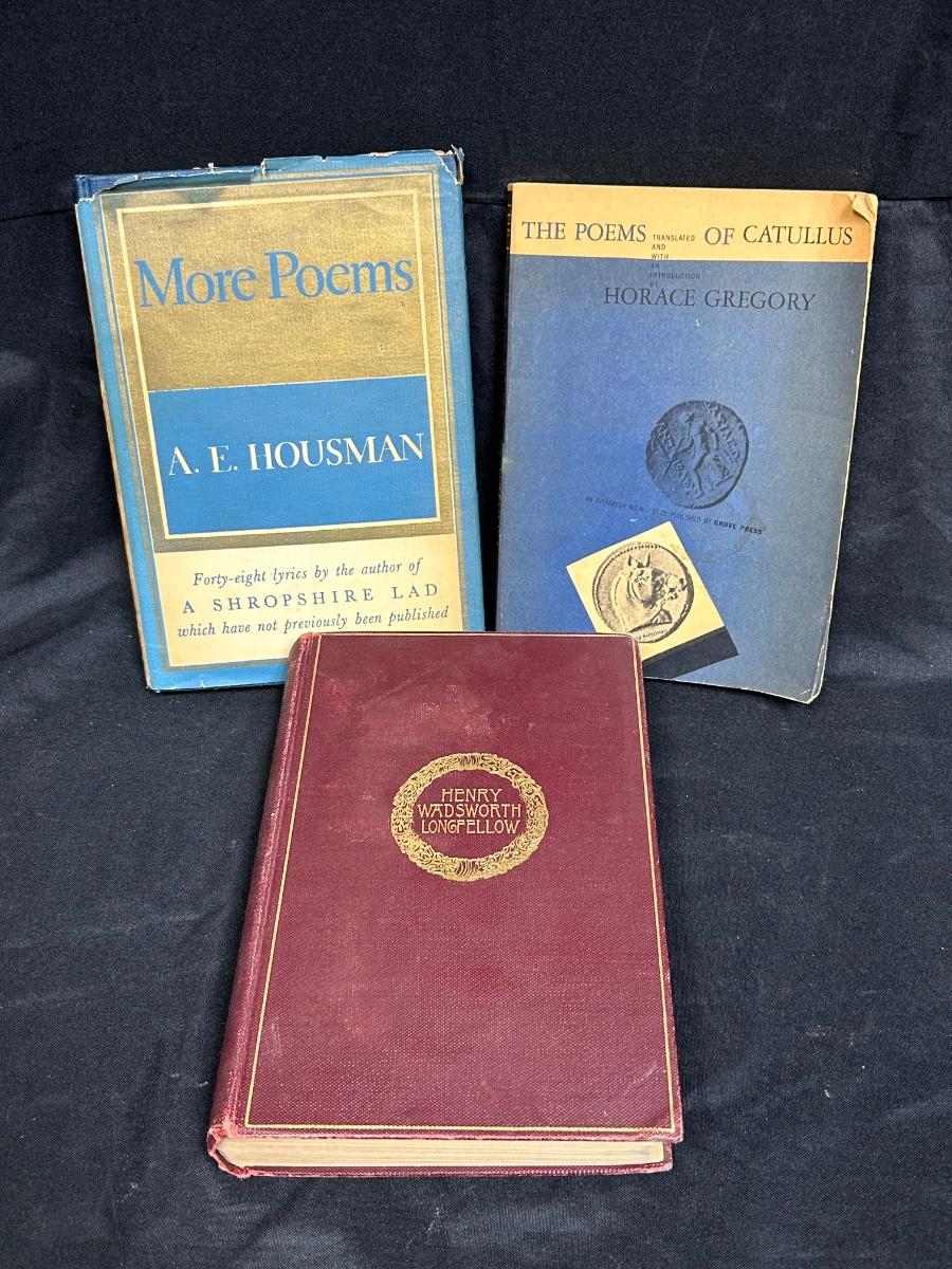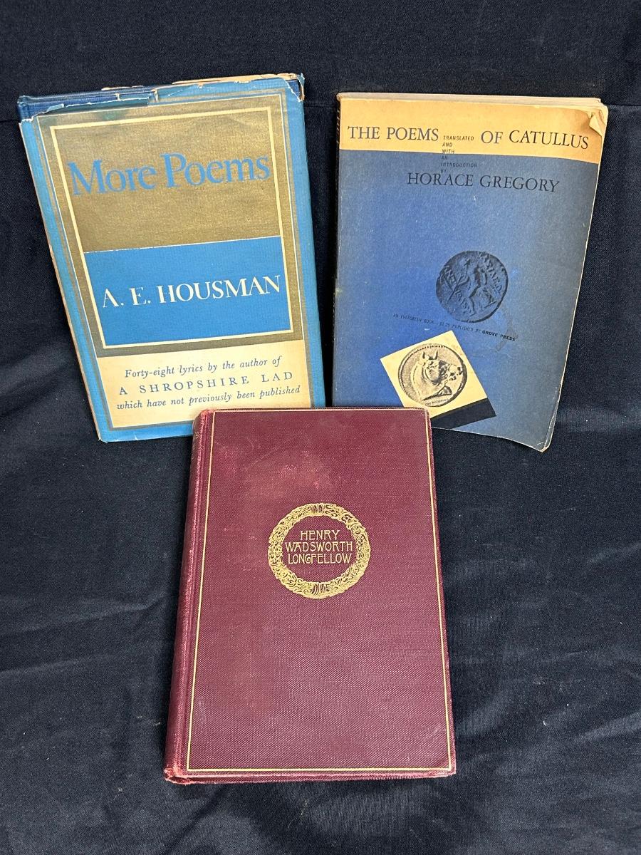 Lot of Three Vintage Poetry Books Housman Longfellow Catullus. In vintage condition. Previously displayed on bookshelf.