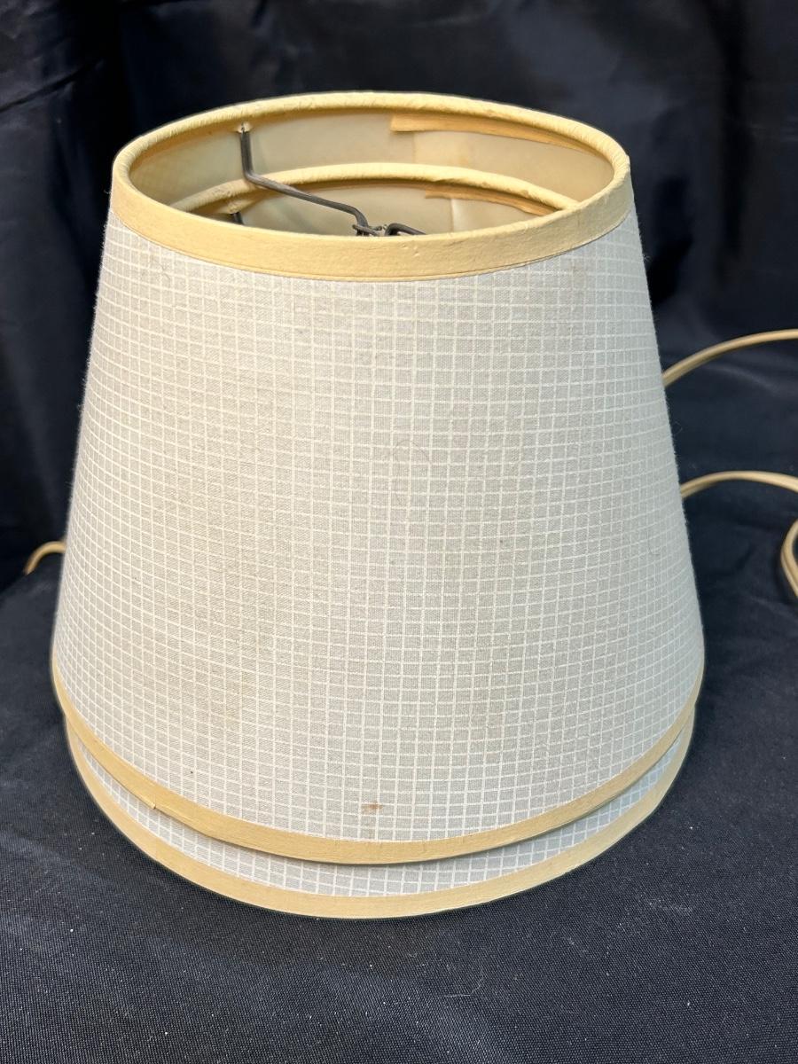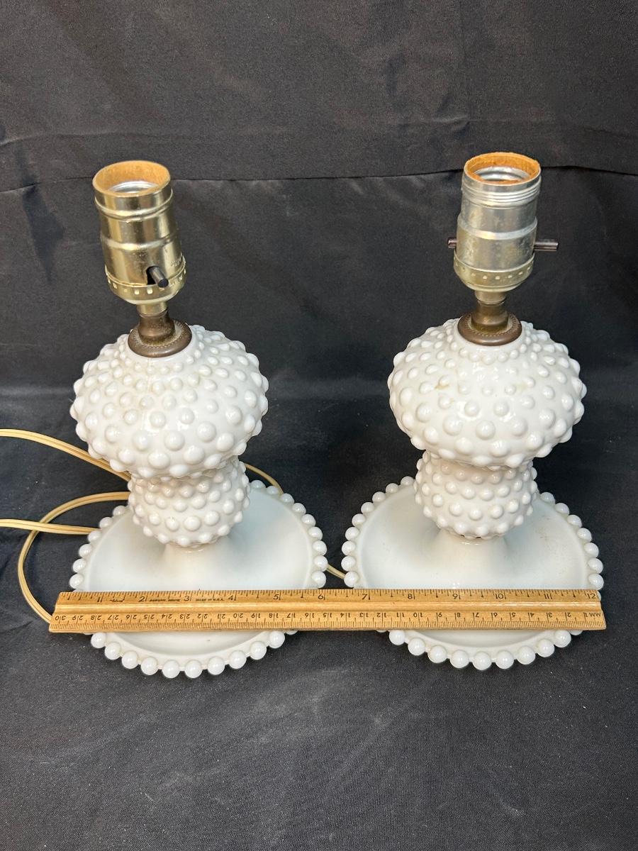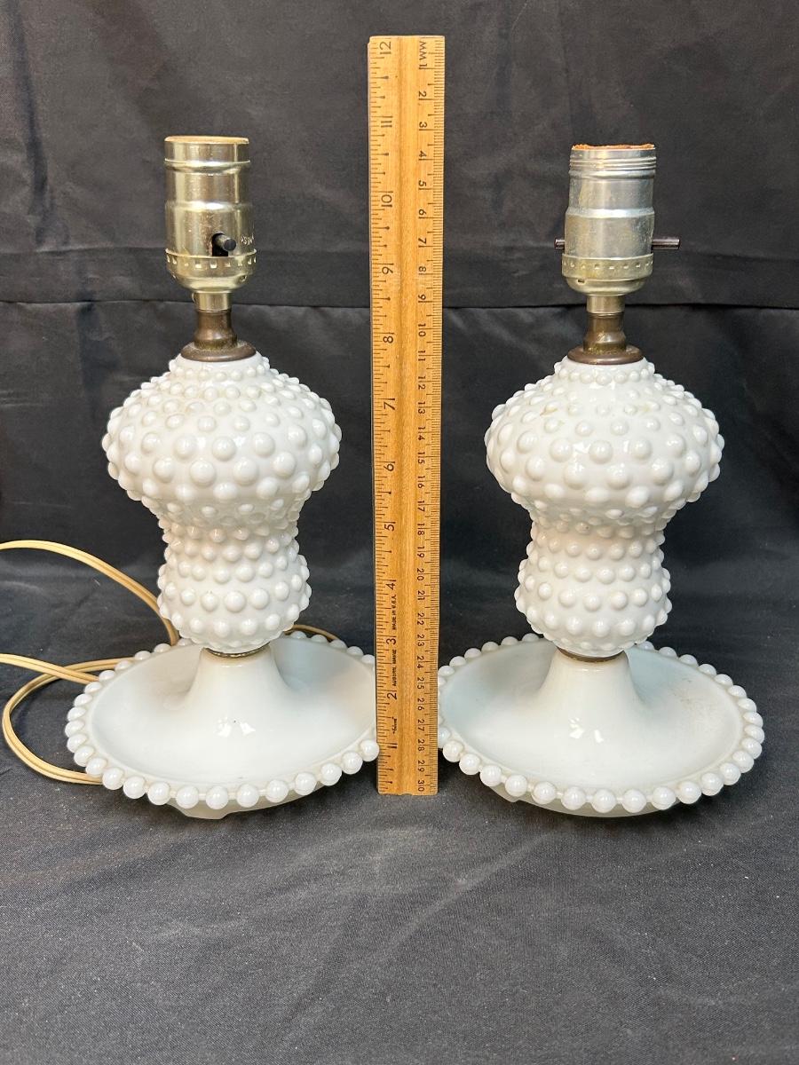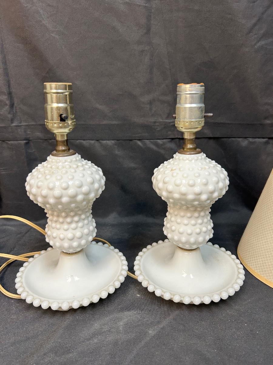 Pair of Vintage Hobnail Milk Glass Side Table Bedroom Vanity Lamps with Shades. Both are in good condition. Small footed dish bottom makes them great bedside or dresser lamps to hold trinkets and jewelry. Both work. Come with shades. About 11" size at top of socket.