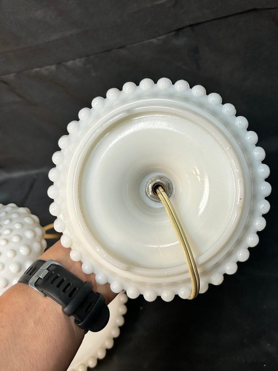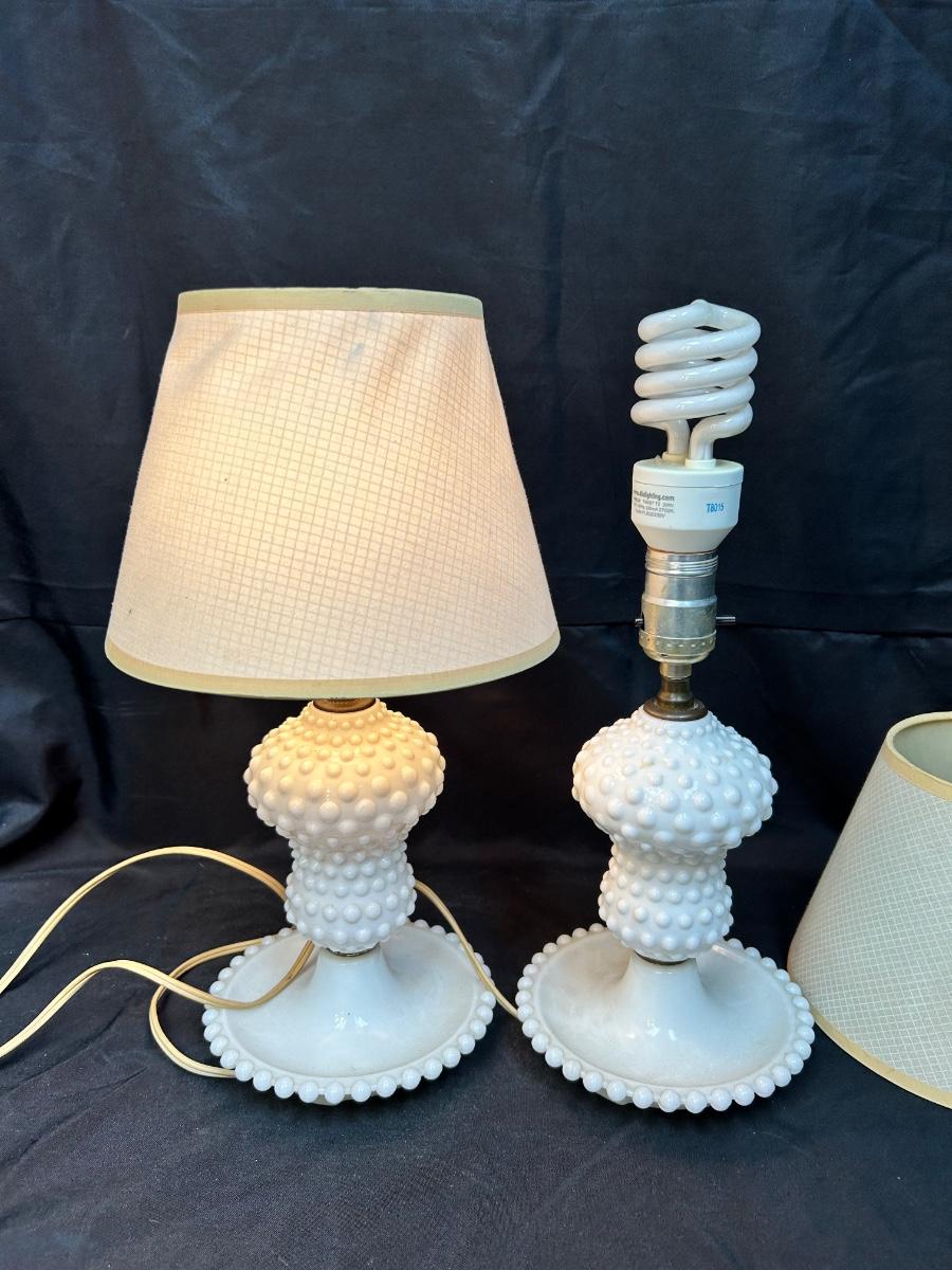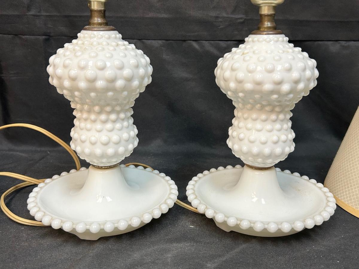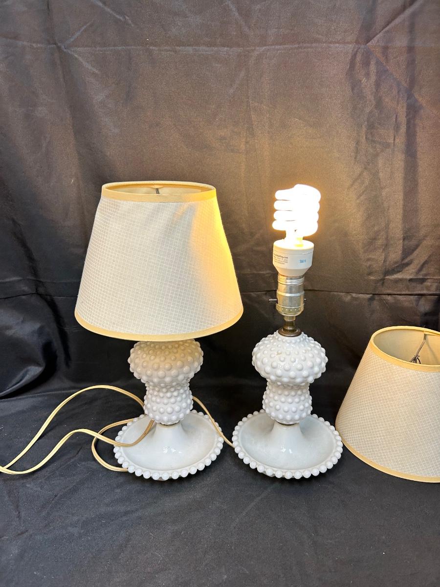 Pair of Vintage Hobnail Milk Glass Side Table Bedroom Vanity Lamps with Shades