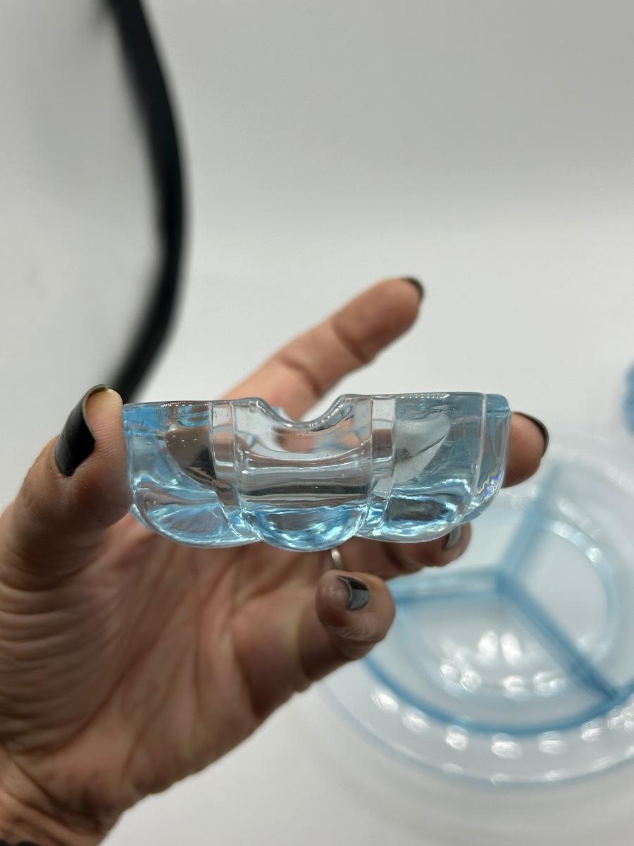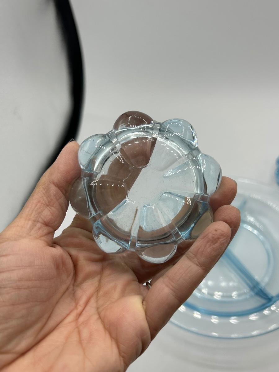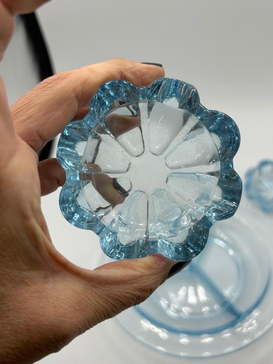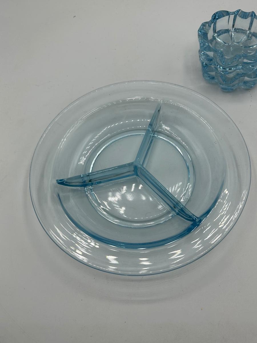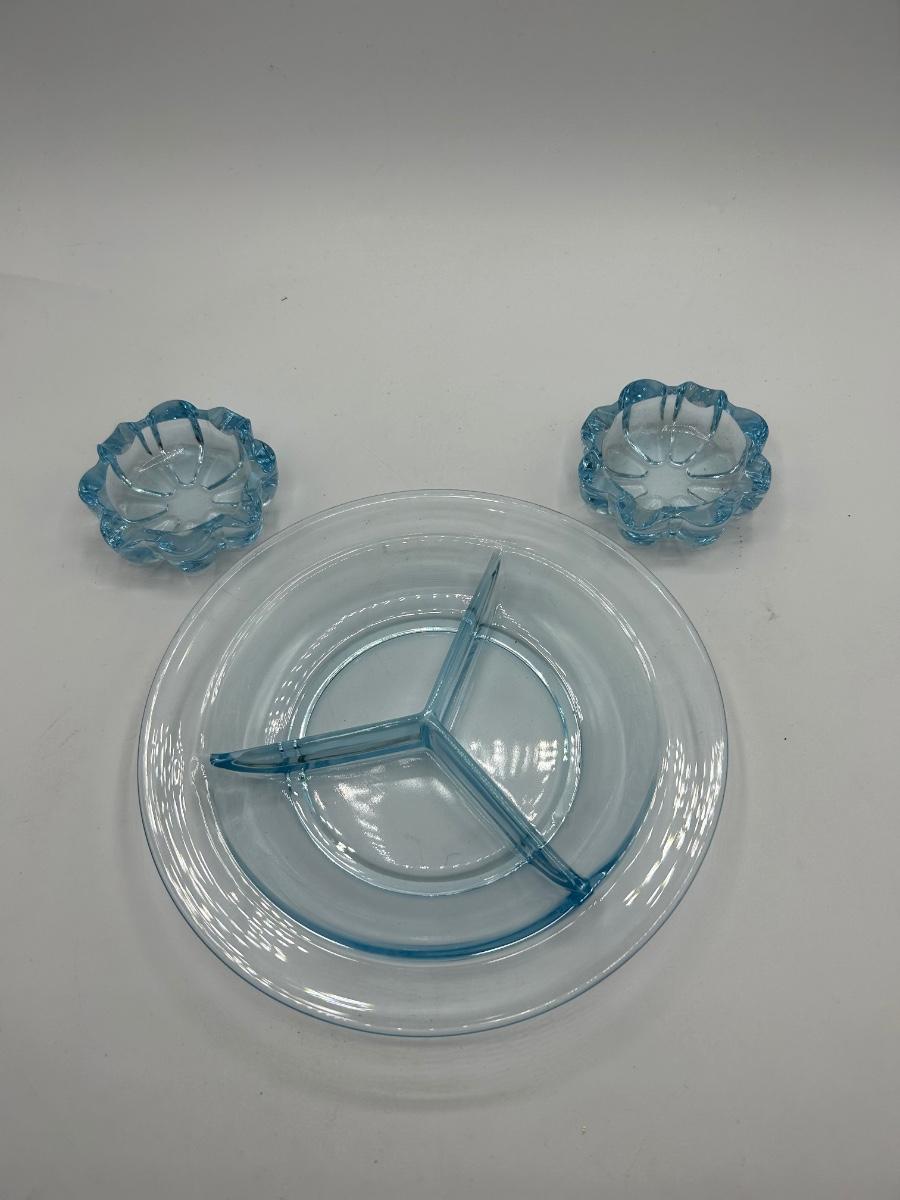 Vintage EAPG Pressed Glass Pale Blue Divided Bowl and Flower Shaped Ashtrays