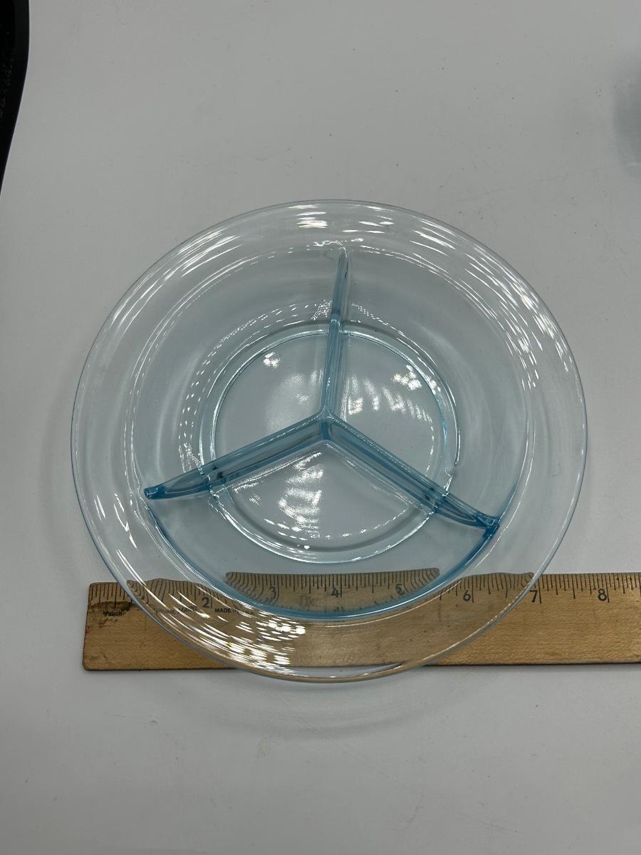Vintage EAPG Pressed Glass Pale Blue Divided Bowl and Flower Shaped Ashtrays. In good condition, no chips found. Great pale blue glow to the glass. One divided dish and two ashtrays included.