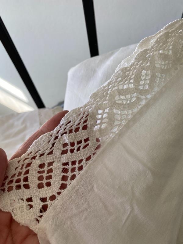 Mixed lot of white lace edge flat sheets. Large size, queen possibly king. There may be light spots or discolor.
