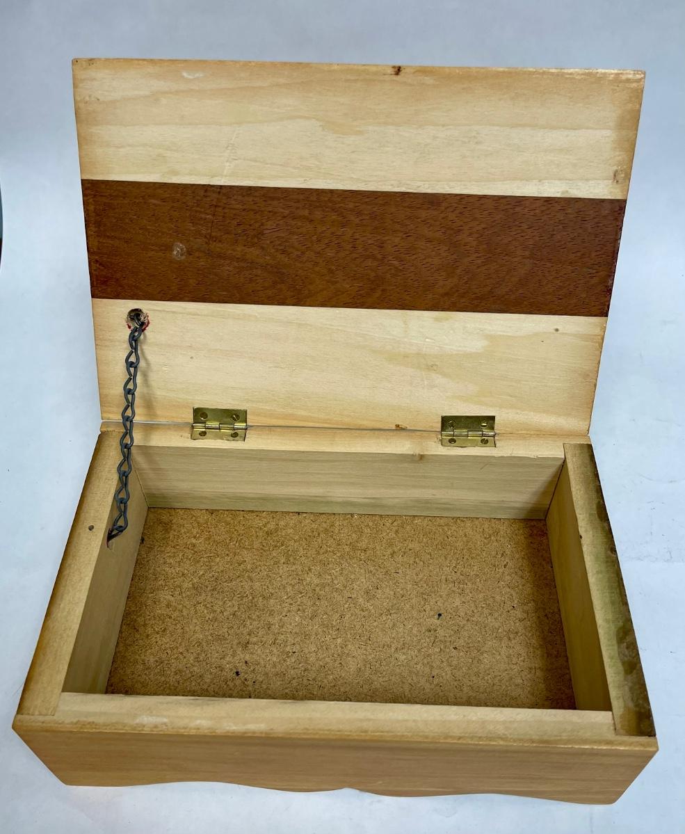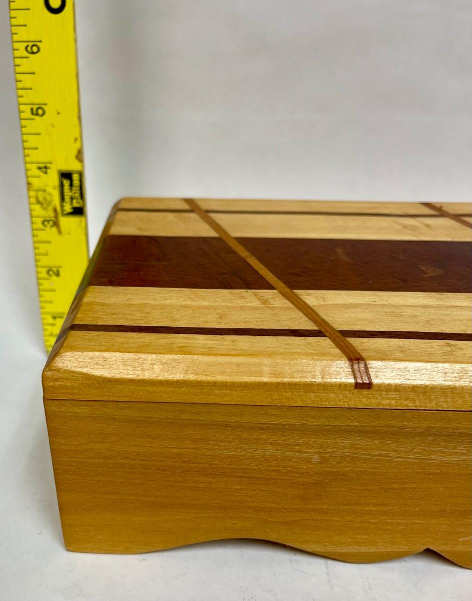 In good condition, but one side has a stain on the rim that only shows when box is open.