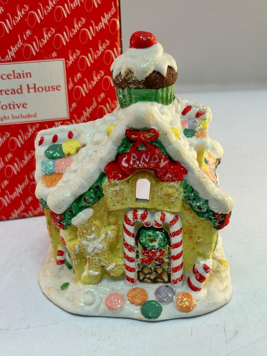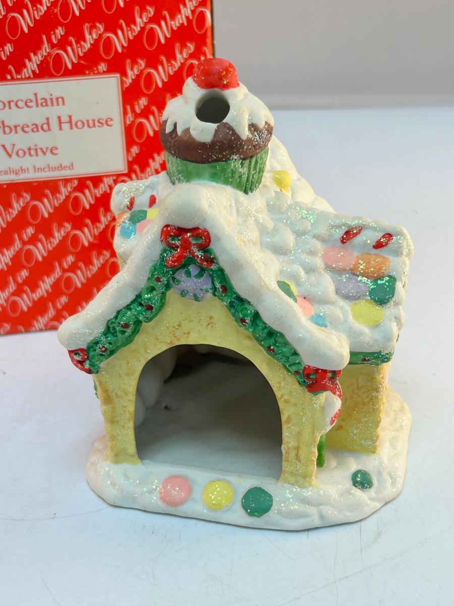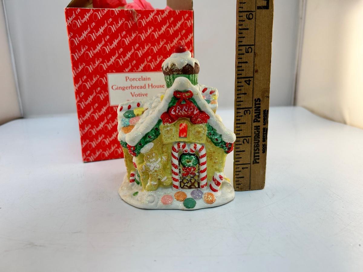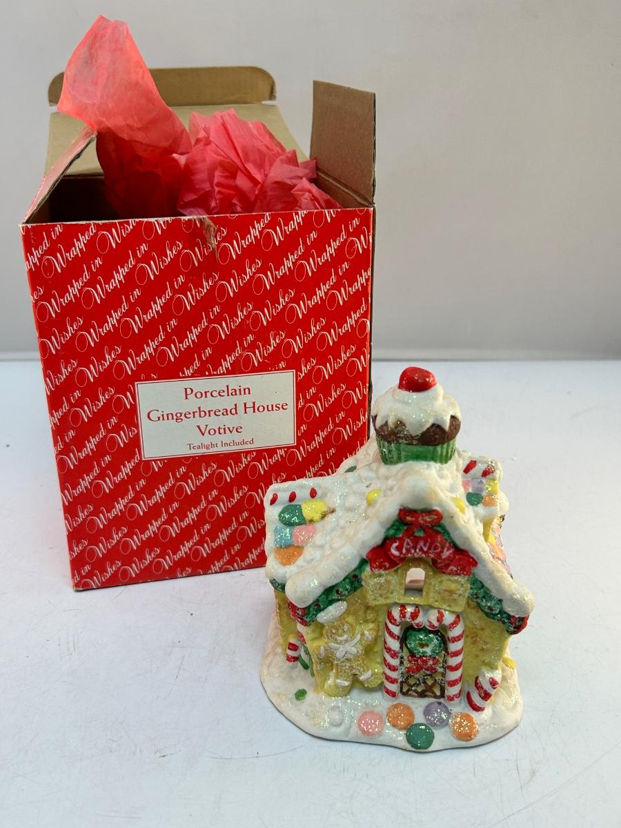Porcelain Christmas Holiday Gingerbread House Votive Candle Holder with Box. In good condition. About 5" size.