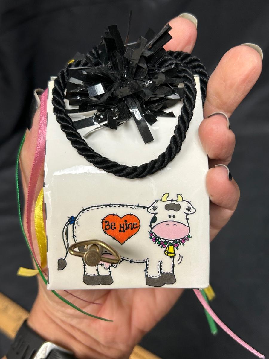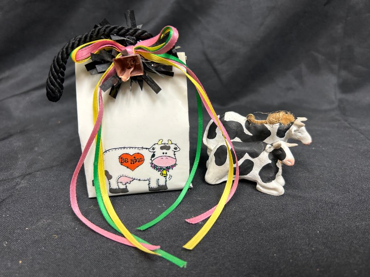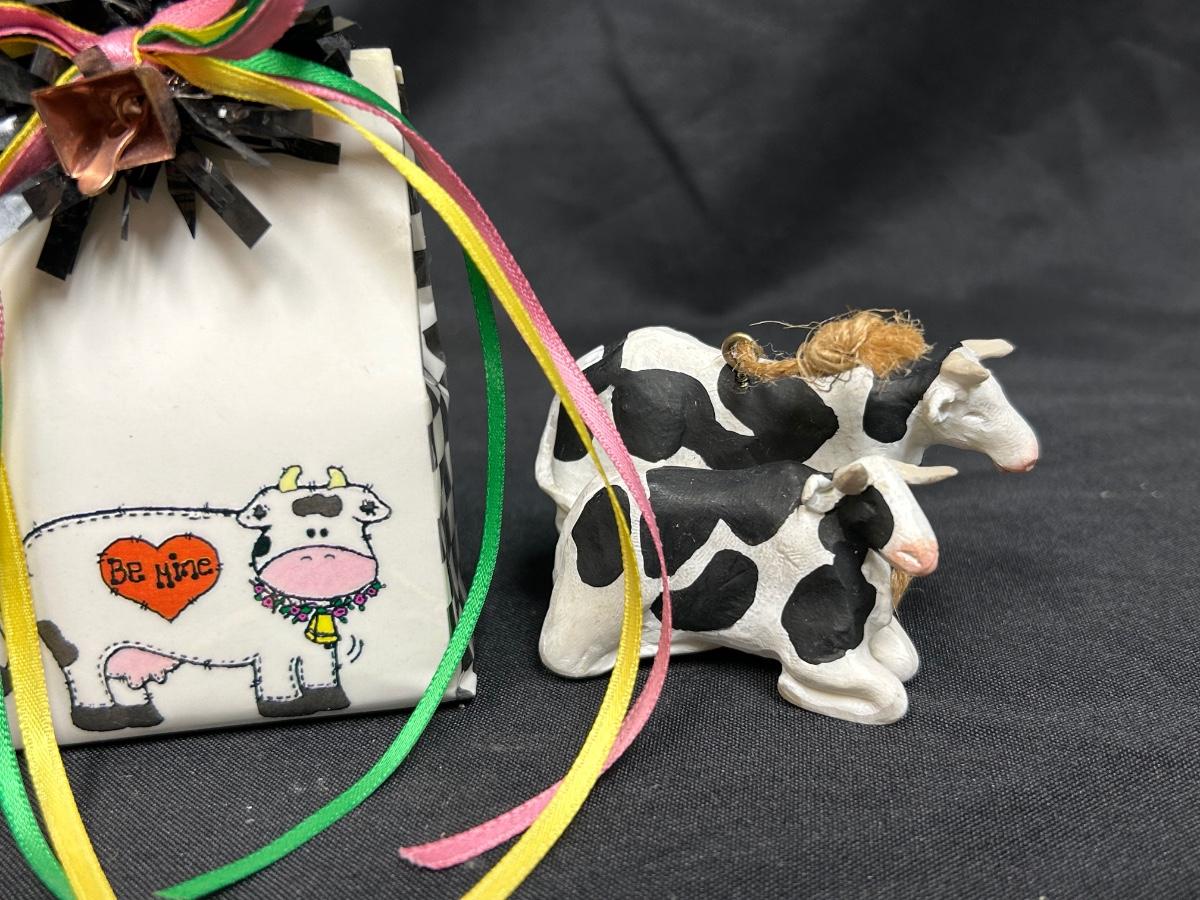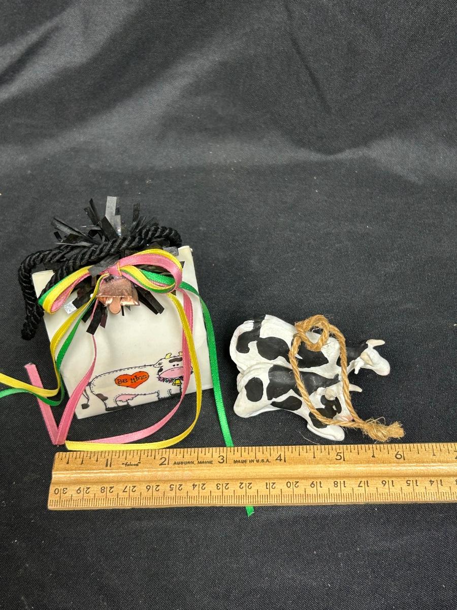 Pair of Cow Themed Figurine Decor Hanging Ornament and Small Music Box. Both are in good condition. The music box works but unsure of what the song is.