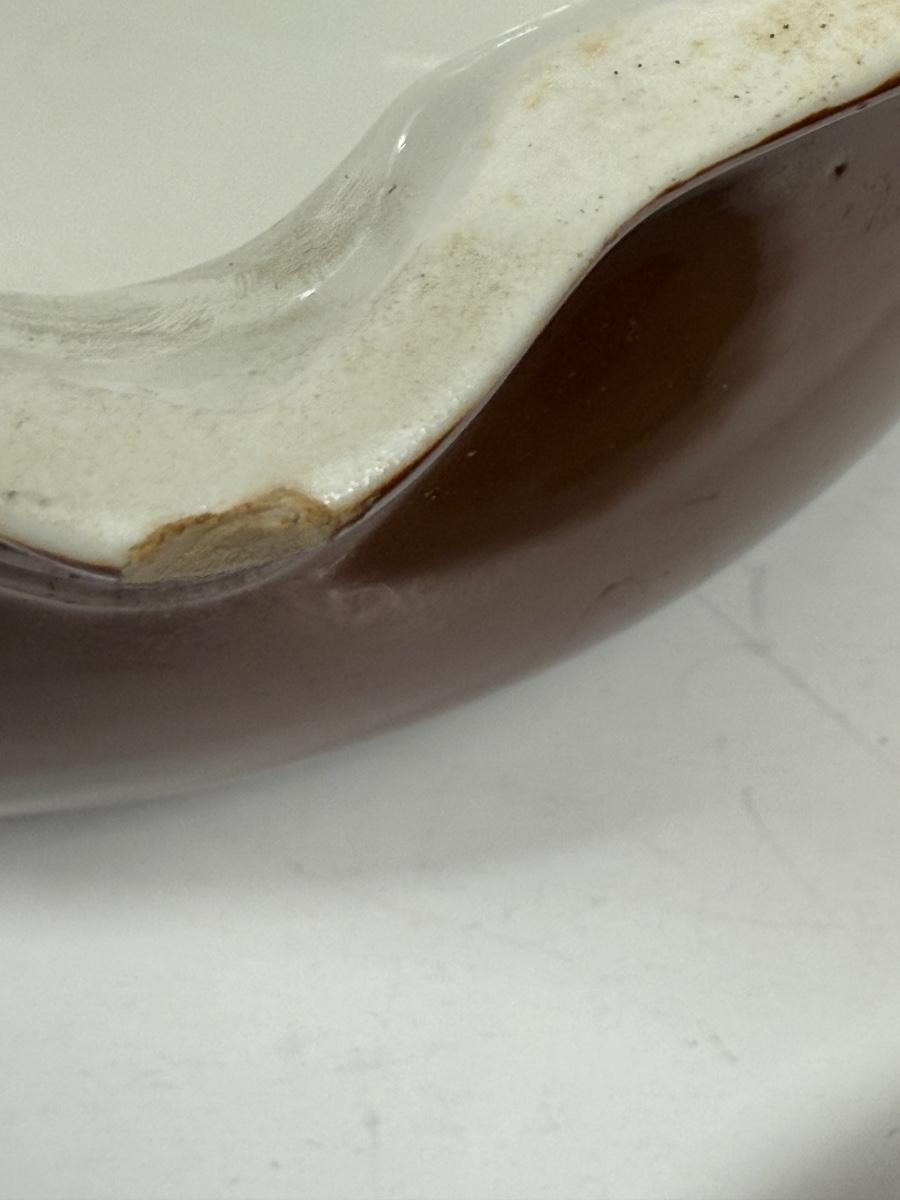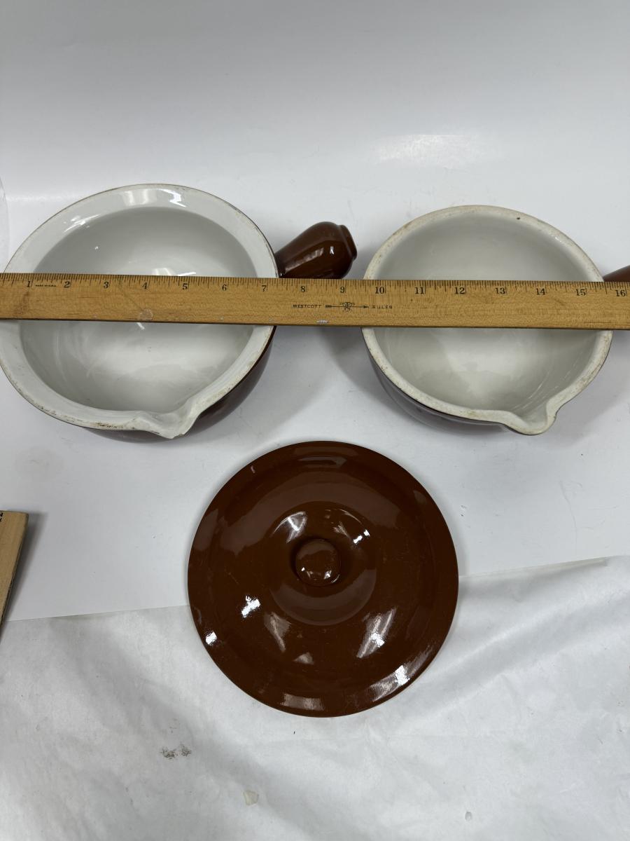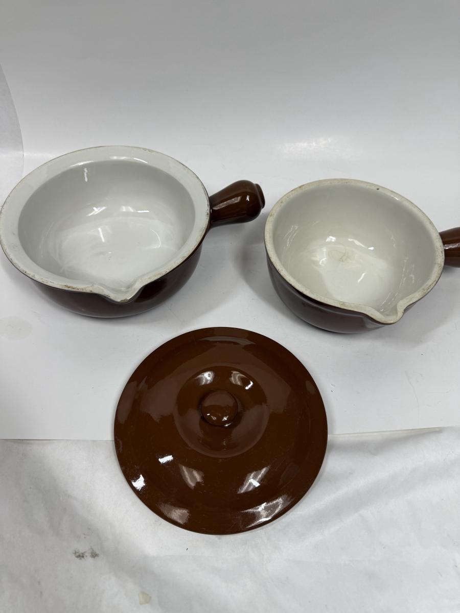 Dark brown outside, white inside. Only 1 lid. Good condition , no chips or cracks.