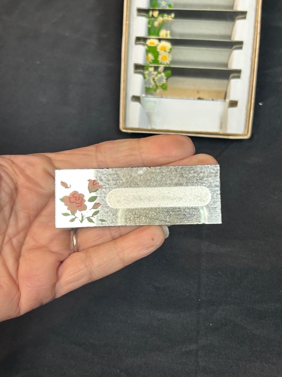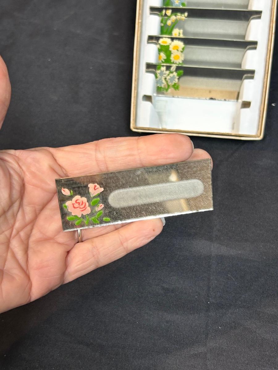 Vintage Set of Flower Painted Mirrored Table Setting Place Cards. Frosted spot to write names, can be erased with cleaner. In vintage condition.