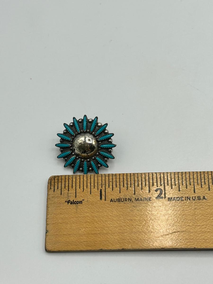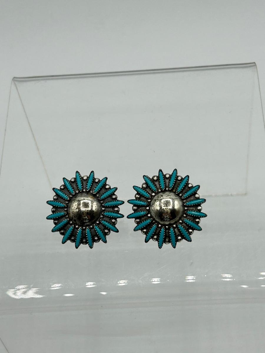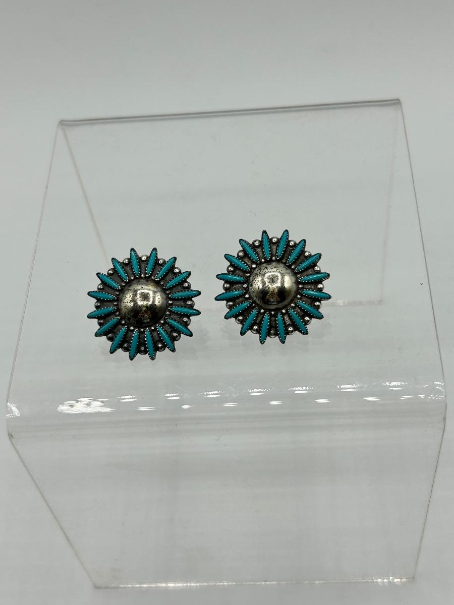 Vintage Southwestern Starburst Flower Sterling and Turquoise Screw Back Earrings. In good vintage condition. Earrings look to be marked sterling on the screw knobs. About 1" size.