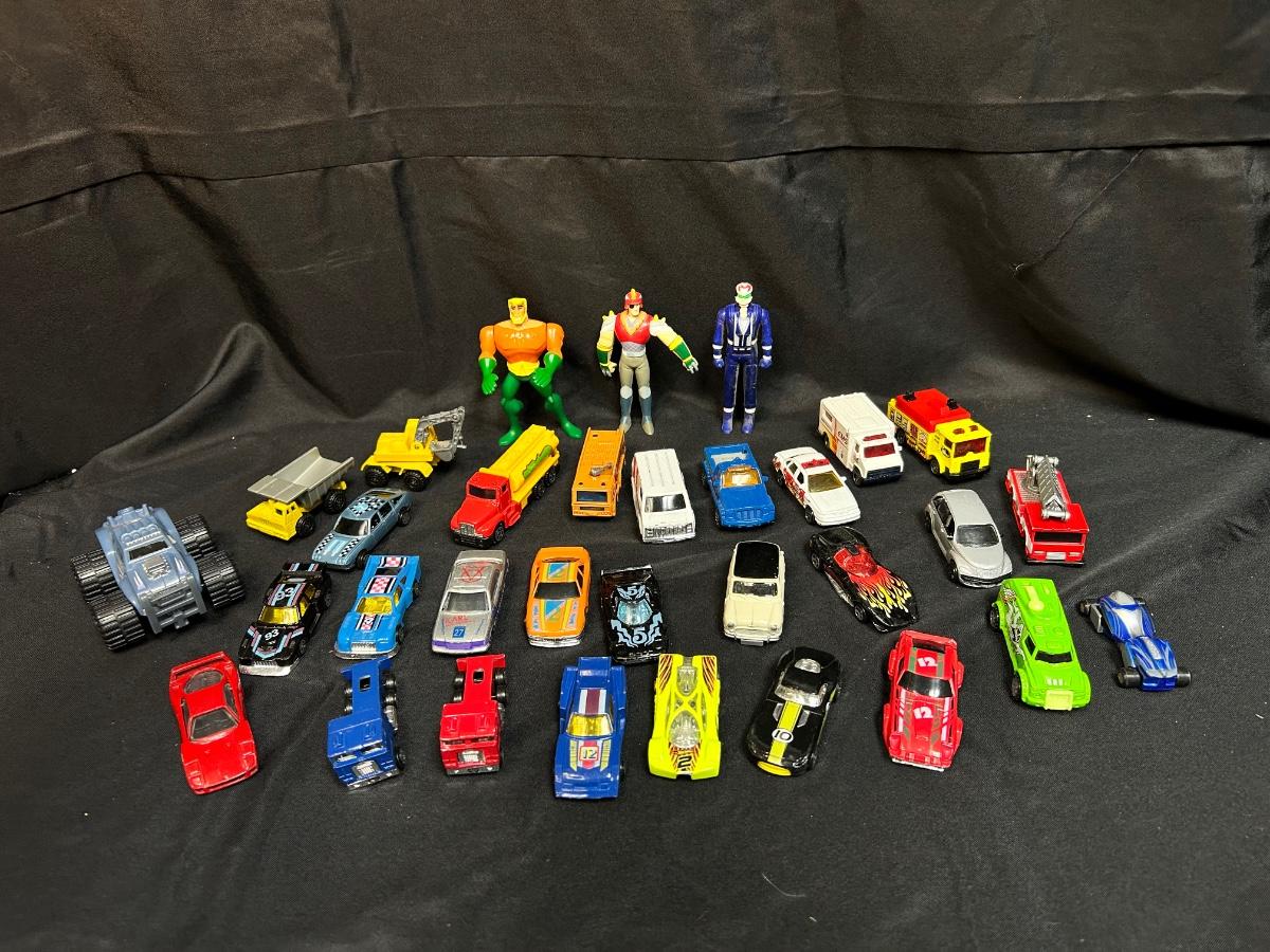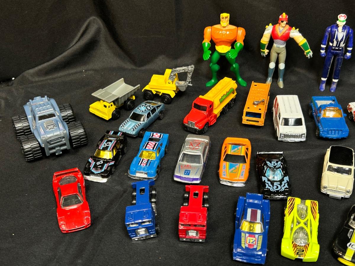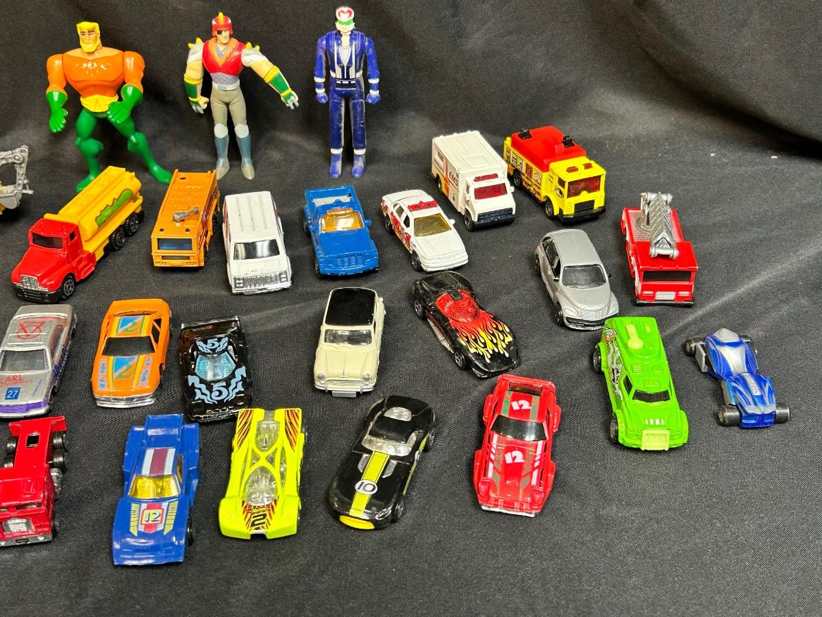 Mixed Lot of Die Cast Cars and Small Action Figure Kids Toys. Most of the cars are off brand or unbranded. In good played with condition.