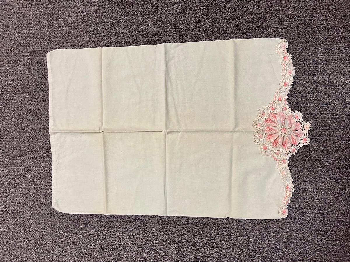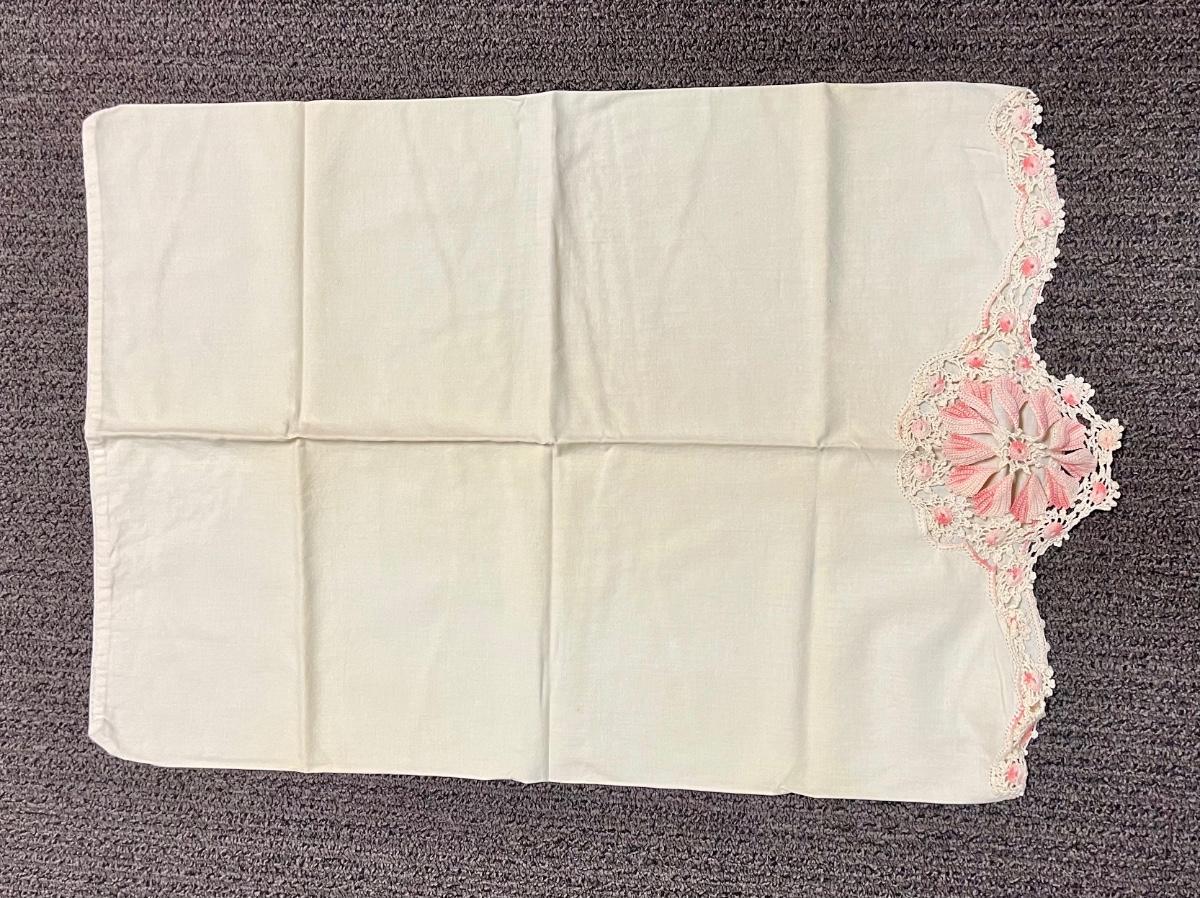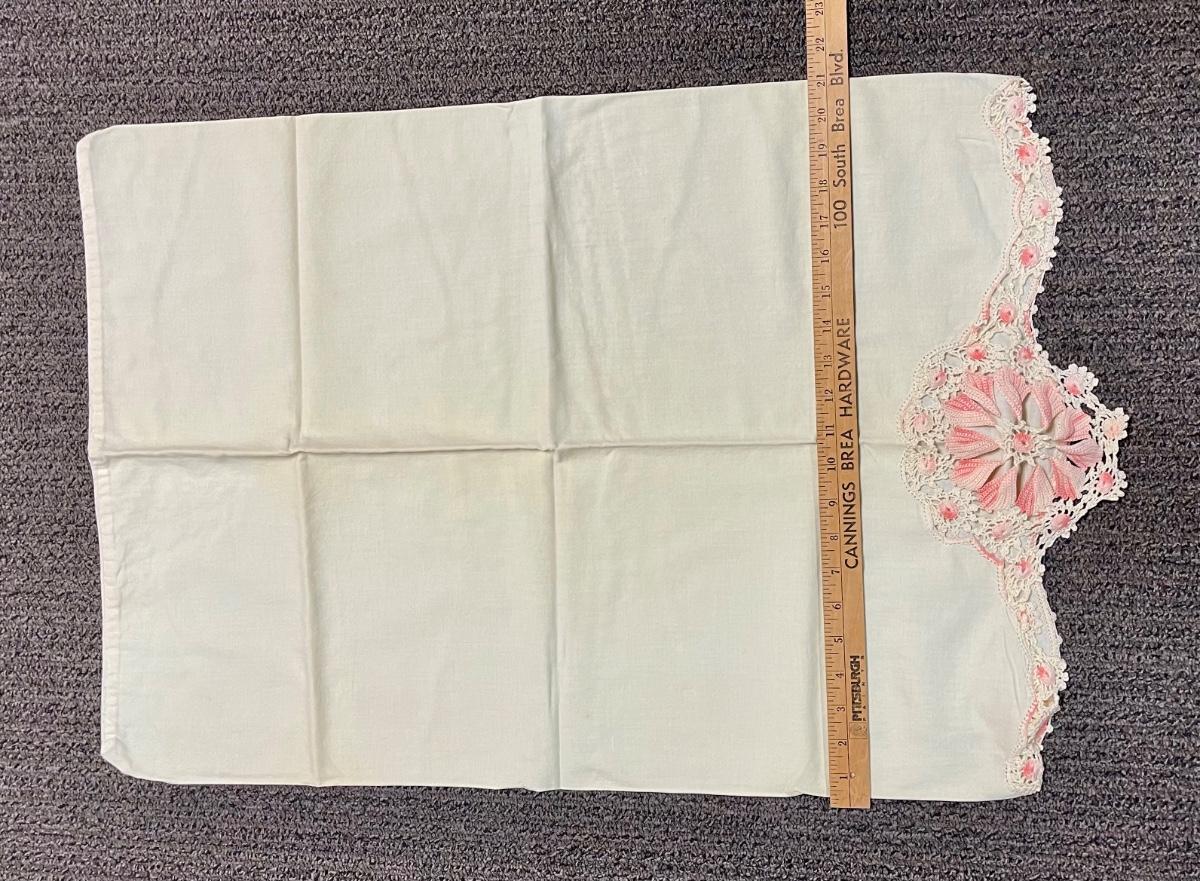 Vintage Pillow Case with Embroidered Pink and White Edge