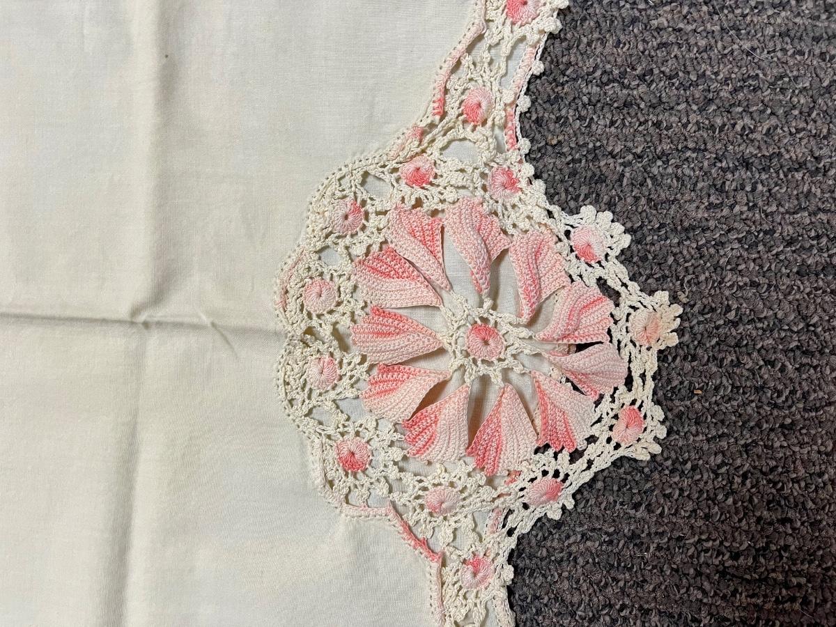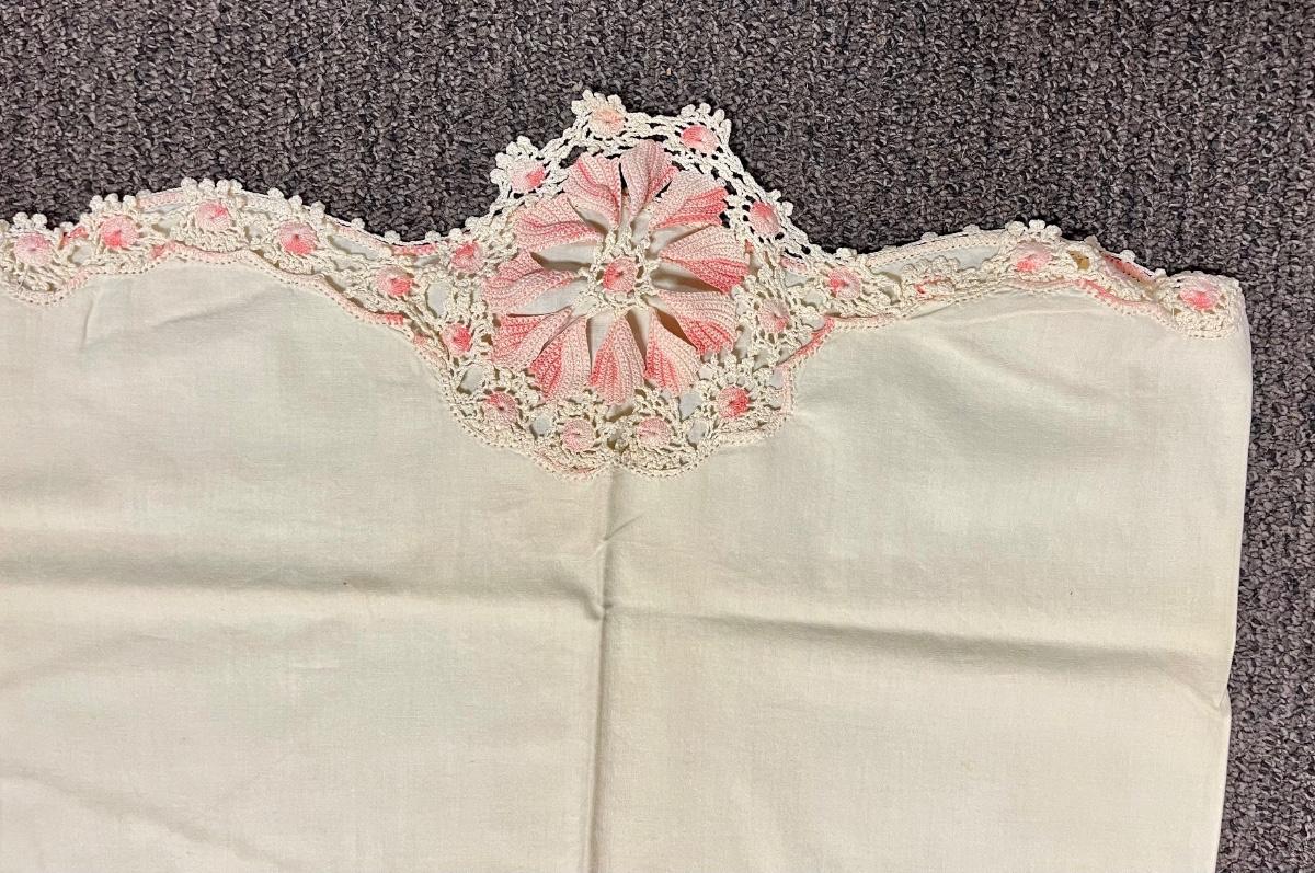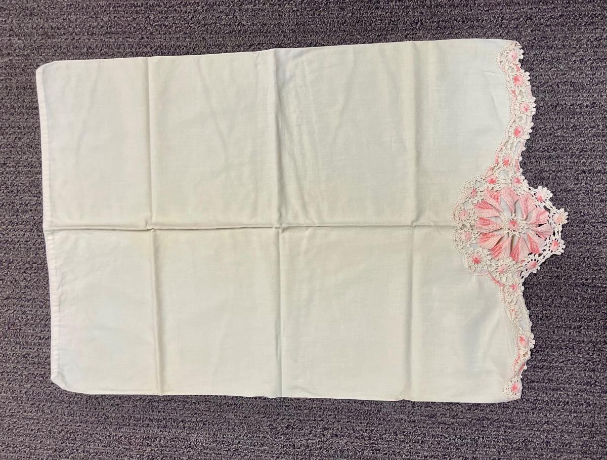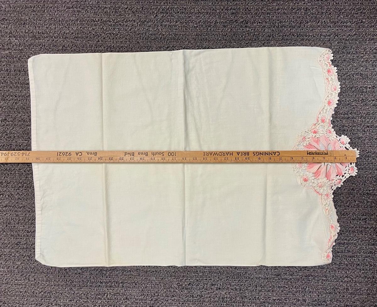 Vintage Pillow Case with Embroidered Pink and White Edge