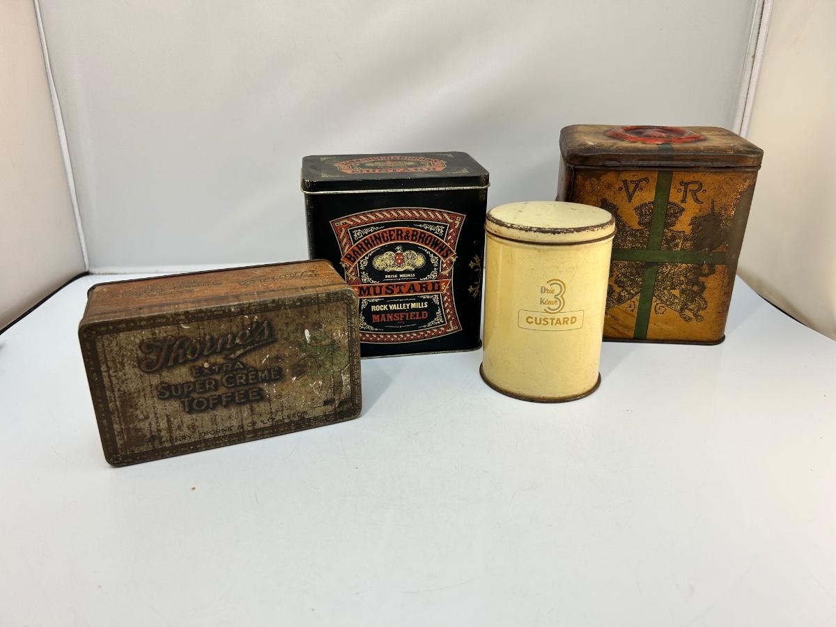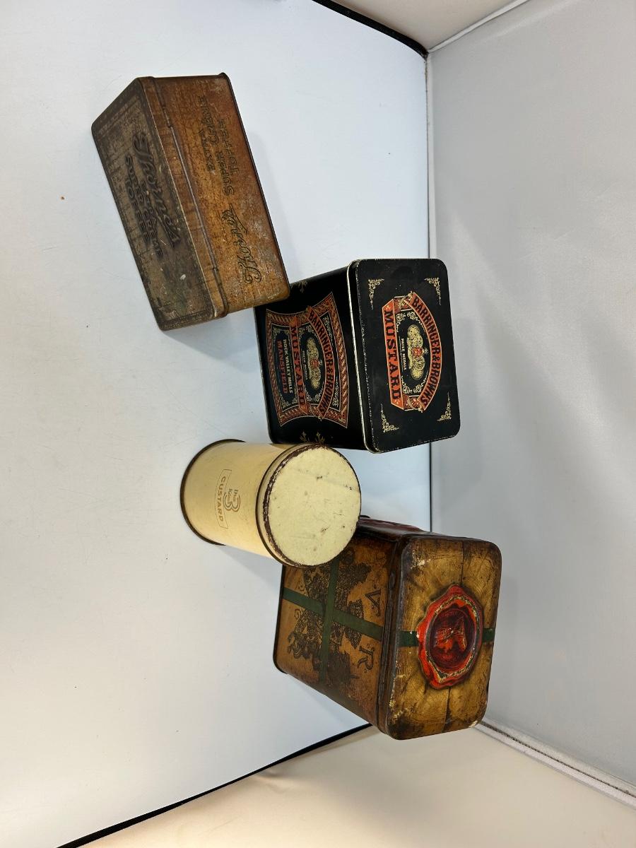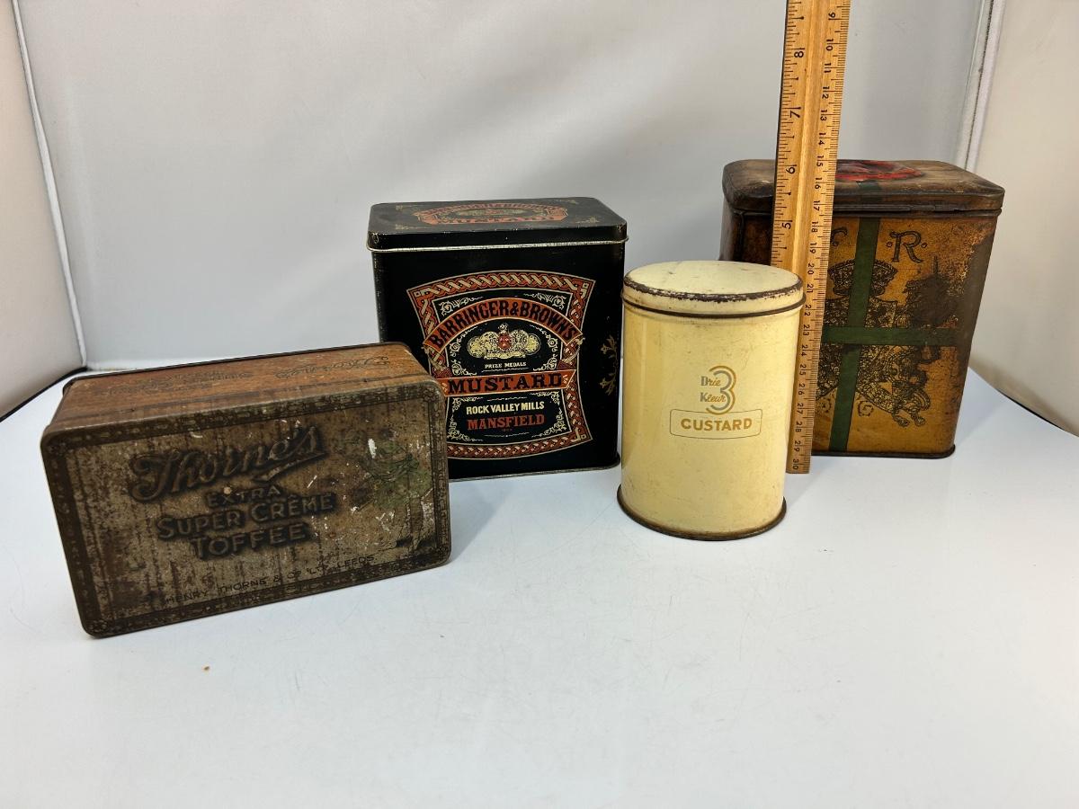 Lot of Four Mixed Variety of Vintage Food Spice Custard Tin Canister Boxes. In various states of condition, display nice.