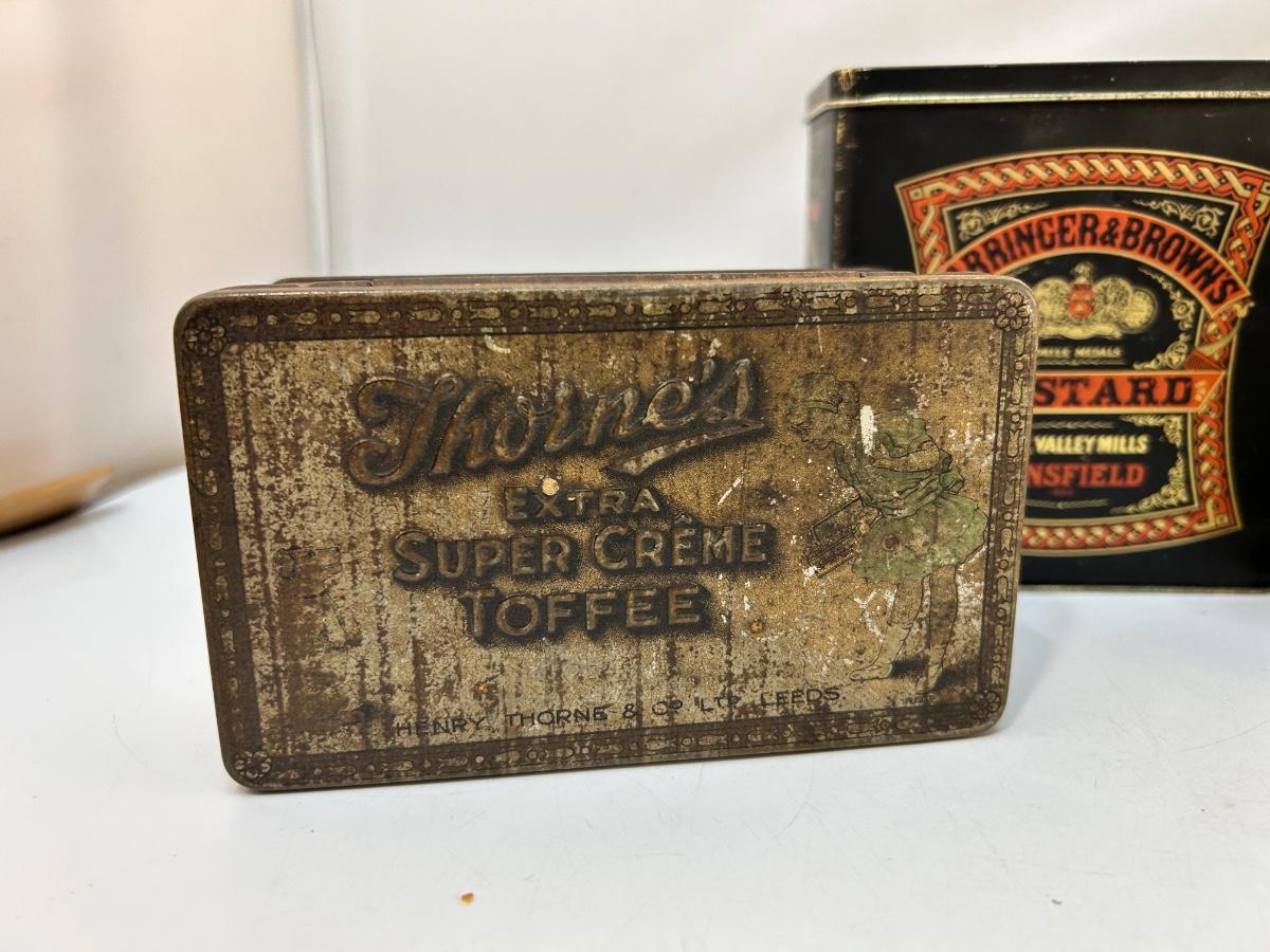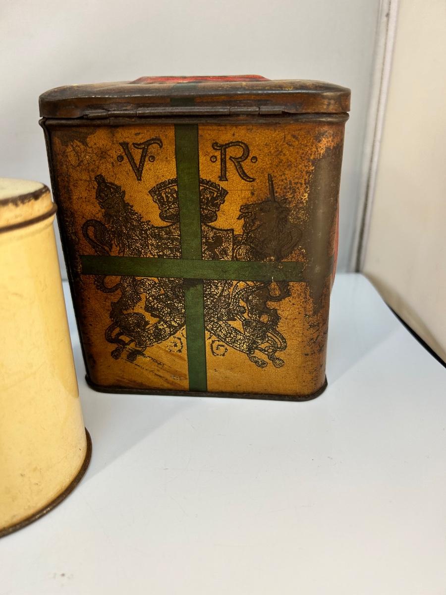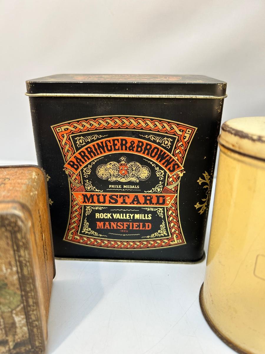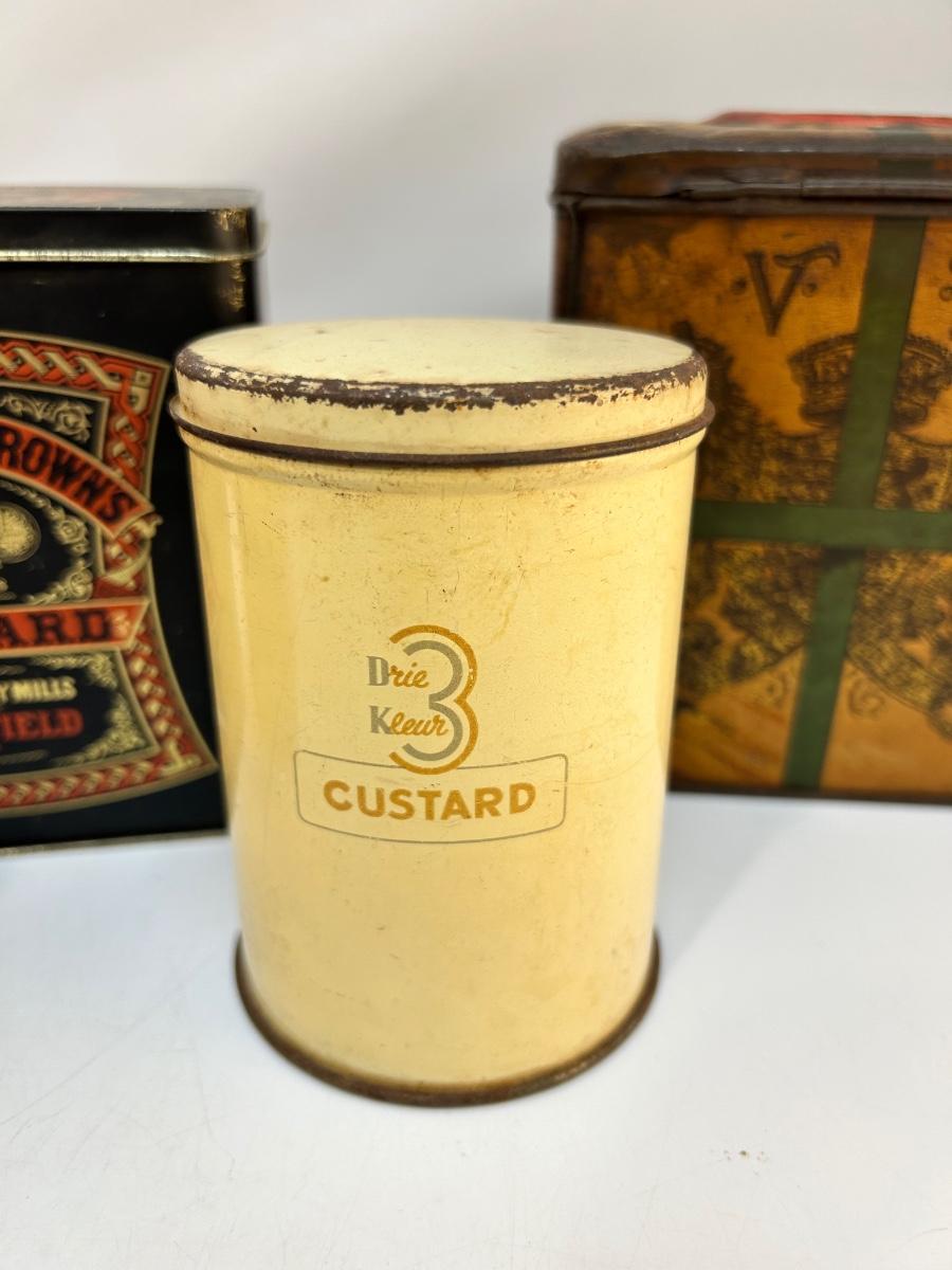 Lot of Four Mixed Variety of Vintage Food Spice Custard Tin Canister Boxes. In various states of condition, display nice.