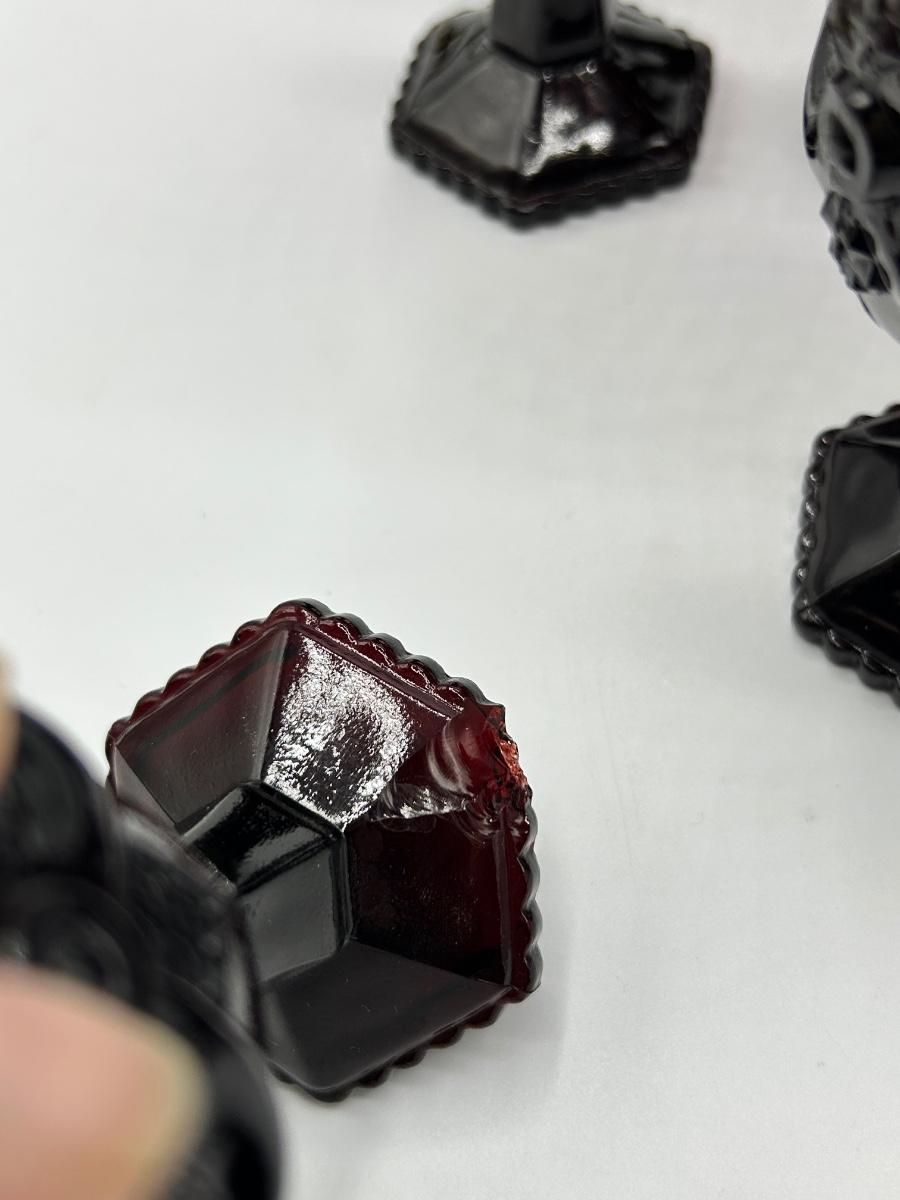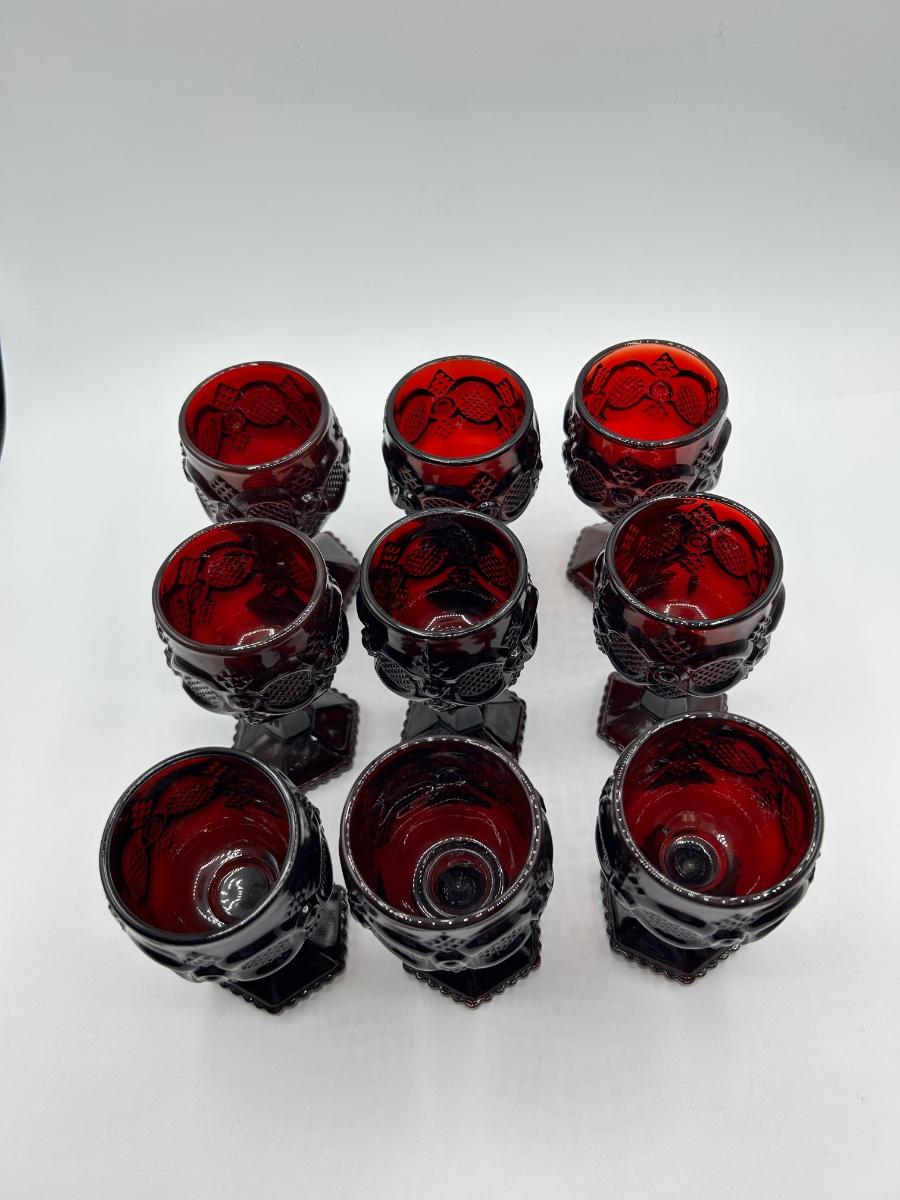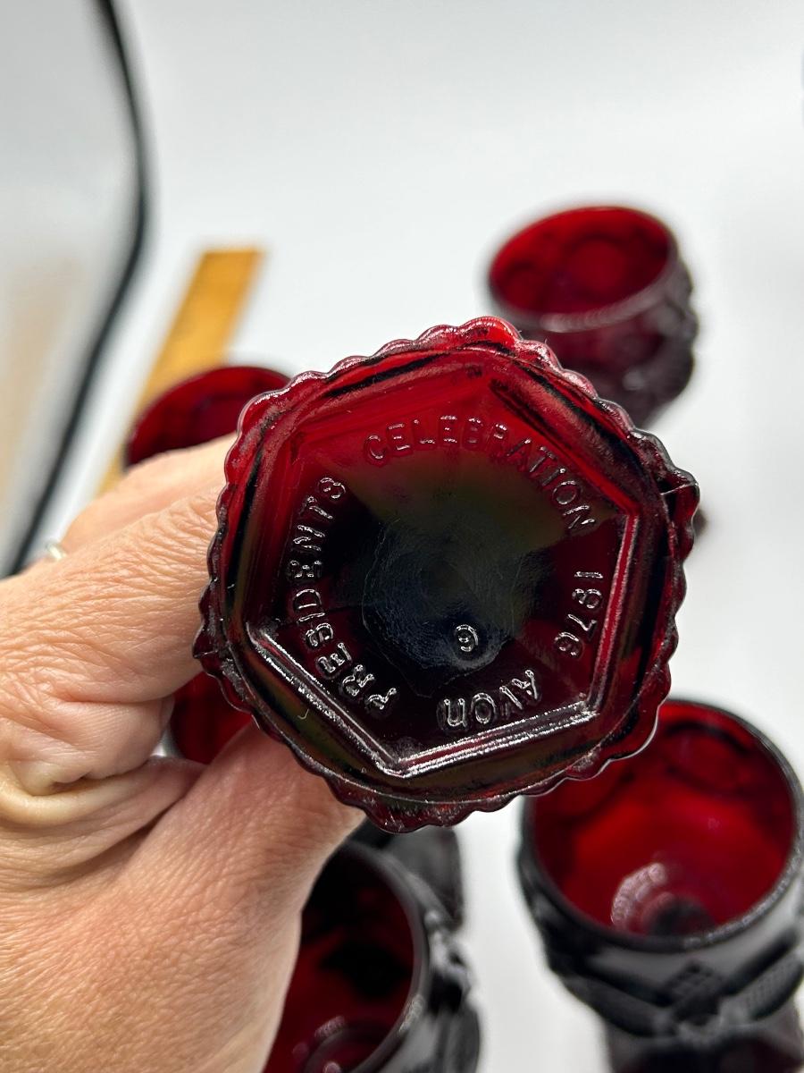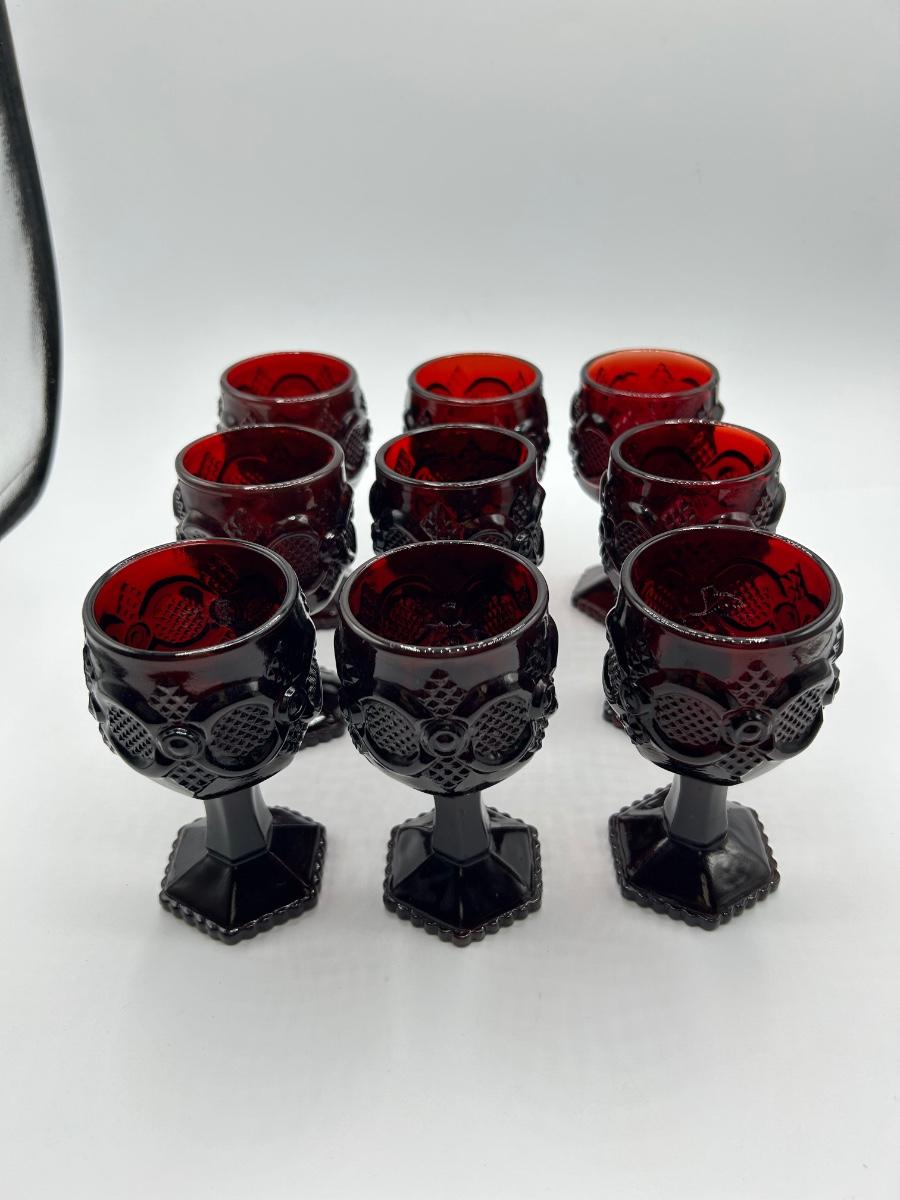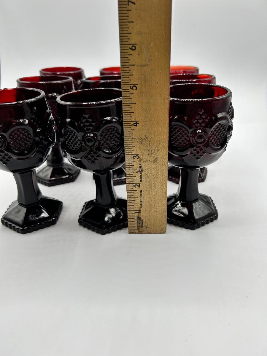 Vintage Ruby Red Pressed Glass 1876 Cape Cod Small Goblet Cordial Stemware AVON 1970s. Beautiful red glass. There is a small chip or two along the bottom of a couple glasses. About 5" size. Marked Avon on bottom side, marks vary from years released but all are from the 1970s. Display great.