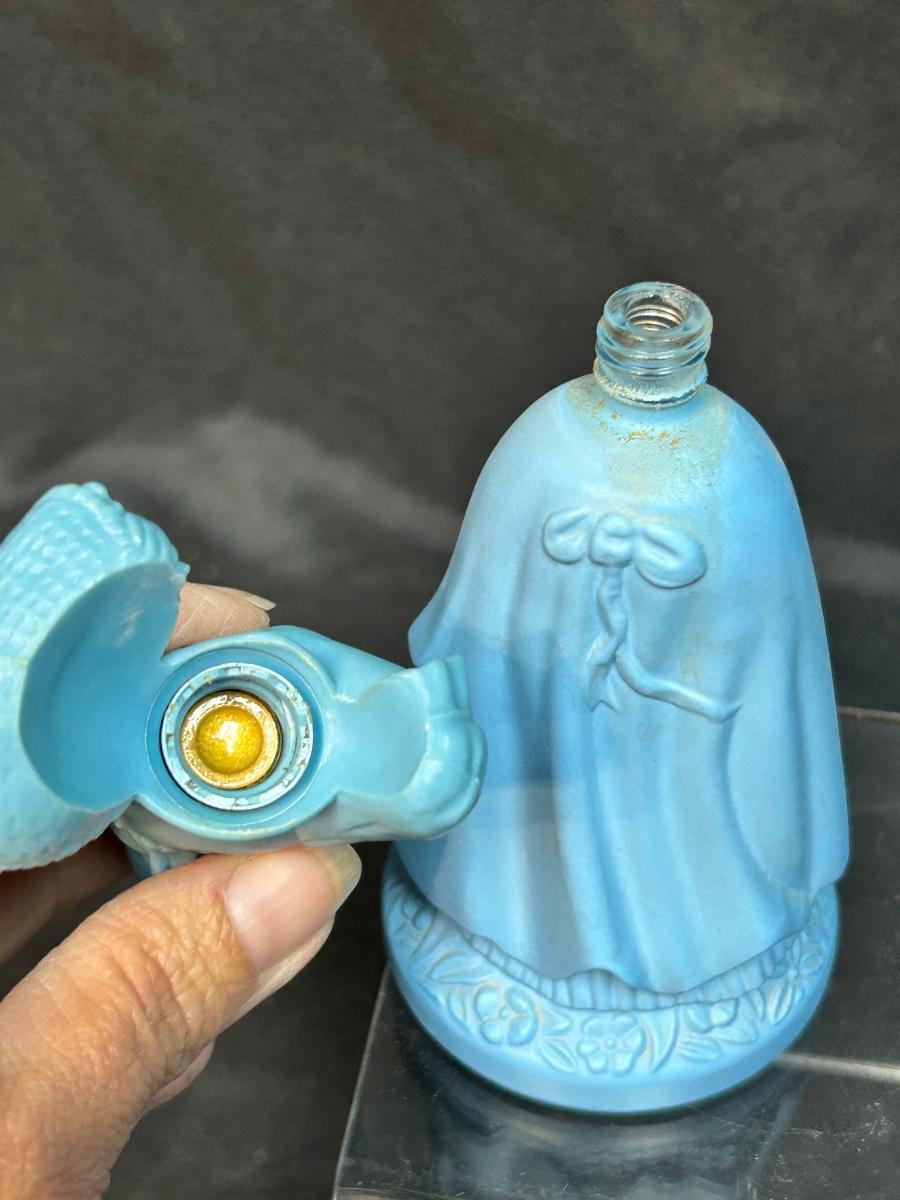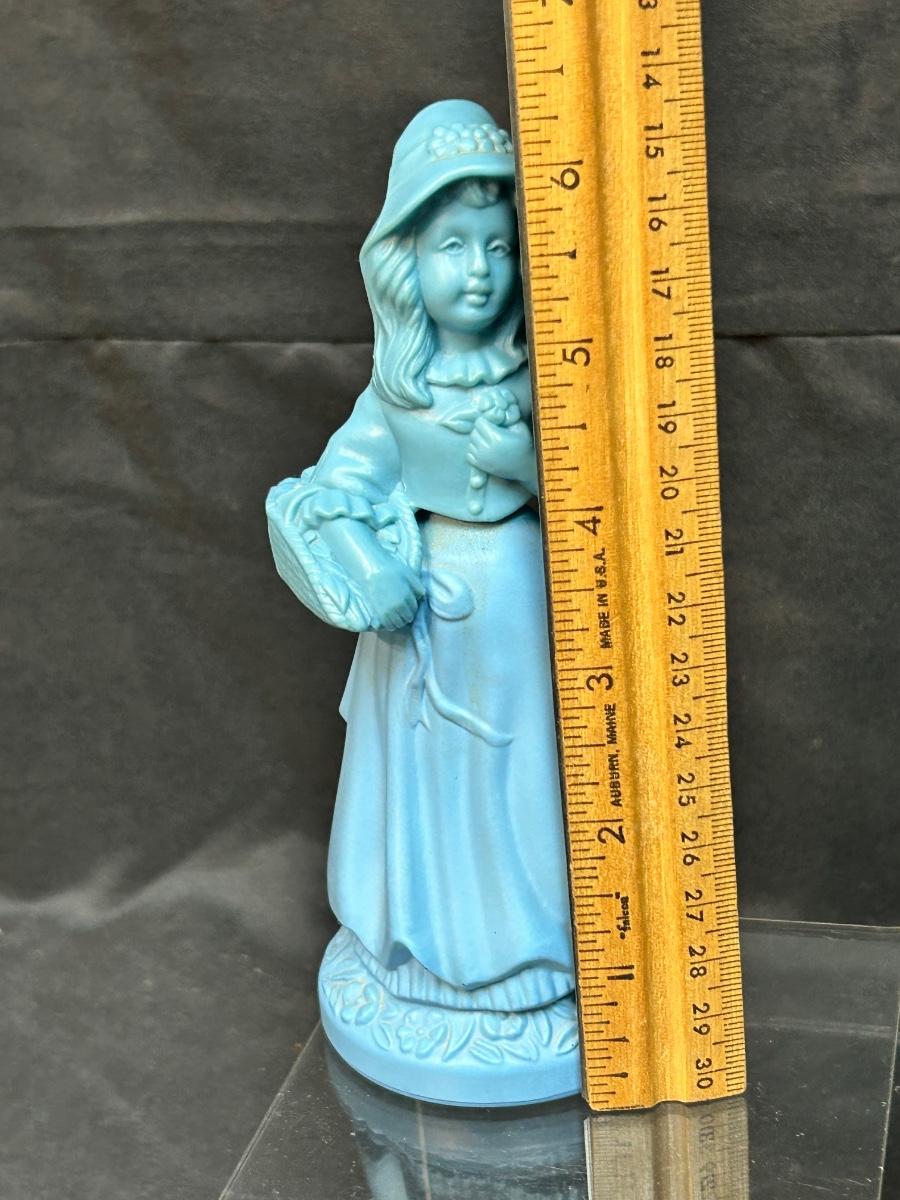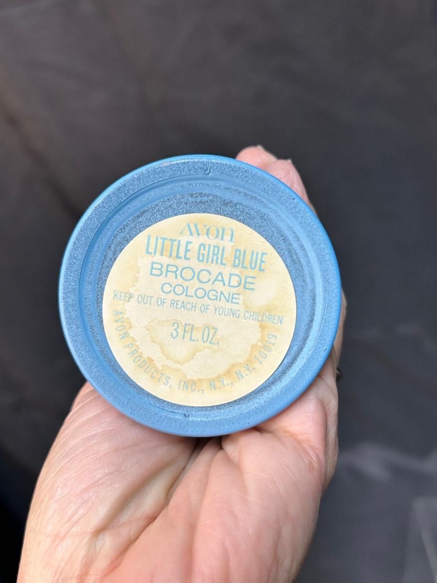 Vintage AVON Little Girl Blue Brocade Cologne Figurine Bottle Partially Full. In vintage condition. The plastic top has discolored slightly from the lower glass part. Has cologne in bottle.