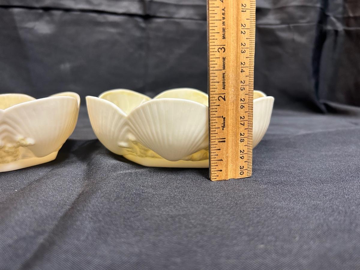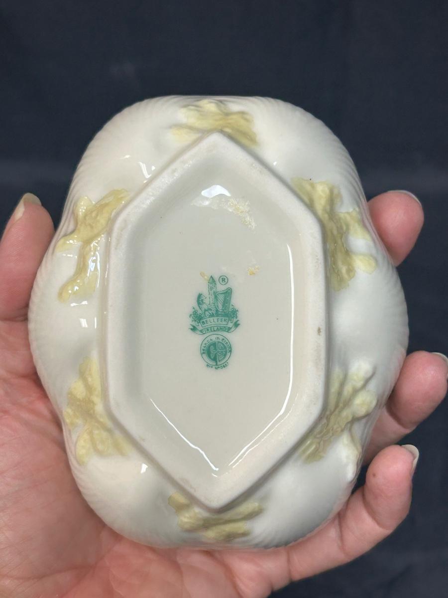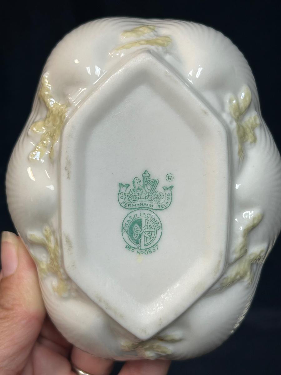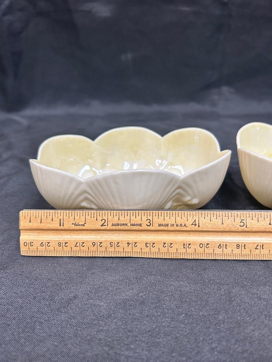 Pair of Vintage Belleek Neptune Scallop Shell Oval Sugar Candy Nut Bowls. In excellent vintage condition. Scallop she’ll design with yellow finish. Green stamp on bottom. About 5” size.