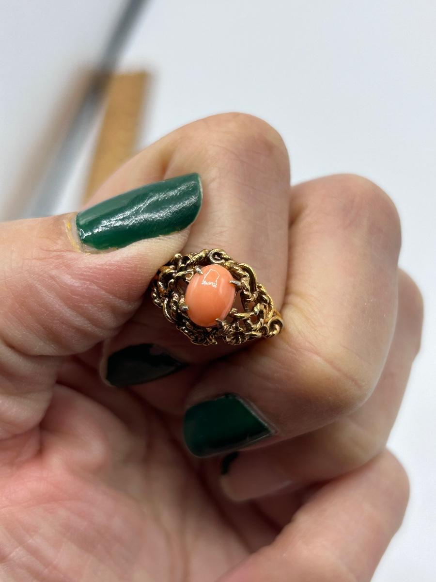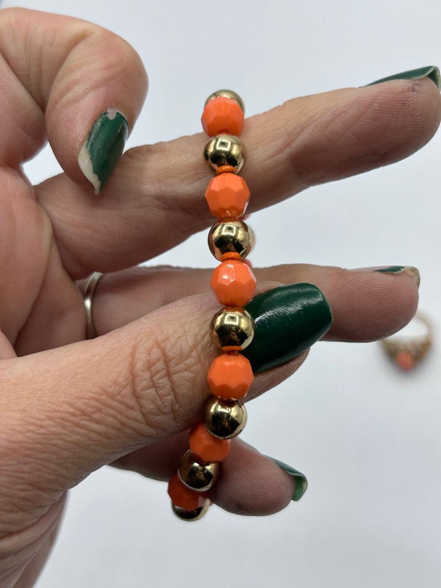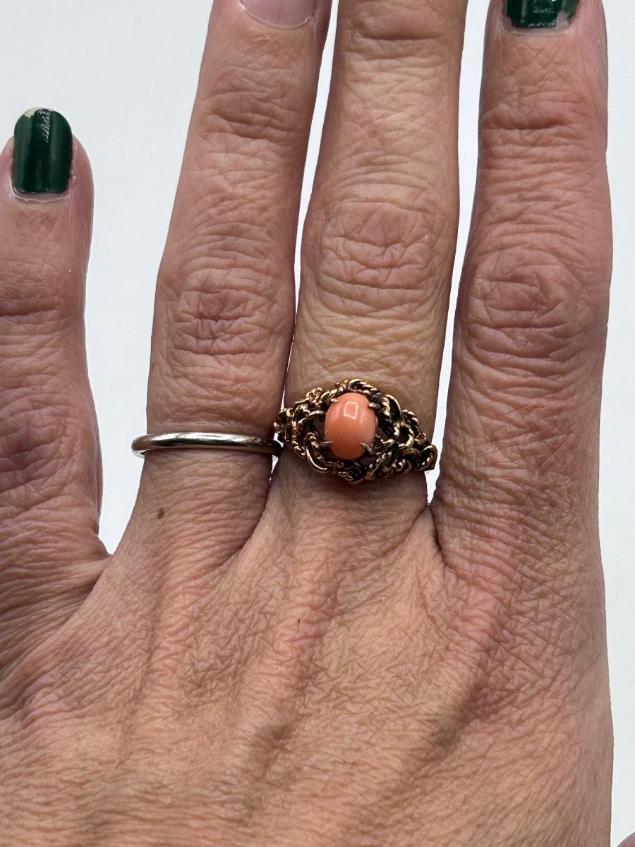 Three Piece Gold Tone and Coral Colored Jewelry Lot Ring Stretch Bracelet Earrings. In good previously worn condition. Ring is about a size 7.