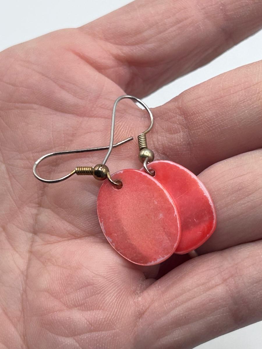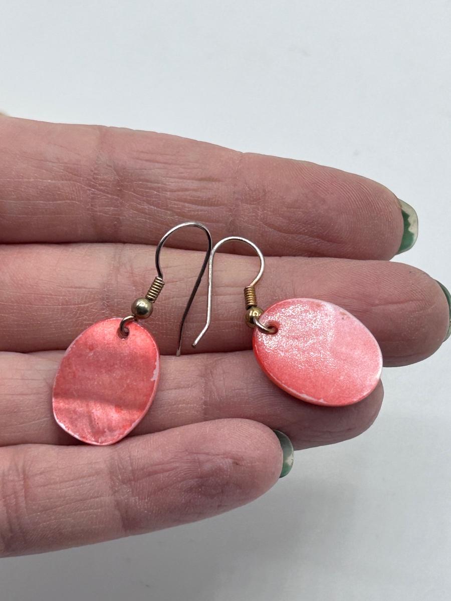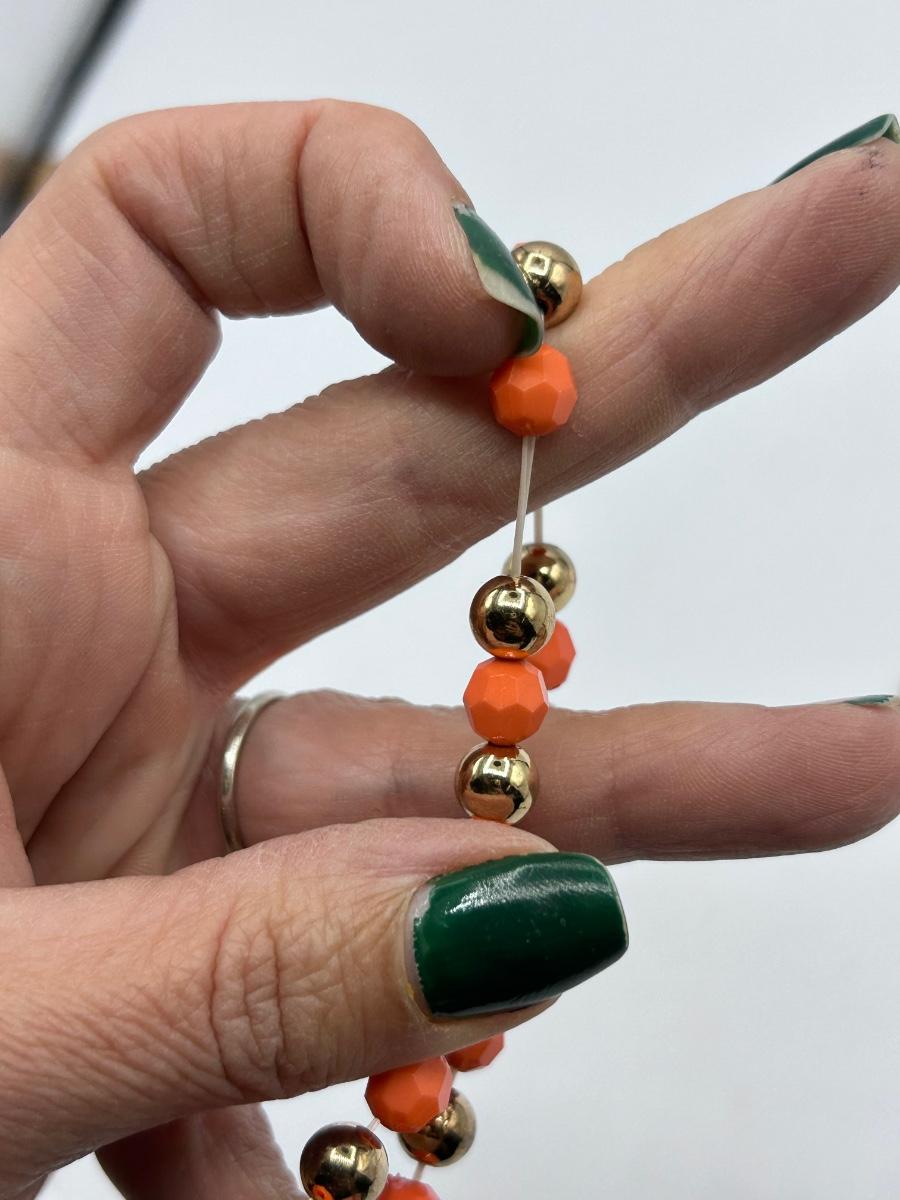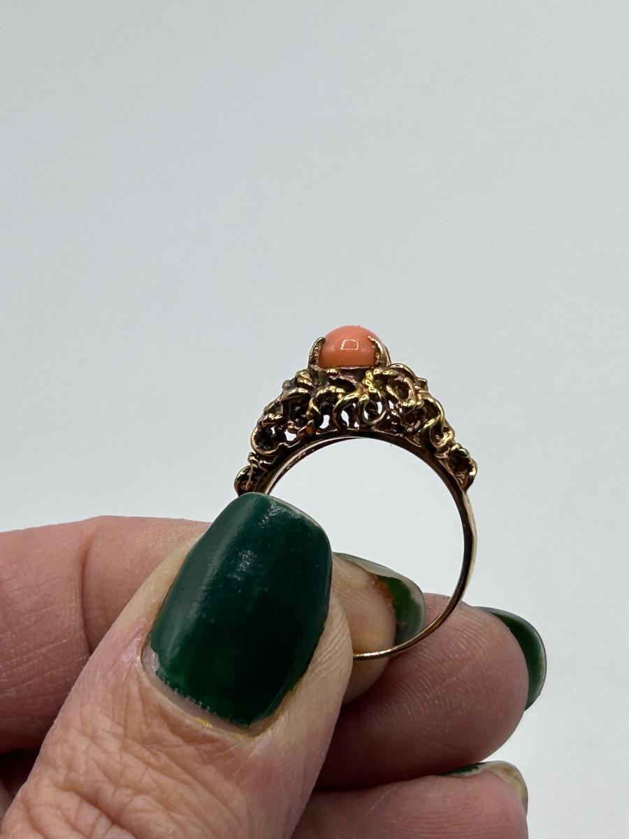 Three Piece Gold Tone and Coral Colored Jewelry Lot Ring Stretch Bracelet Earrings. In good previously worn condition. Ring is about a size 7.