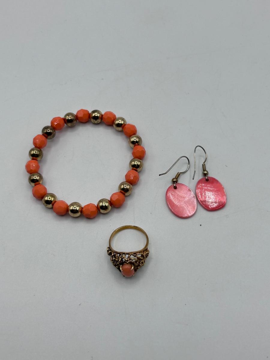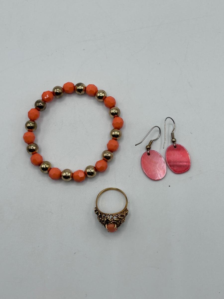 Three Piece Gold Tone and Coral Colored Jewelry Lot Ring Stretch Bracelet Earrings