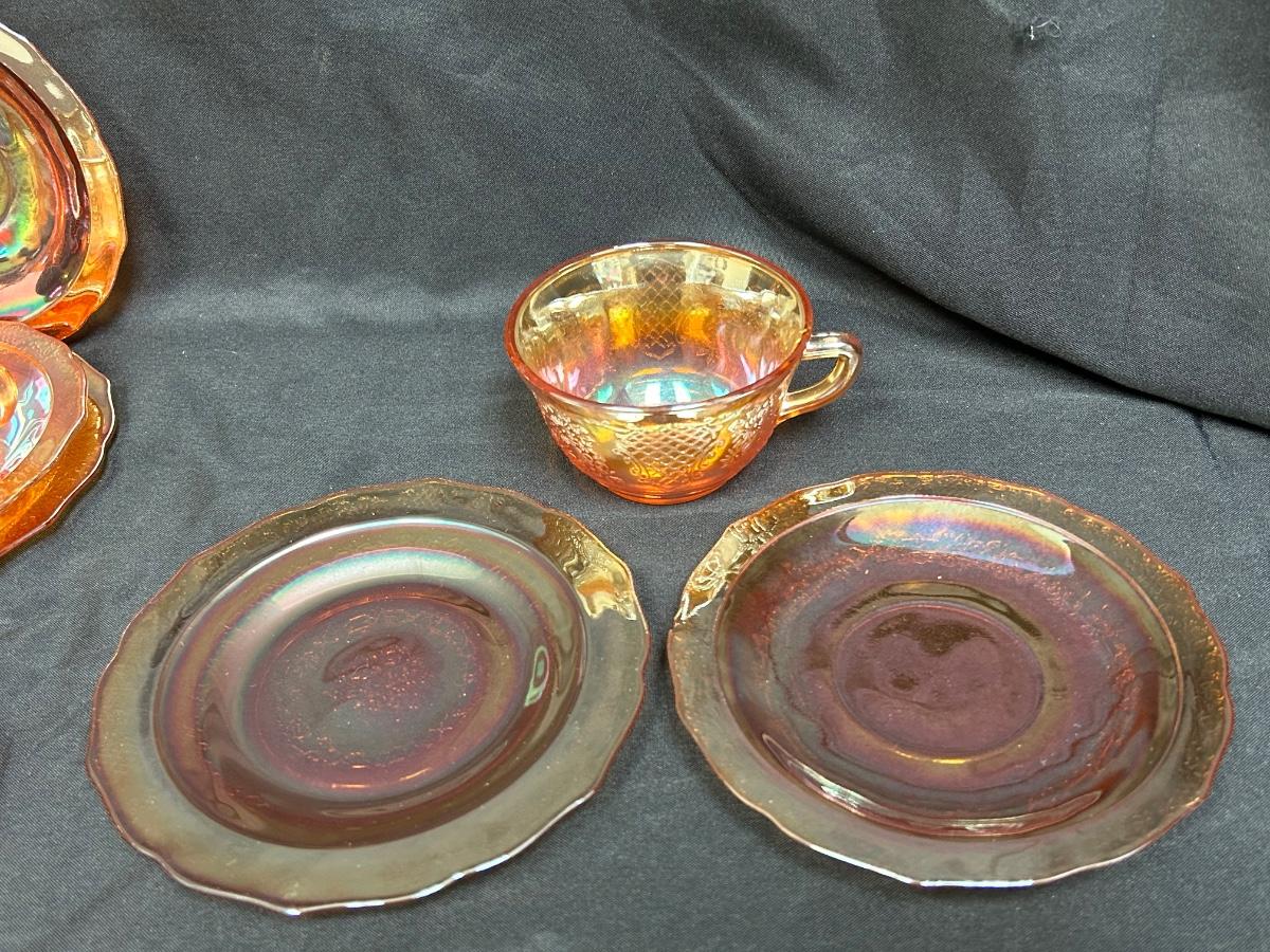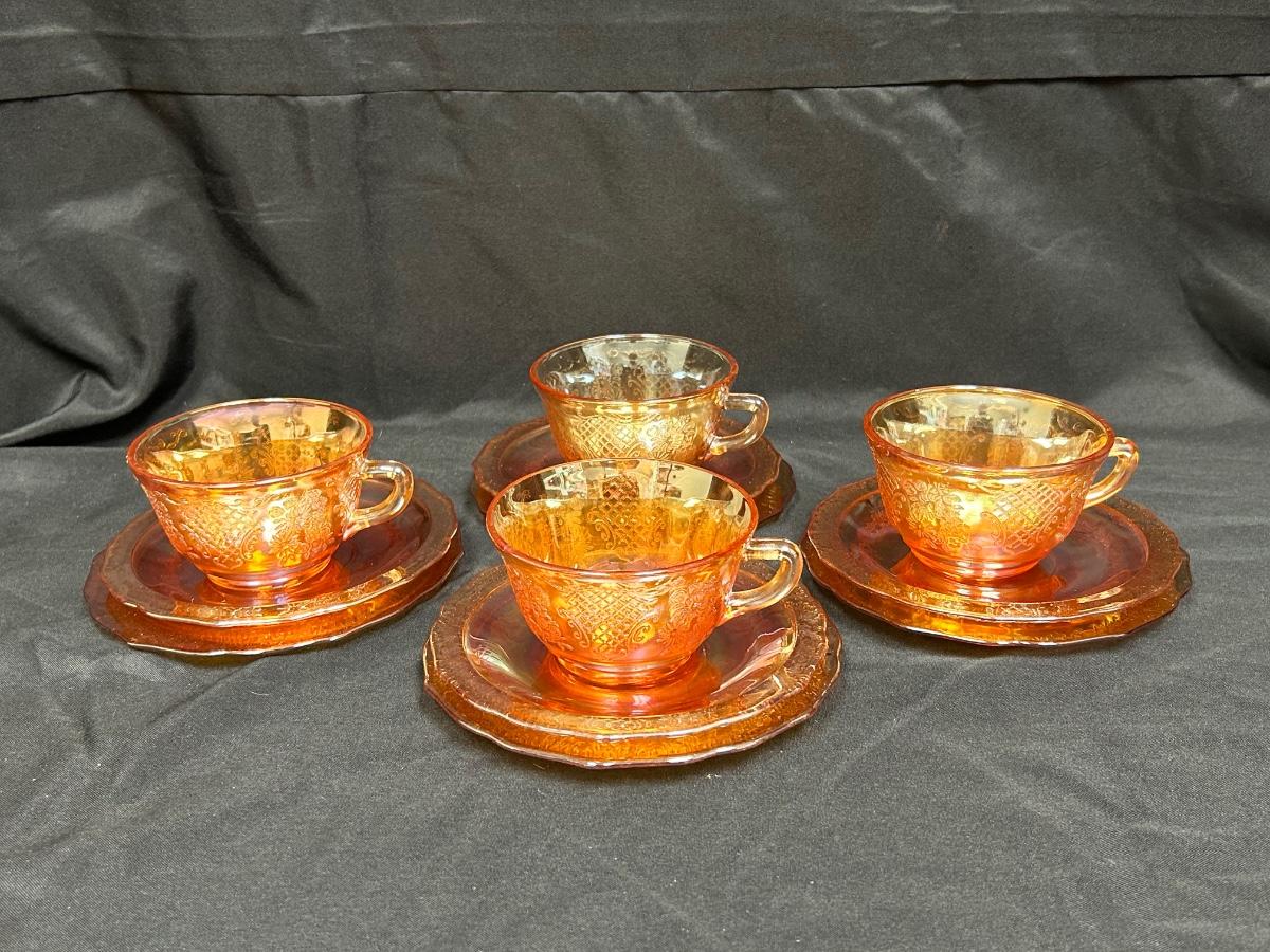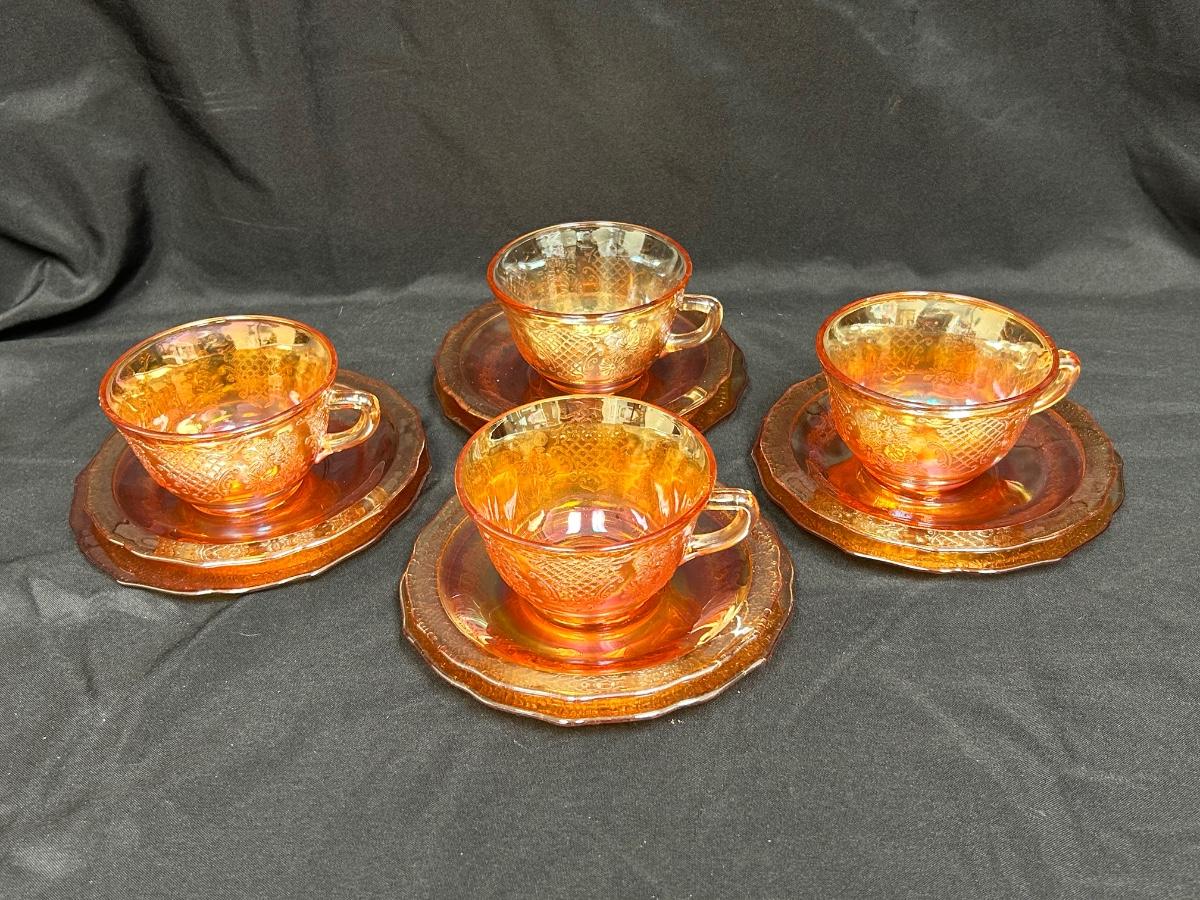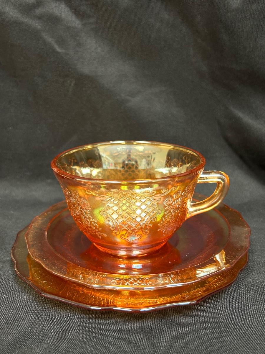 Vintage Normandie by Federal Glass Marigold Carnival Iridescent Teacup and Saucer Set. Set of 4, each setting is three pieces, a teacup, saucer, and a dessert plate. In good condition. No chips.