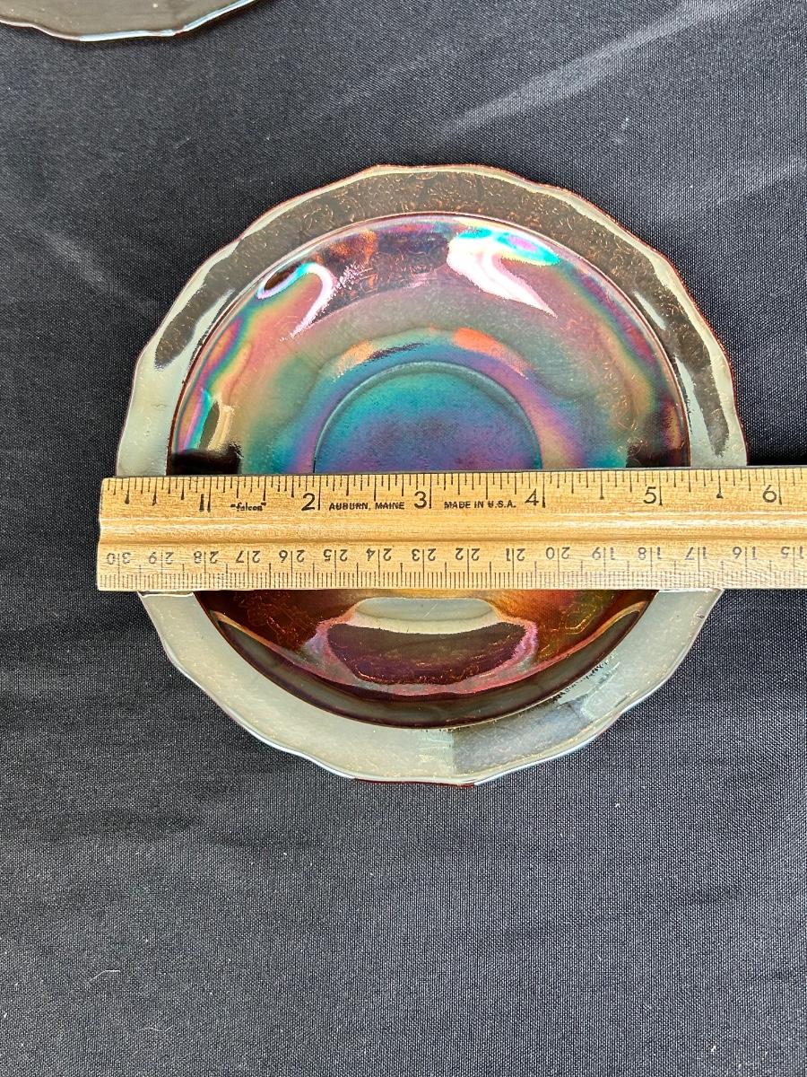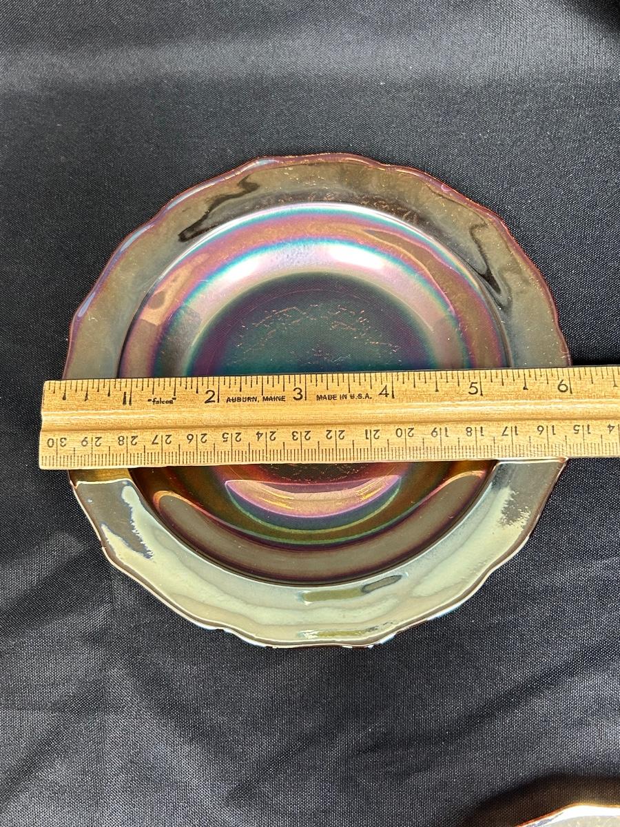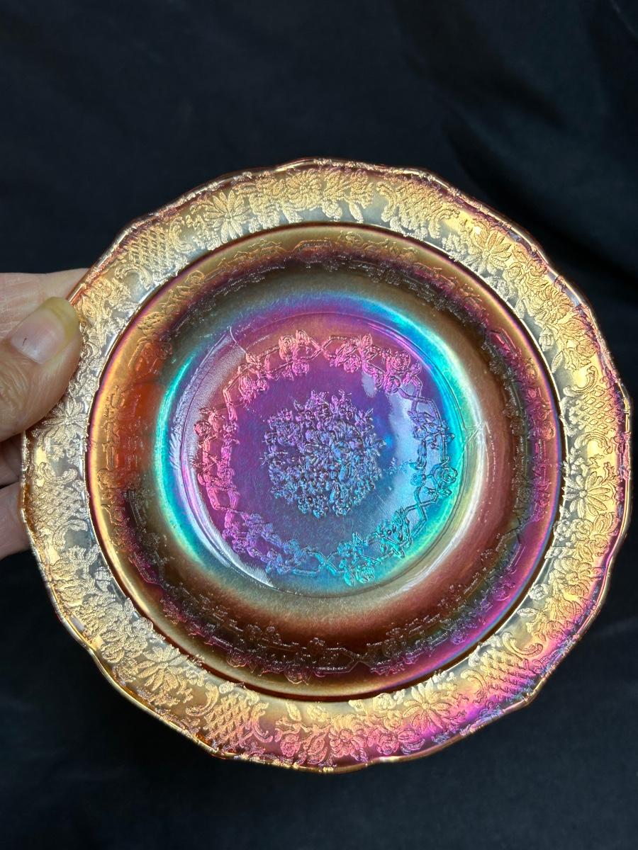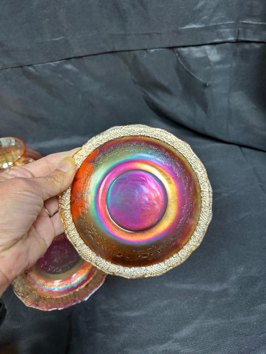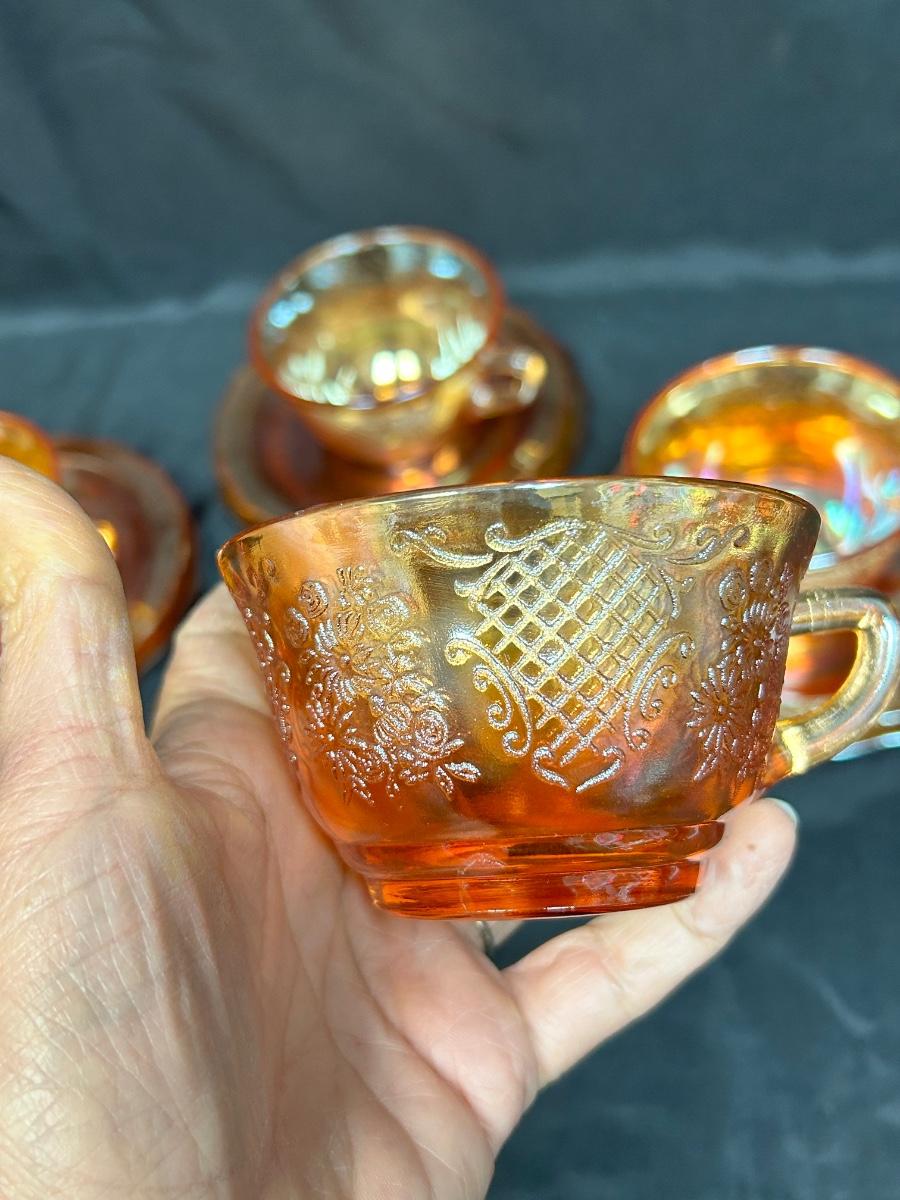 Vintage Normandie by Federal Glass Marigold Carnival Iridescent Teacup and Saucer Set. Set of 4, each setting is three pieces, a teacup, saucer, and a dessert plate. In good condition. No chips.