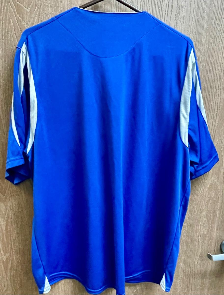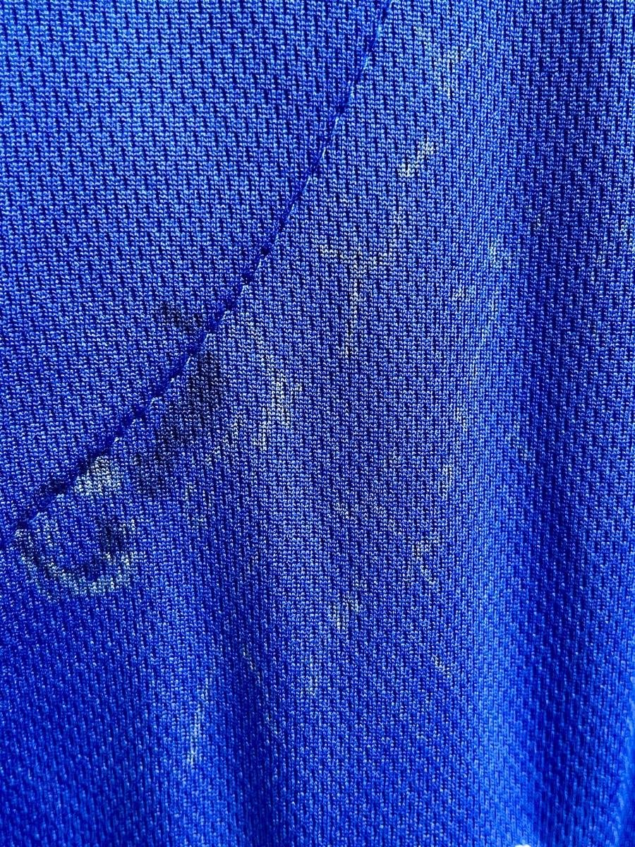 In good condition, but there is an area near collar in the front where it looks like someone wrote on it and the it faded after washing. No name or number on jersey.