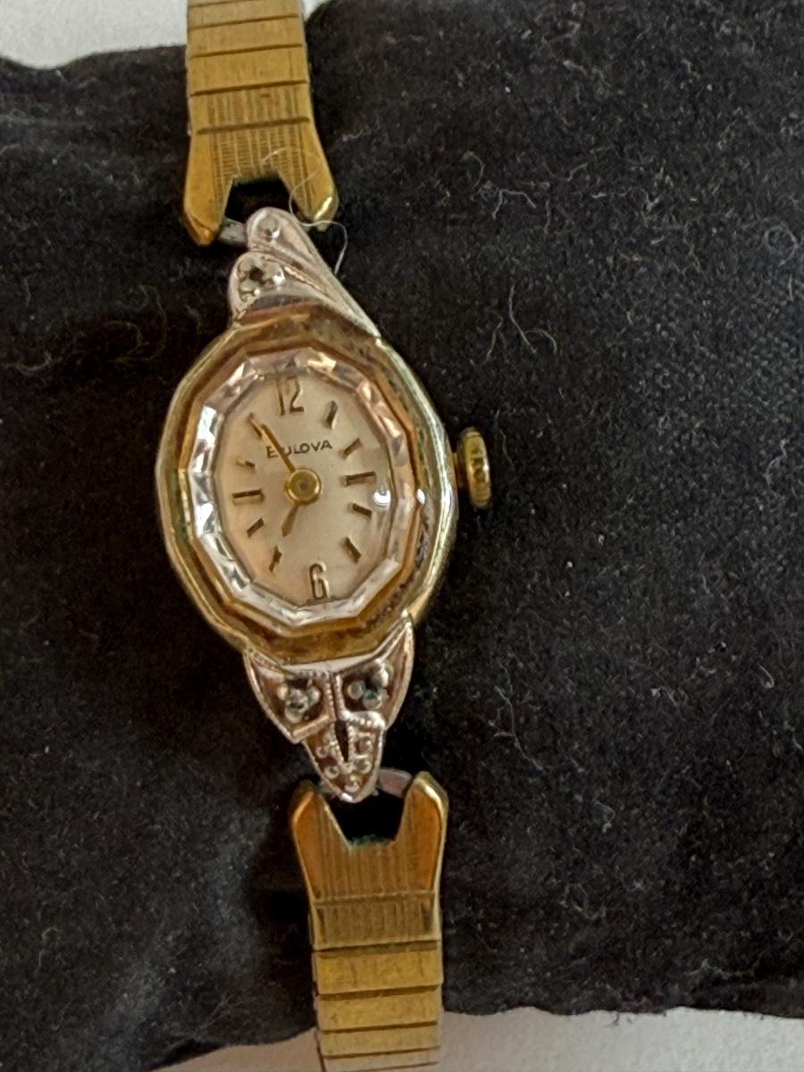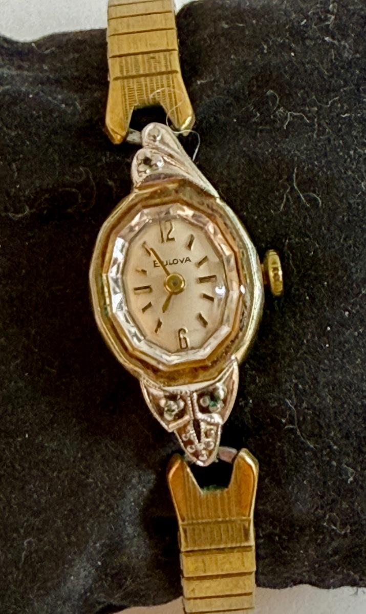 10K Rolled Gold Plate case and a stretch band. Manual-wind watch, hands can be adjusted and appears to be running.