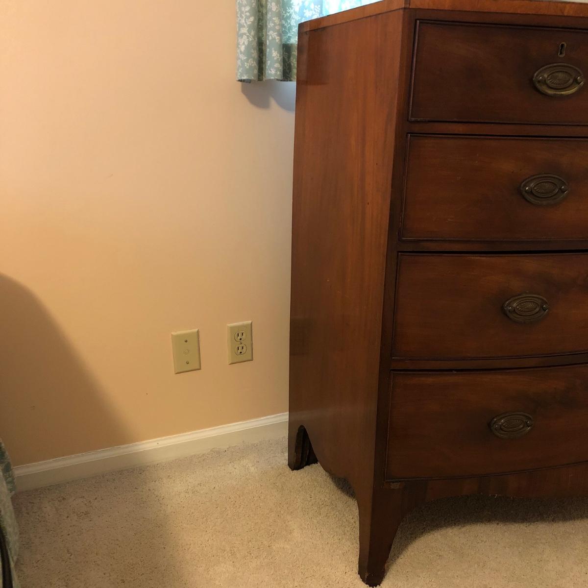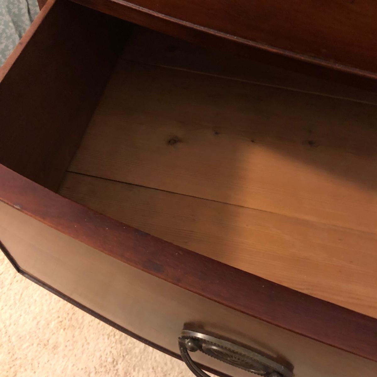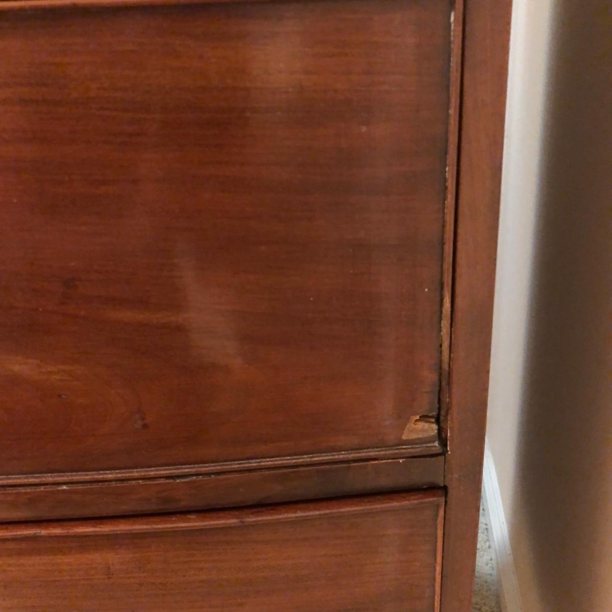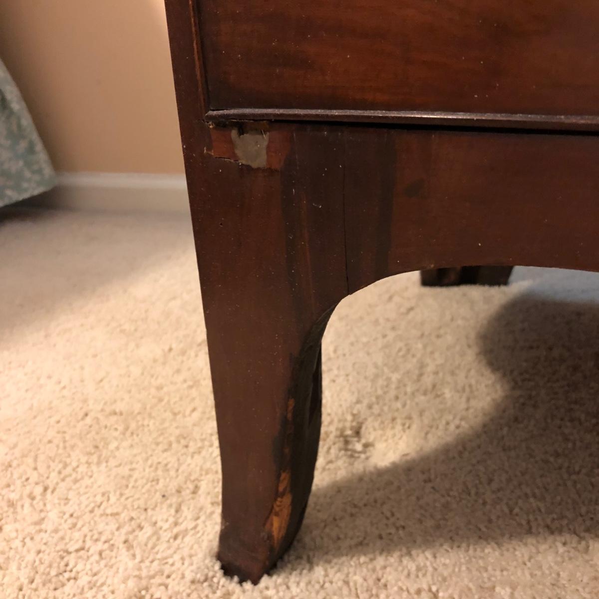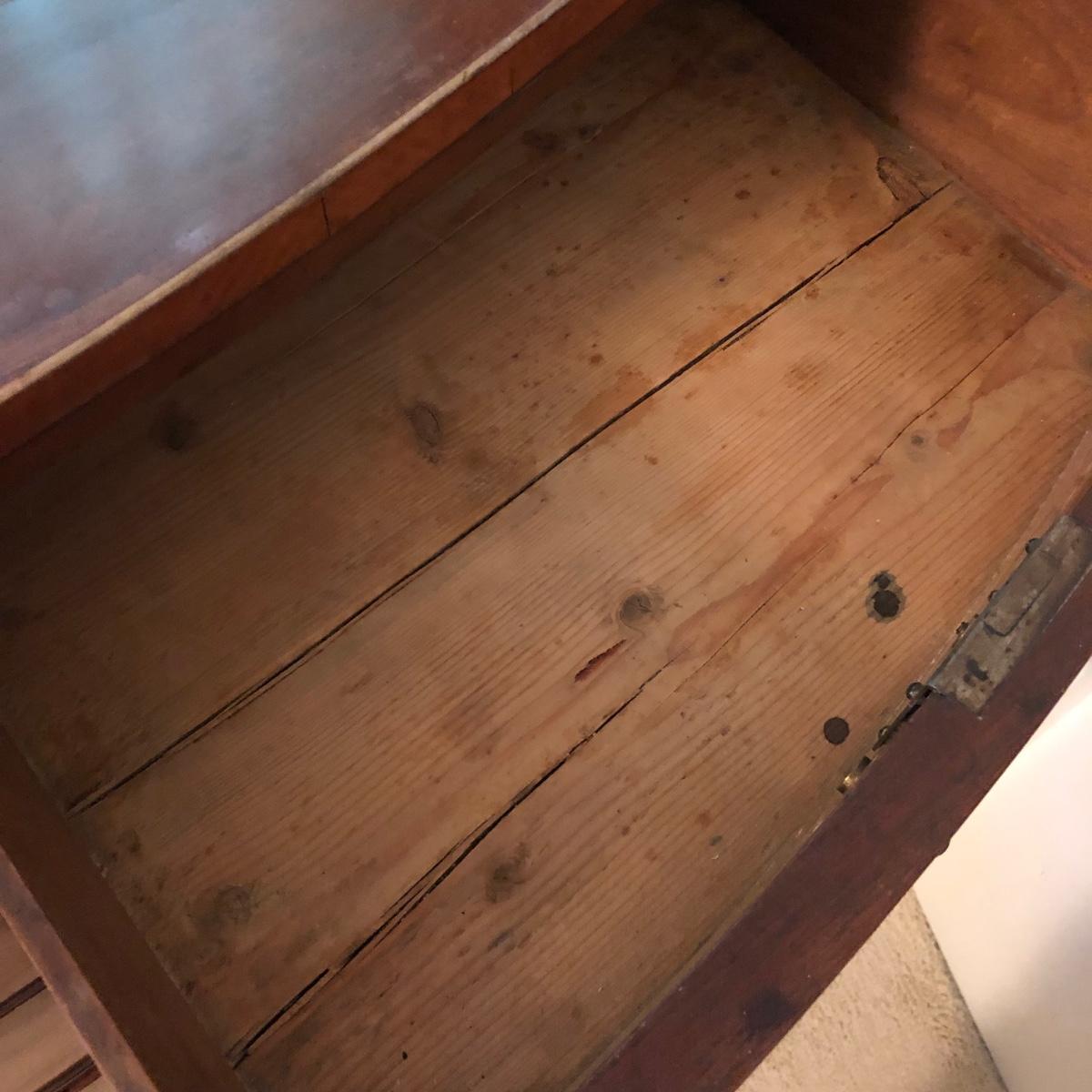 This solid wood antique dresser has 5 drawers with brass drawer pulls. The drawers are dovetailed and easily pull in and out. It measures 3’ 4.5” x 1’ 9.75” x 3’ 7”. Each drawer has an antique style key hole and mechanism, though the keys are not included. The veneer wood of the top of the dresser has a crack in it, as do the bases of some of the drawers with signs of repair work, as pictured. There is some damage to the right side 2nd and 3rd drawers up from the base as pictured. Local pickup only. This dresser is heavy, so make plans to bring help to load it.