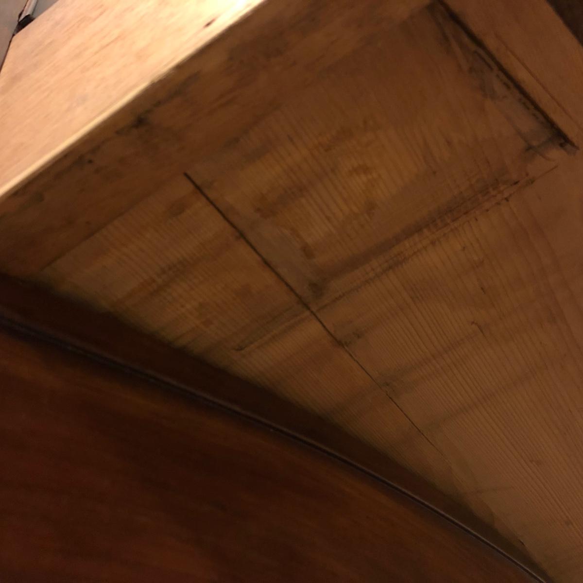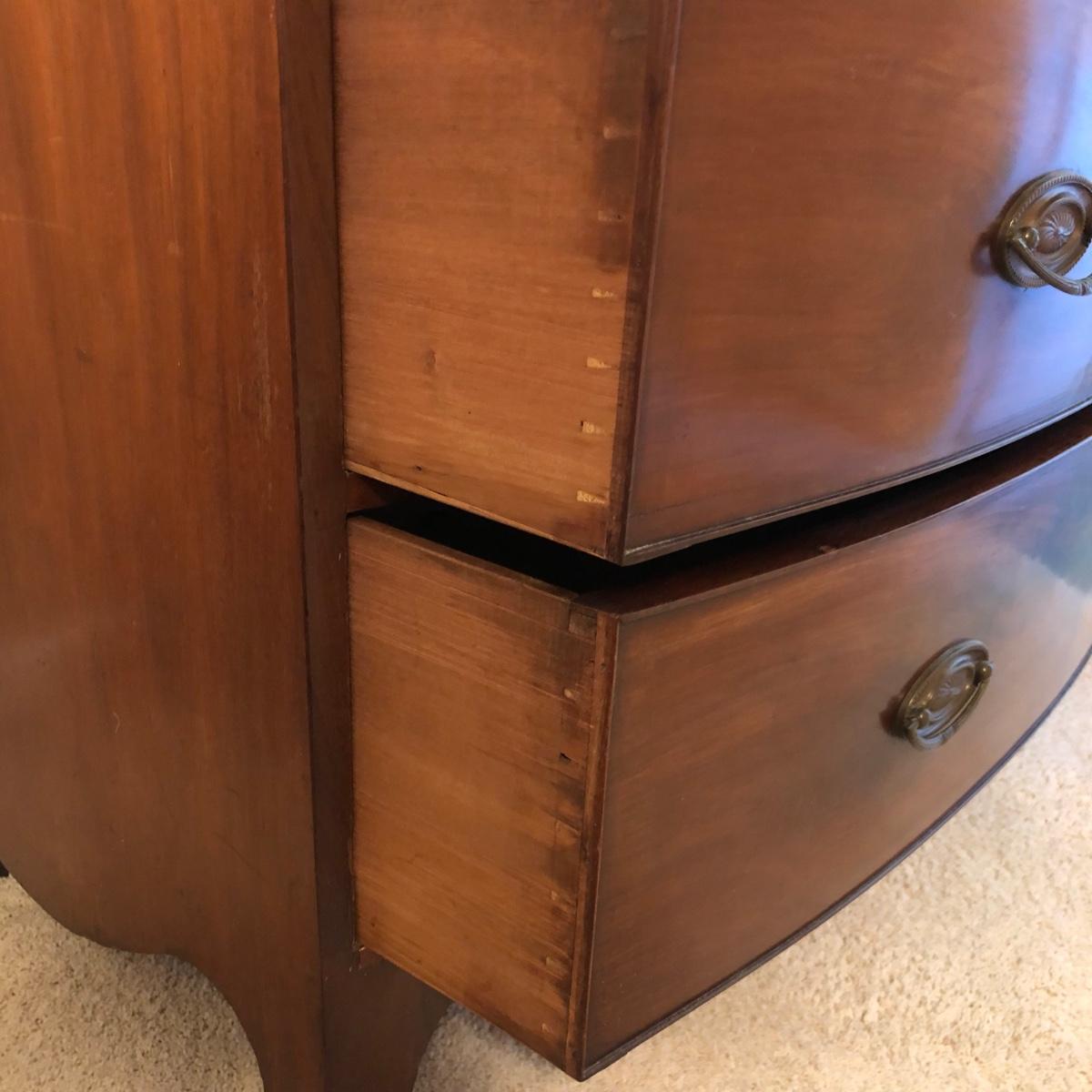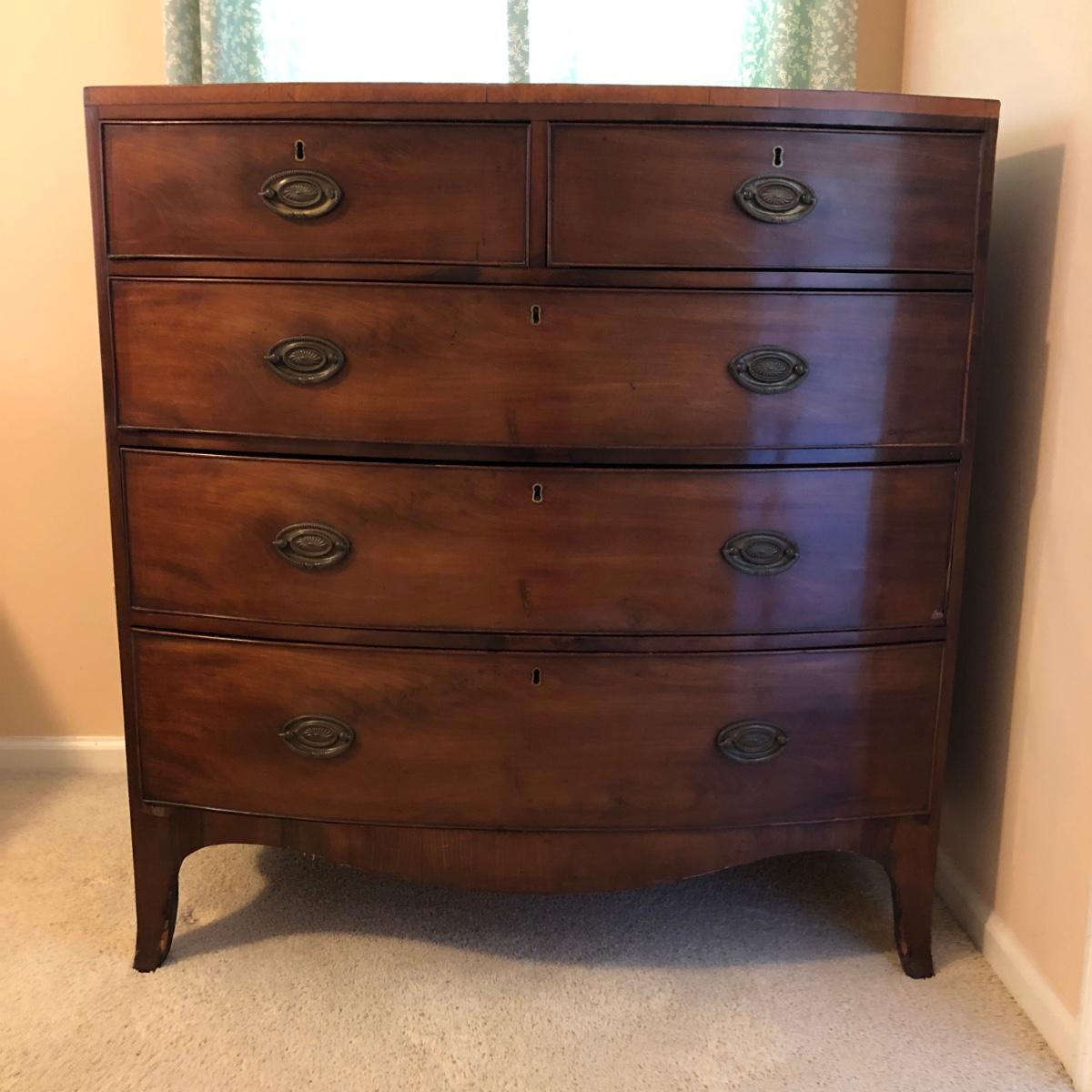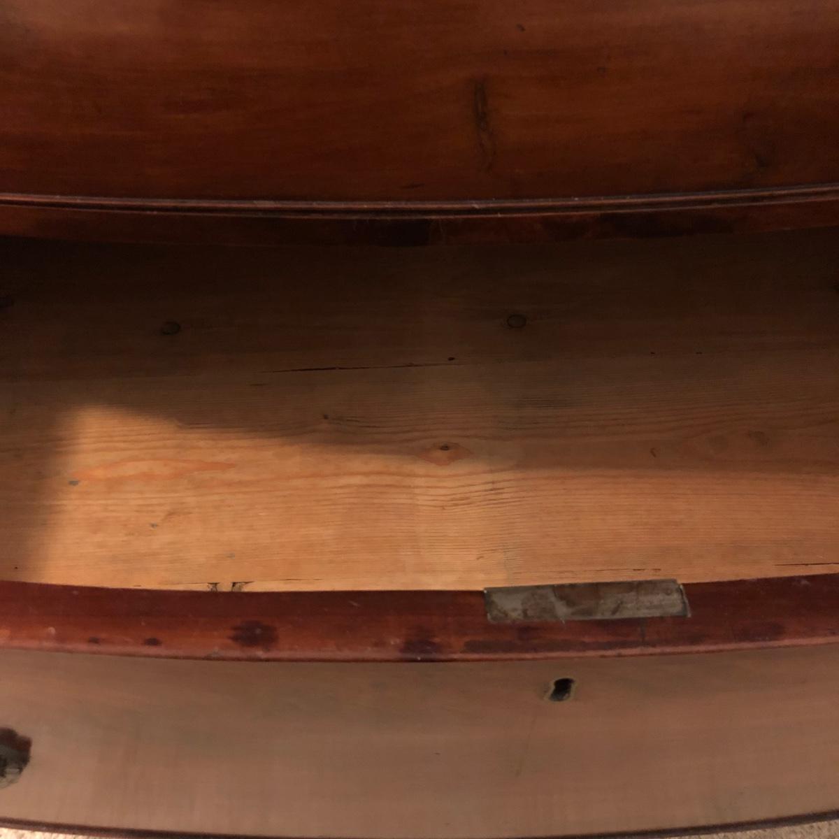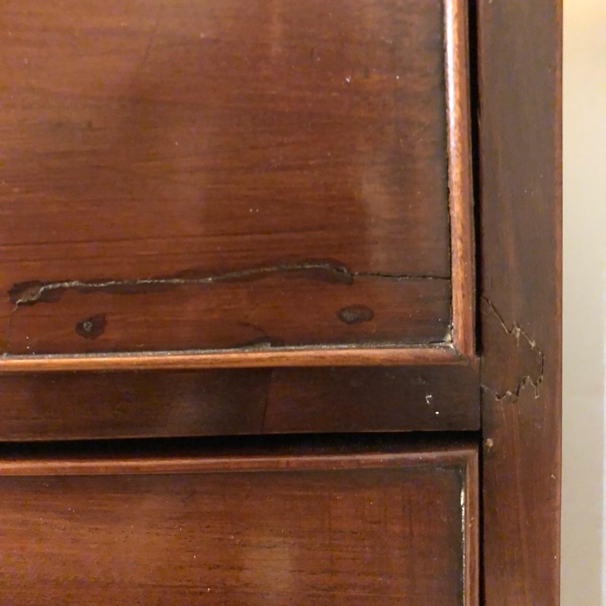 This solid wood antique dresser has 5 drawers with brass drawer pulls. The drawers are dovetailed and easily pull in and out. It measures 3’ 4.5” x 1’ 9.75” x 3’ 7”. Each drawer has an antique style key hole and mechanism, though the keys are not included. The veneer wood of the top of the dresser has a crack in it, as do the bases of some of the drawers with signs of repair work, as pictured. There is some damage to the right side 2nd and 3rd drawers up from the base as pictured. Local pickup only. This dresser is heavy, so make plans to bring help to load it.