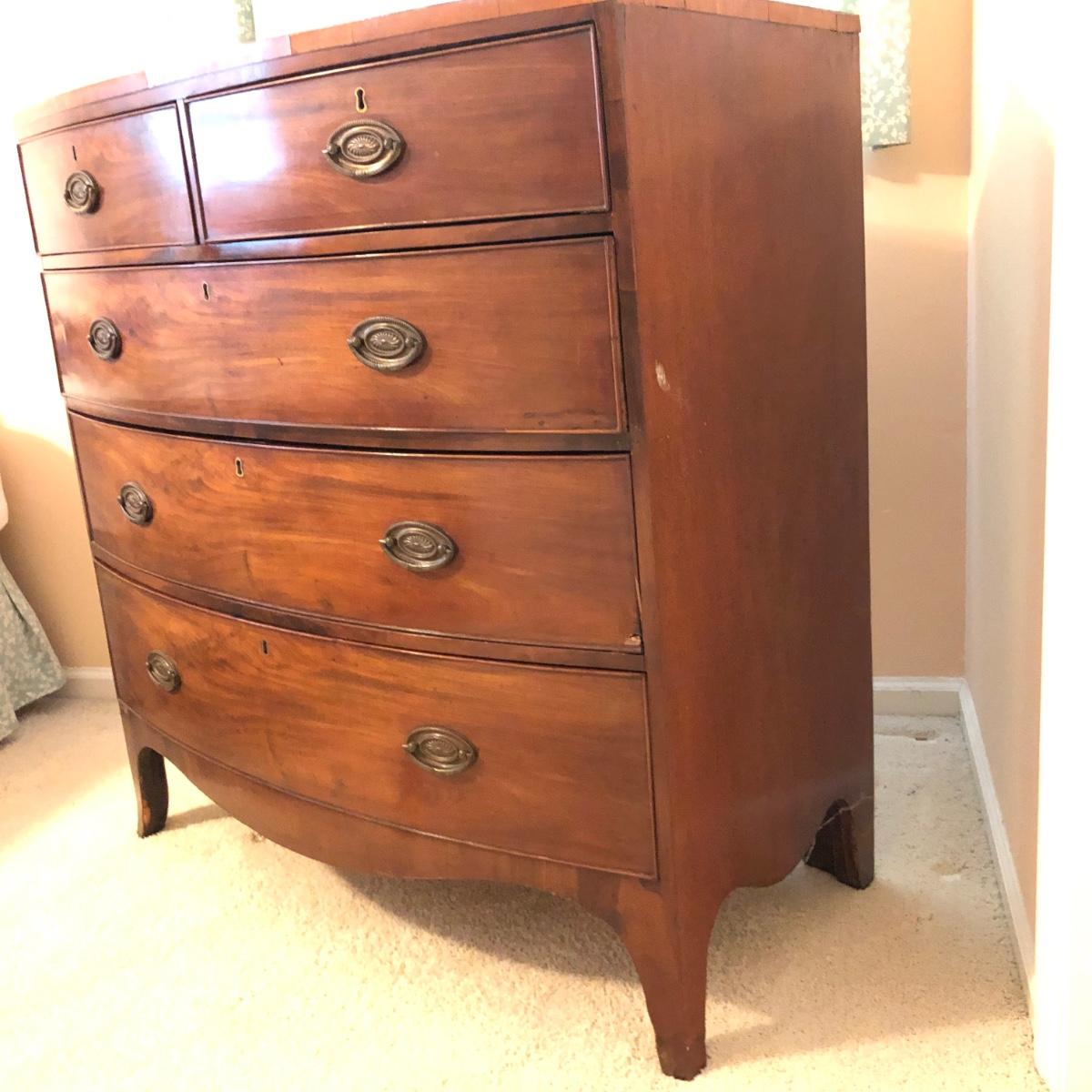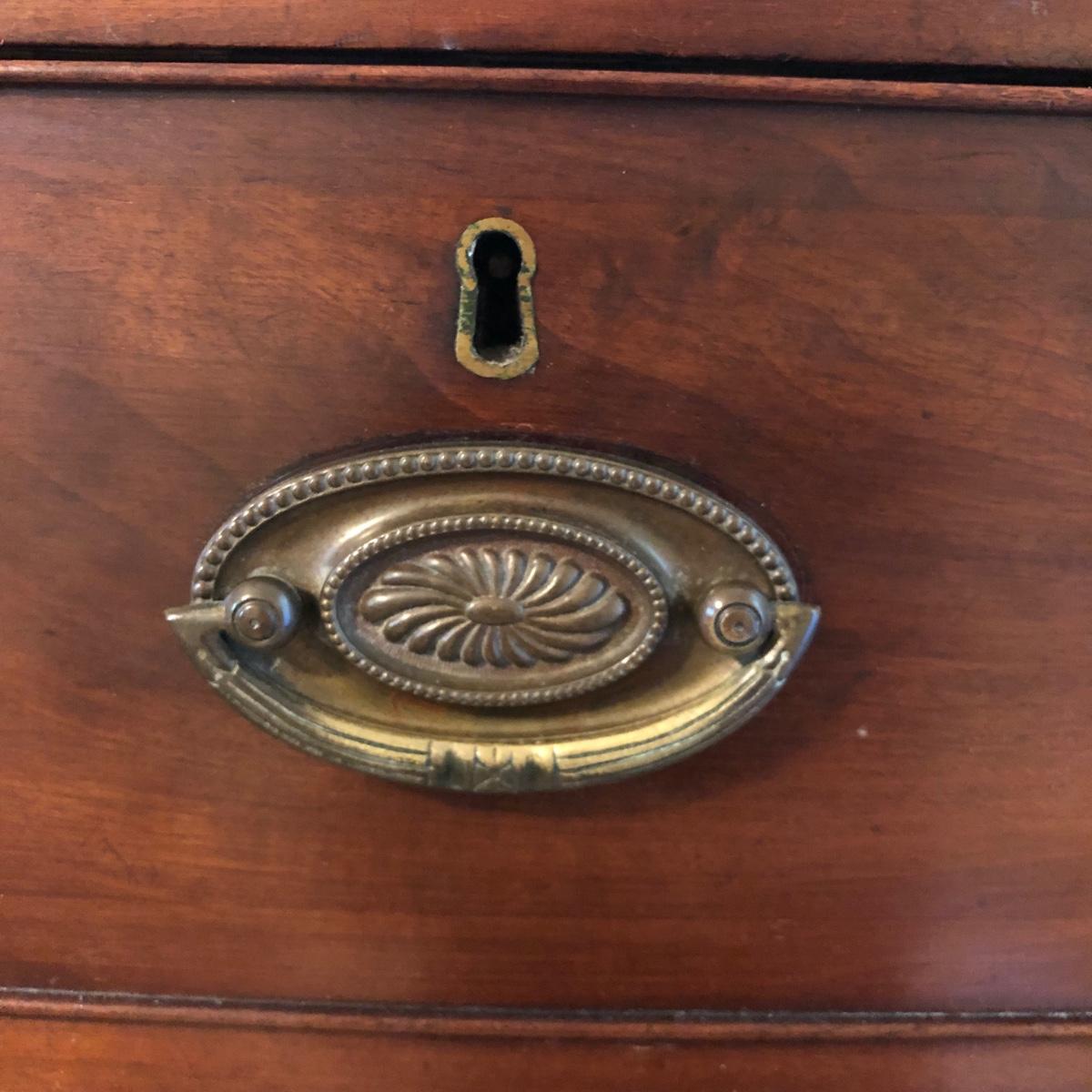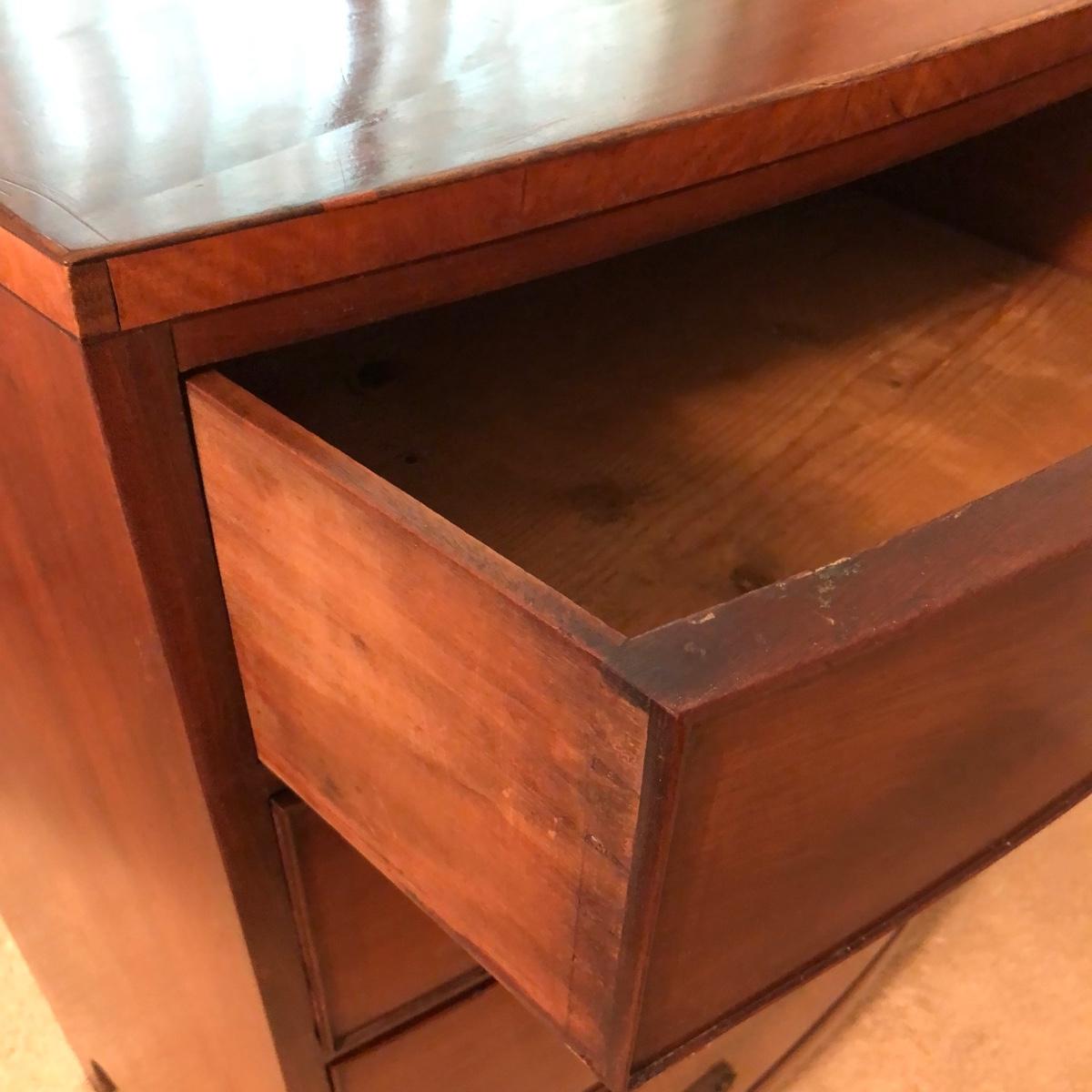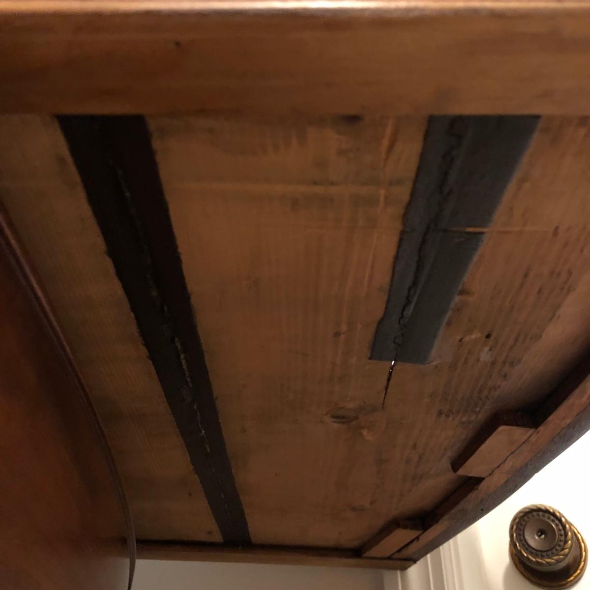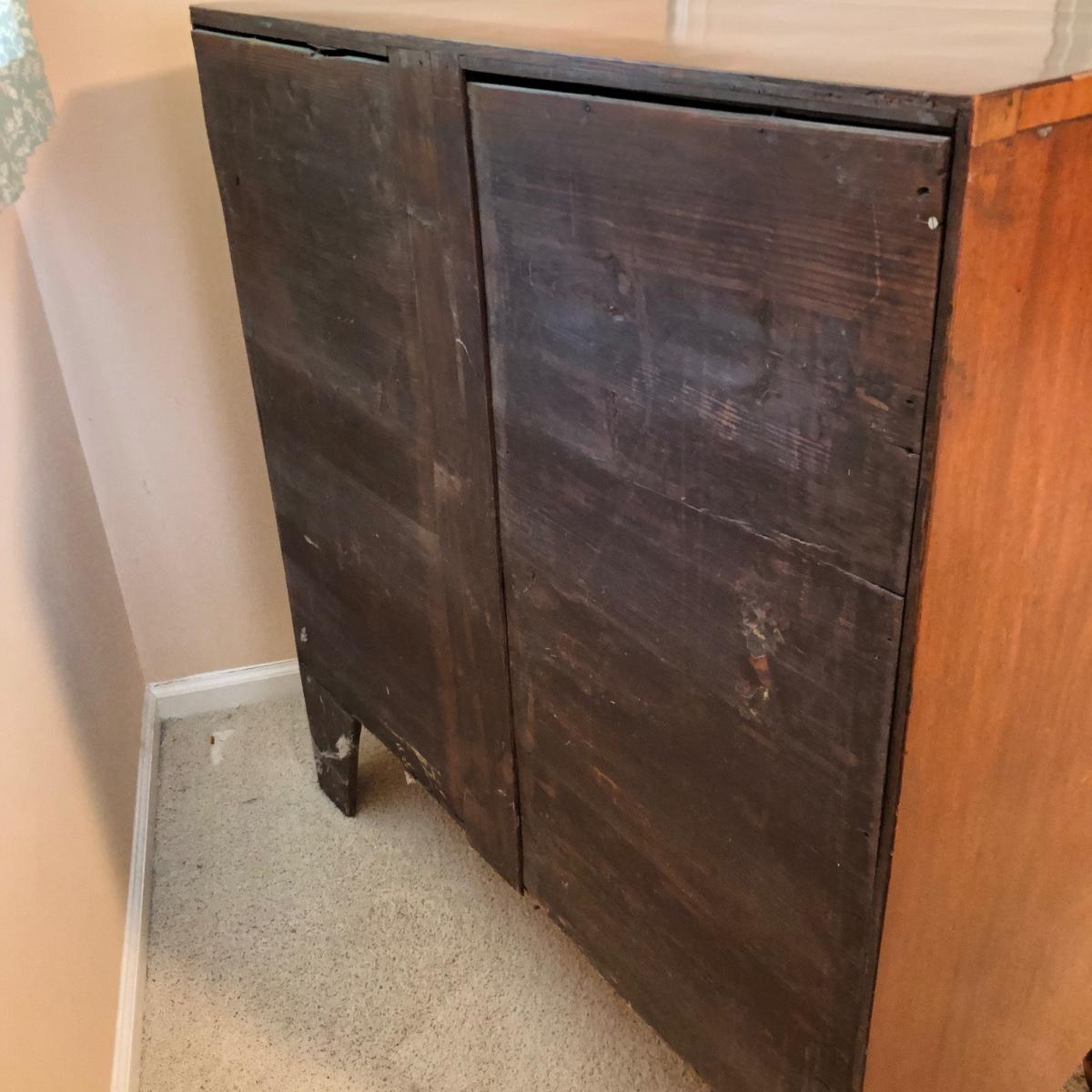 This solid wood antique dresser has 5 drawers with brass drawer pulls. The drawers are dovetailed and easily pull in and out. It measures 3’ 4.5” x 1’ 9.75” x 3’ 7”. Each drawer has an antique style key hole and mechanism, though the keys are not included. The veneer wood of the top of the dresser has a crack in it, as do the bases of some of the drawers with signs of repair work, as pictured. There is some damage to the right side 2nd and 3rd drawers up from the base as pictured. Local pickup only. This dresser is heavy, so make plans to bring help to load it.