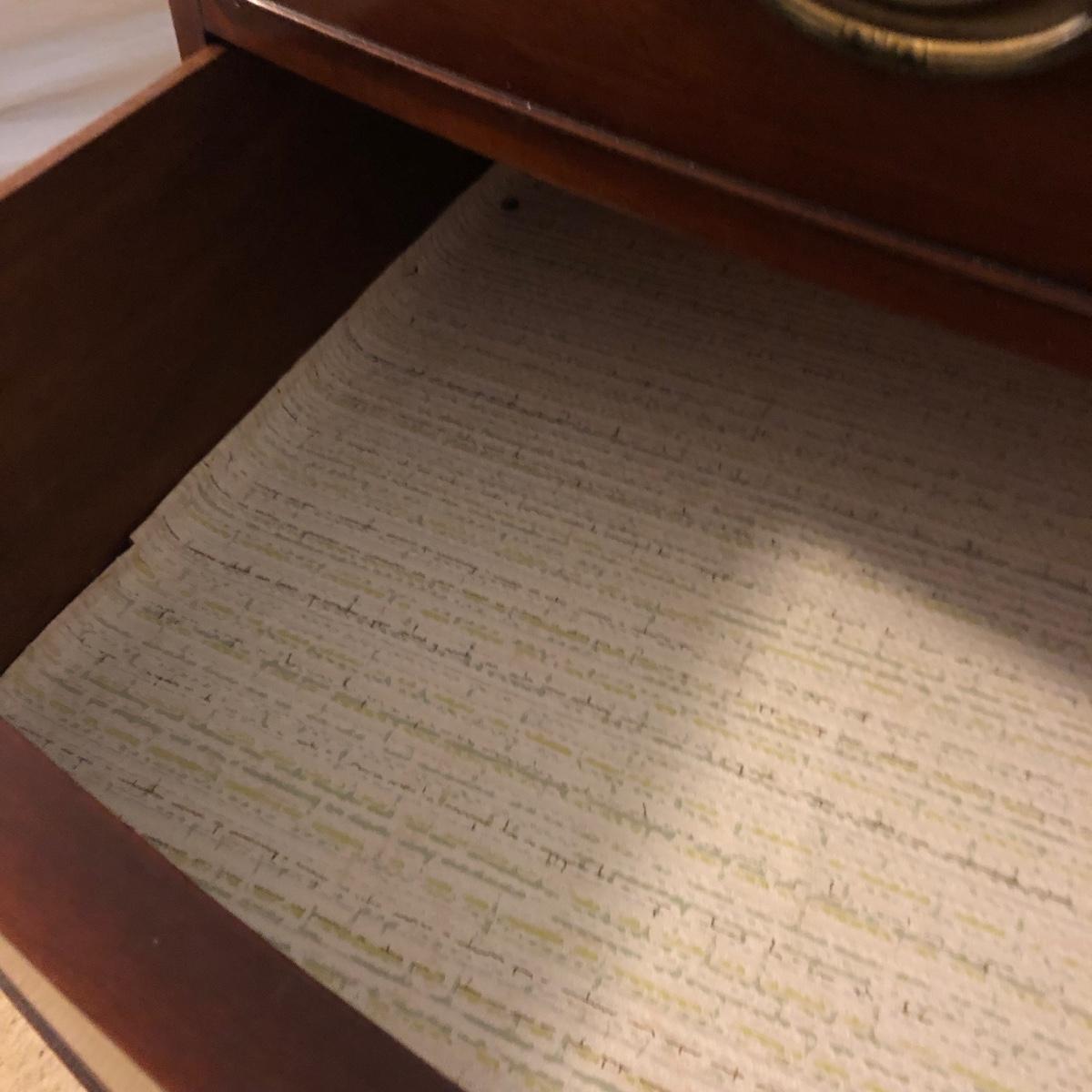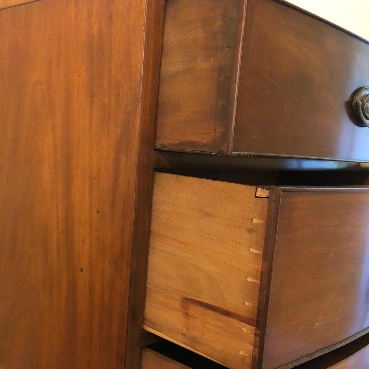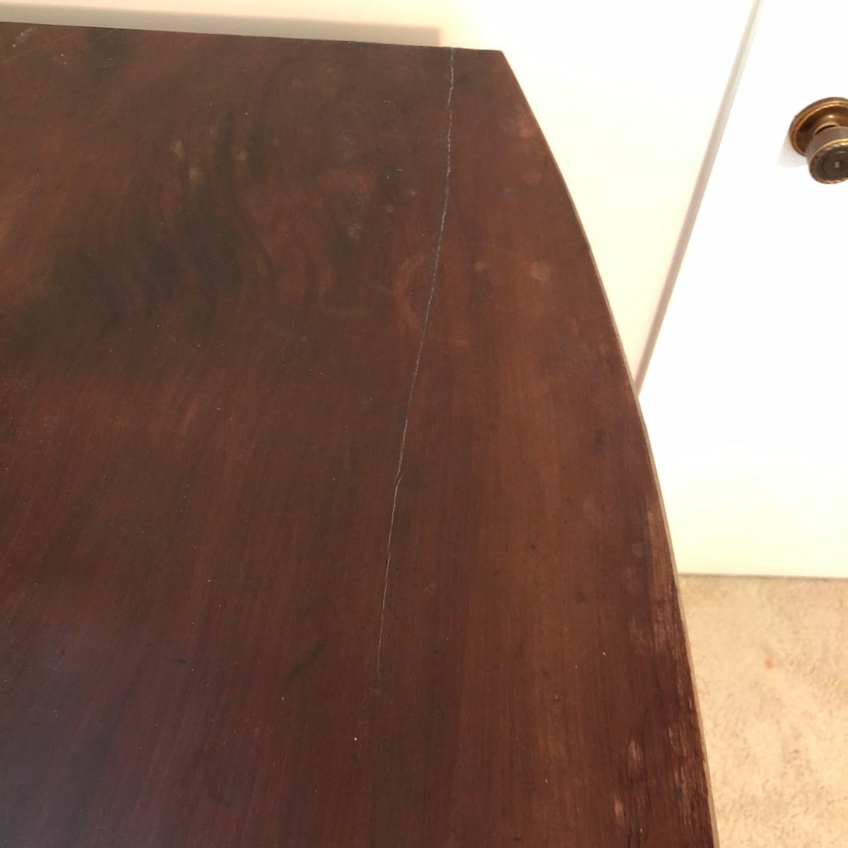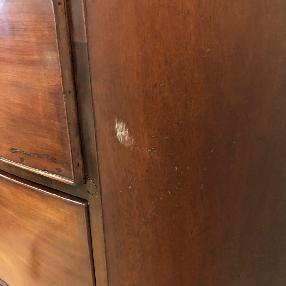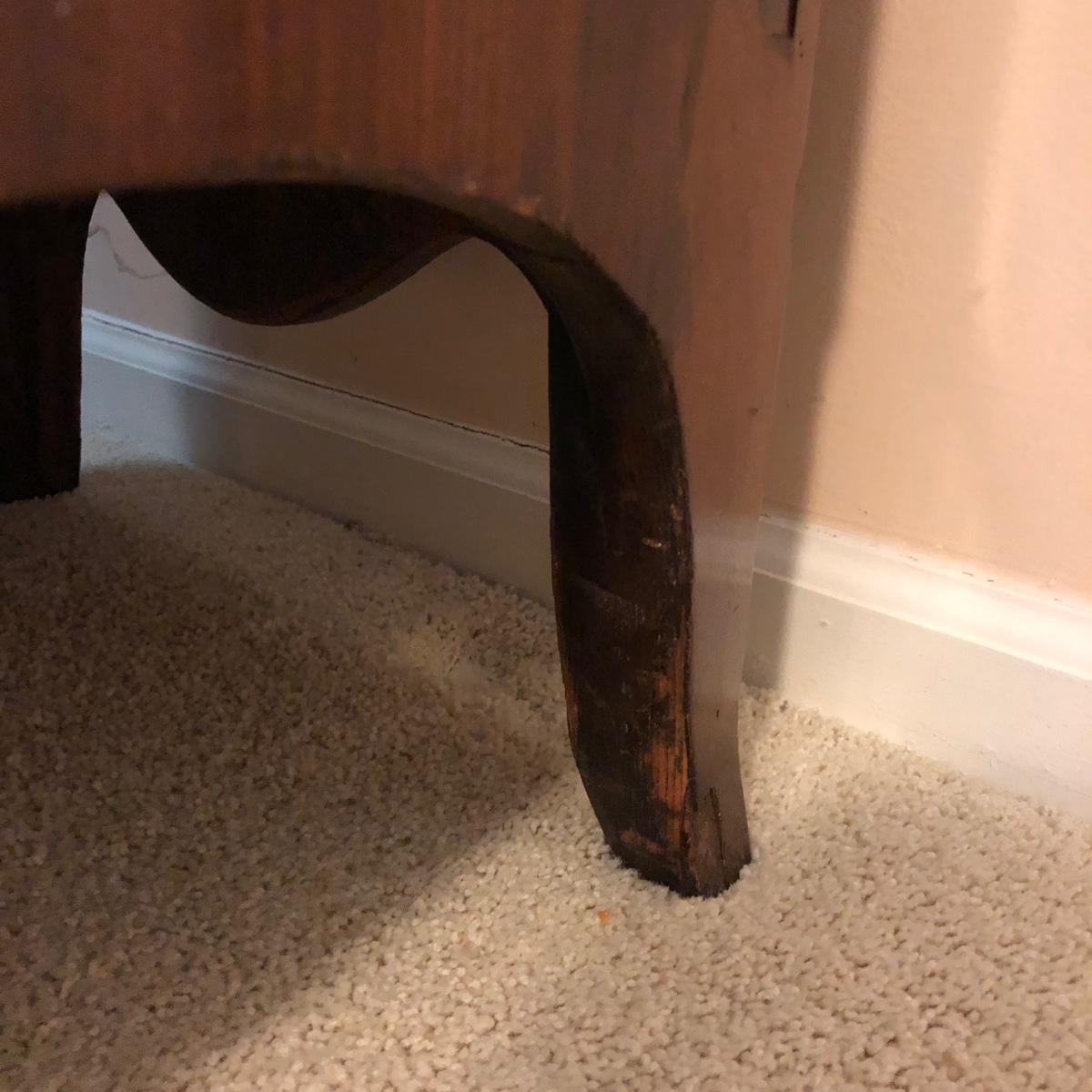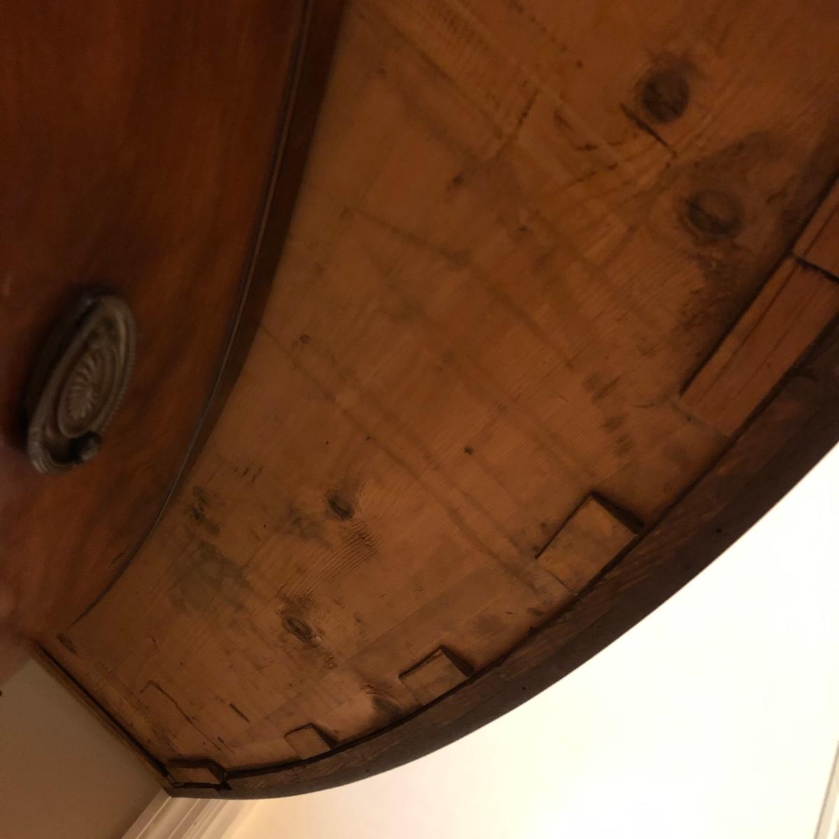 This solid wood antique dresser has 5 drawers with brass drawer pulls. The drawers are dovetailed and easily pull in and out. It measures 3’ 4.5” x 1’ 9.75” x 3’ 7”. Each drawer has an antique style key hole and mechanism, though the keys are not included. The veneer wood of the top of the dresser has a crack in it, as do the bases of some of the drawers with signs of repair work, as pictured. There is some damage to the right side 2nd and 3rd drawers up from the base as pictured. Local pickup only. This dresser is heavy, so make plans to bring help to load it.