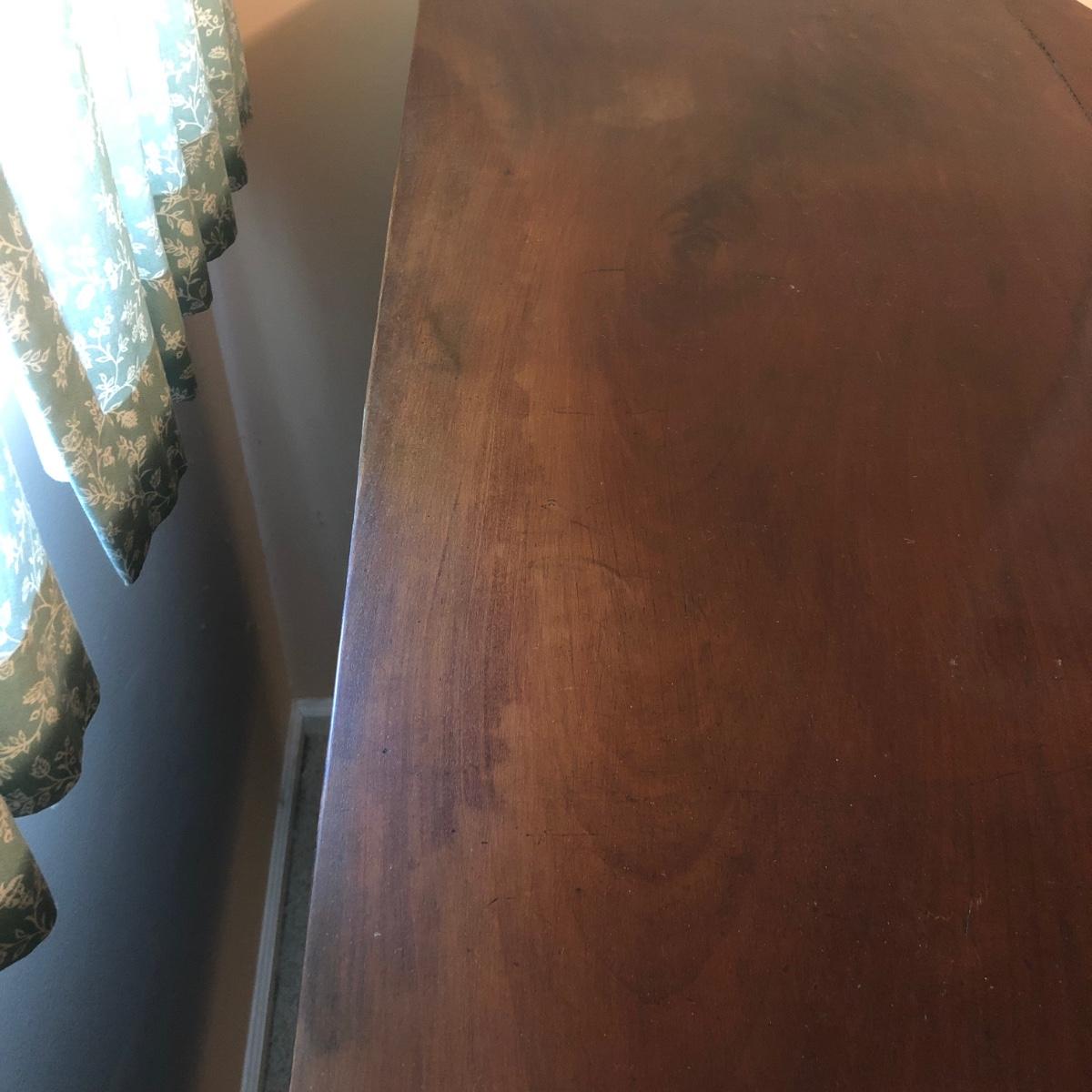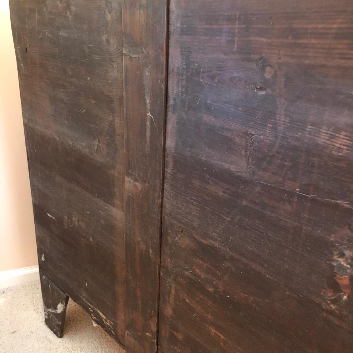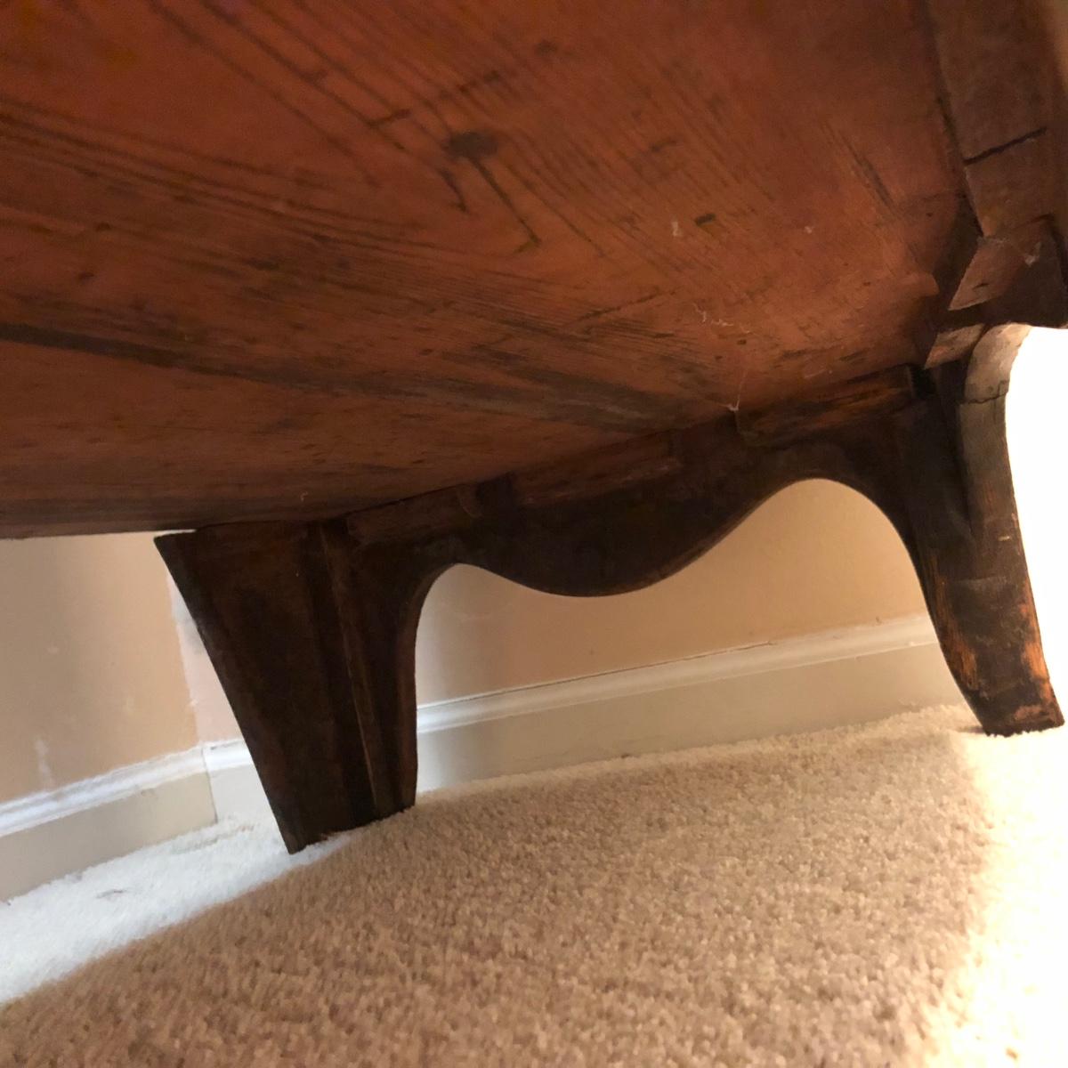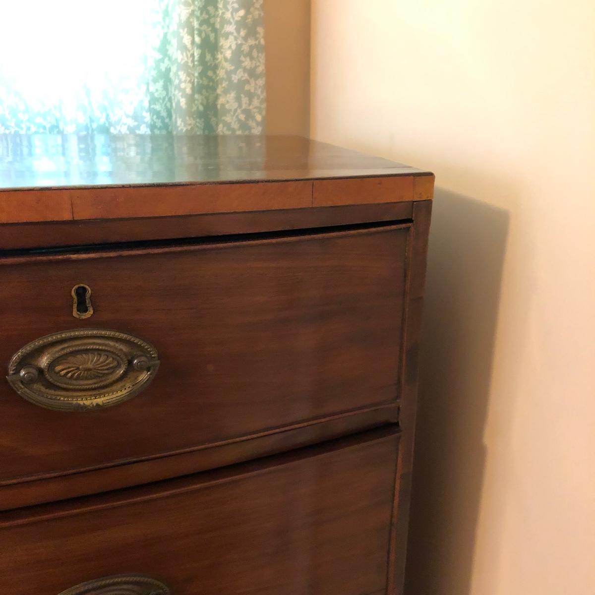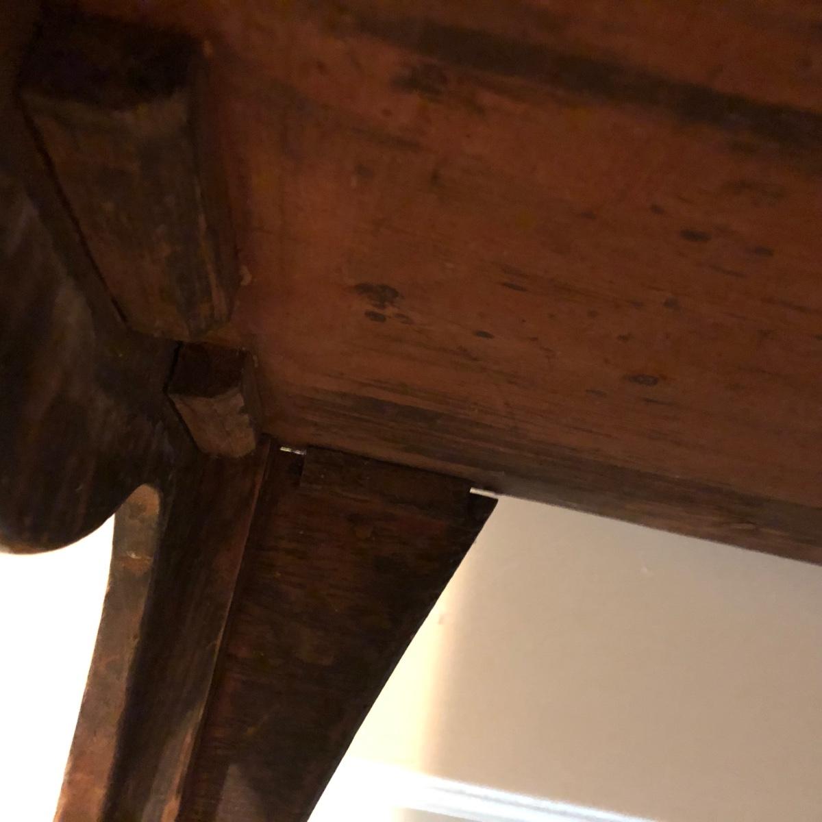 This solid wood antique dresser has 5 drawers with brass drawer pulls. The drawers are dovetailed and easily pull in and out. It measures 3’ 4.5” x 1’ 9.75” x 3’ 7”. Each drawer has an antique style key hole and mechanism, though the keys are not included. The veneer wood of the top of the dresser has a crack in it, as do the bases of some of the drawers with signs of repair work, as pictured. There is some damage to the right side 2nd and 3rd drawers up from the base as pictured. Local pickup only. This dresser is heavy, so make plans to bring help to load it.