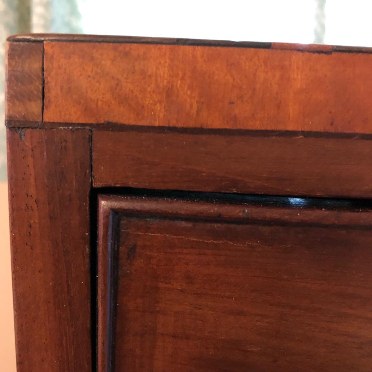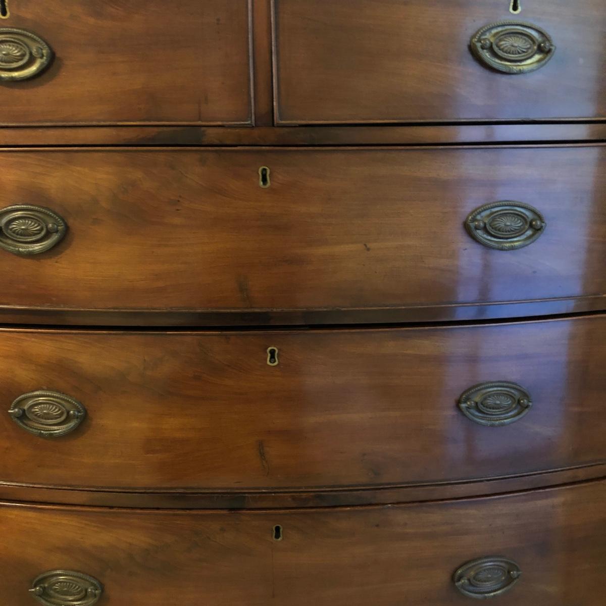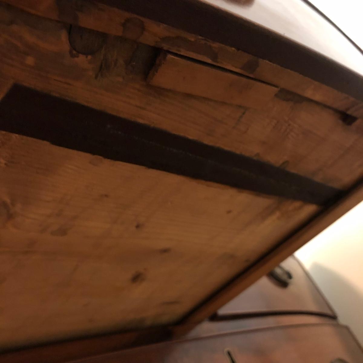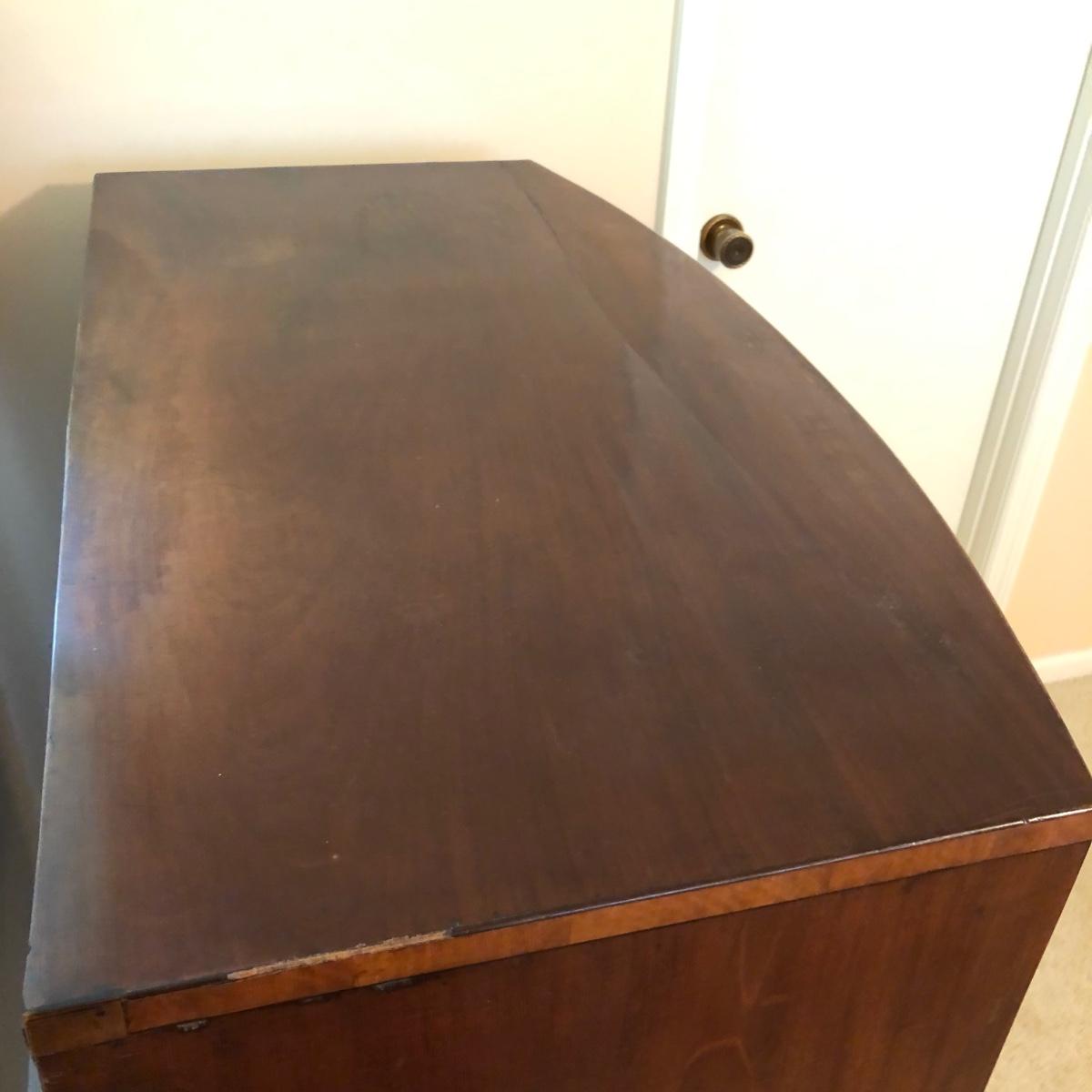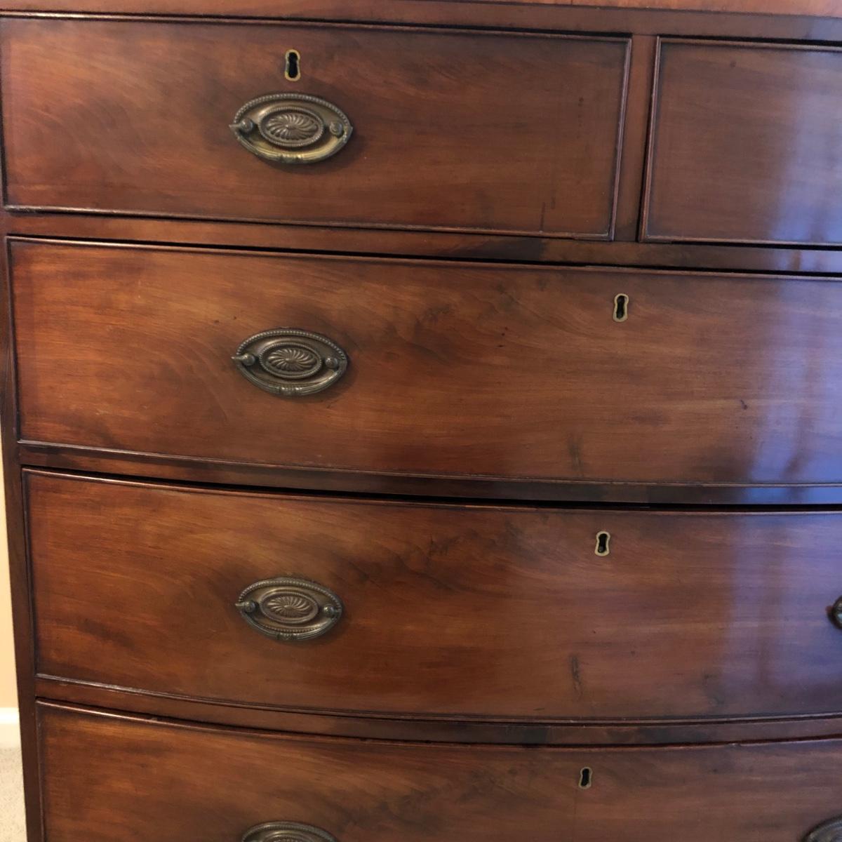 This solid wood antique dresser has 5 drawers with brass drawer pulls. The drawers are dovetailed and easily pull in and out. It measures 3’ 4.5” x 1’ 9.75” x 3’ 7”. Each drawer has an antique style key hole and mechanism, though the keys are not included. The veneer wood of the top of the dresser has a crack in it, as do the bases of some of the drawers with signs of repair work, as pictured. There is some damage to the right side 2nd and 3rd drawers up from the base as pictured. Local pickup only. This dresser is heavy, so make plans to bring help to load it.