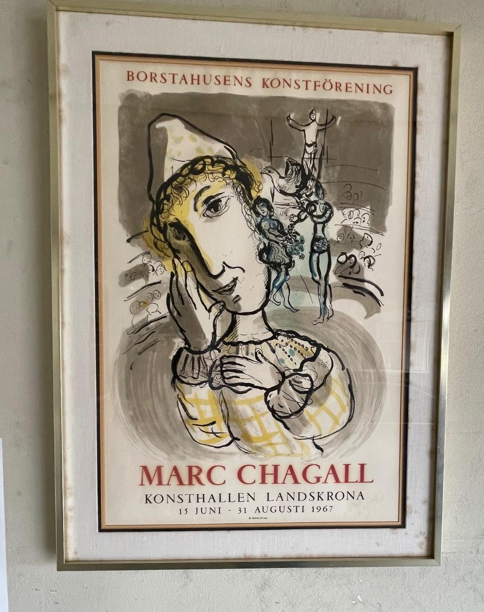 Signed by the artist in 1979. A poster announcing an art exhibition in Sweden in 1967. Marc Chagall's work "The Circus with the Yellow Clown" was exhibited at the Konsthallen Landskrona in Landskrona, Sweden from June 15 to August 31, 1967. The exhibition was presented by Borstahusens Konstfrening Gallery.