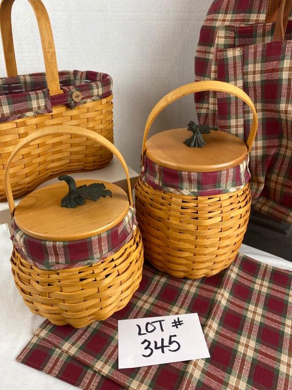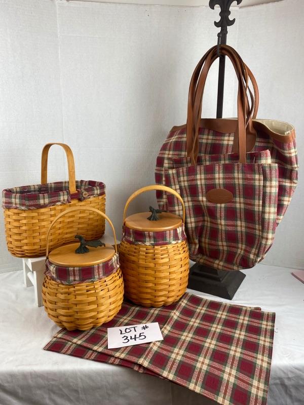 This Gift Lot consists of, 3 Single Handle Longaberger Baskets with Fabric & Plastic Liners, 2 Baskets have Lids, also included are 2 Bags & 2 Placemats