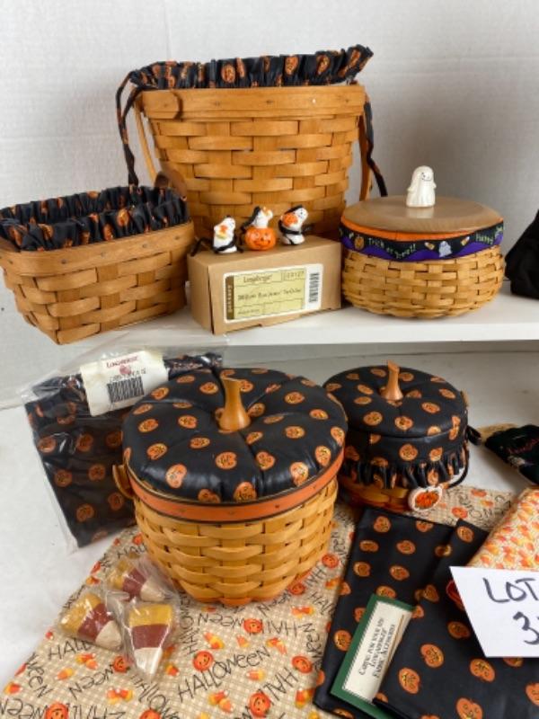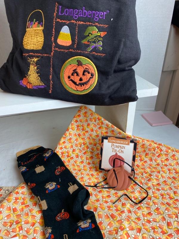 Great Gift for the Halloween lover in your family. This Lot offers 5 Longaberger Baskets with Fabric & Plastic Liners, 3 have lids, Also included are Longaberger Socks, Tie Ons, Wooden Candy Corns, Pumpkin Patch Tablecloth Square