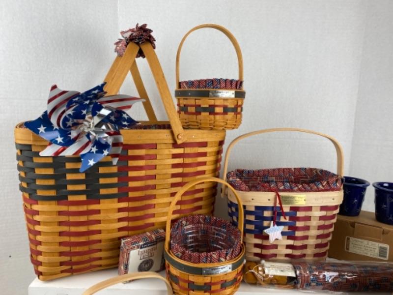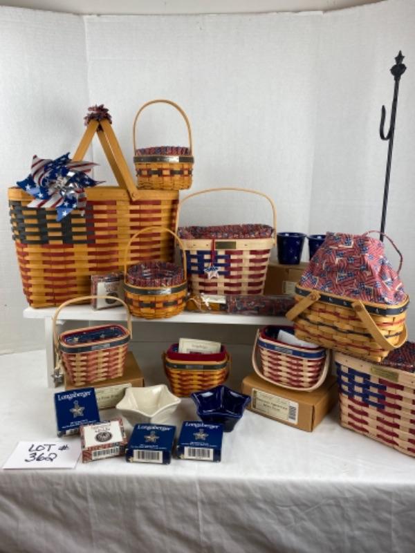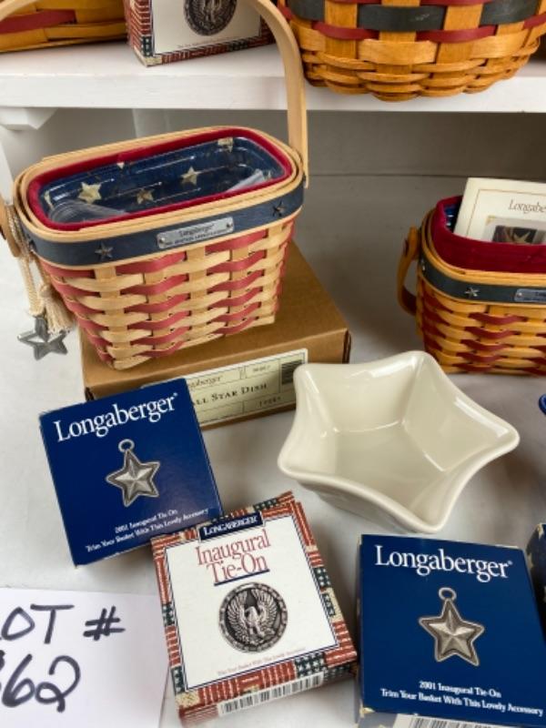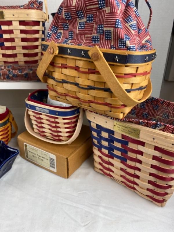American Longaberger Gift Lot 9 baskets, blue votives, 6 tie on , 2 star dishes, pin wheel , 2 napkins s