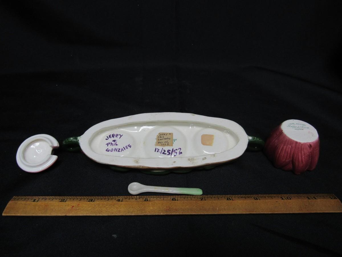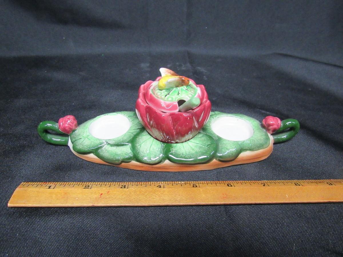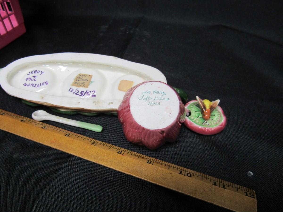 Vintage Shafford China ceramic dish with handled tray. From the 1950s. Missing the outer dishes. Center is a flower with bee. Has spoon. Could be used for display or as a salt and pepper tray.
