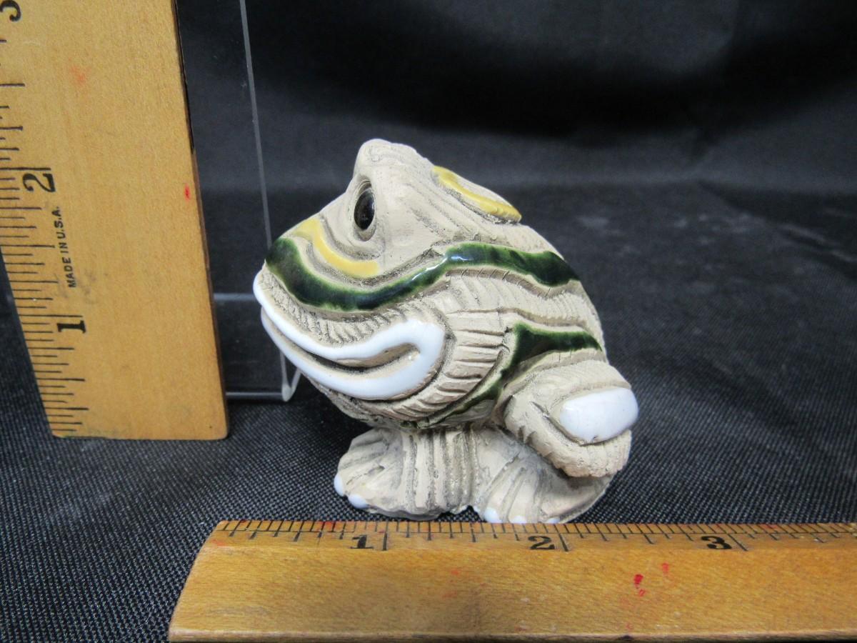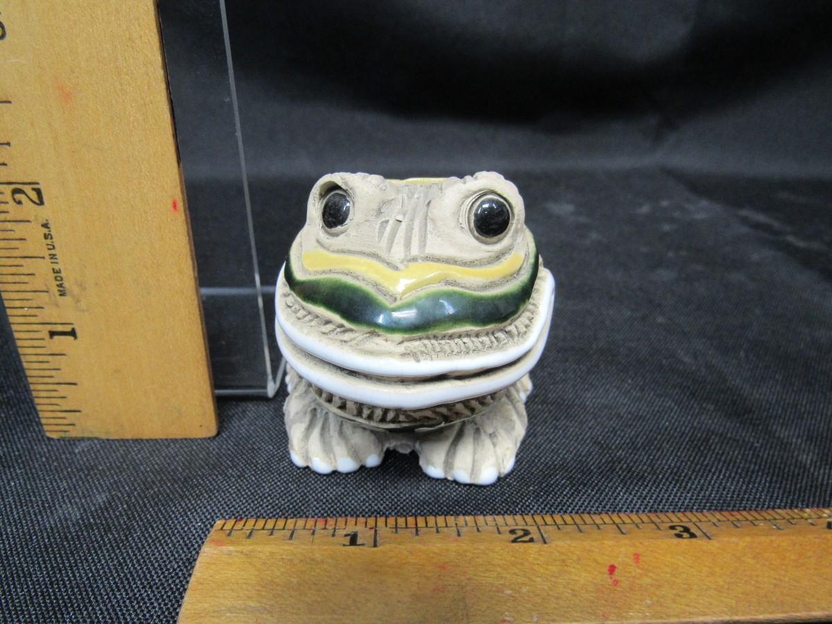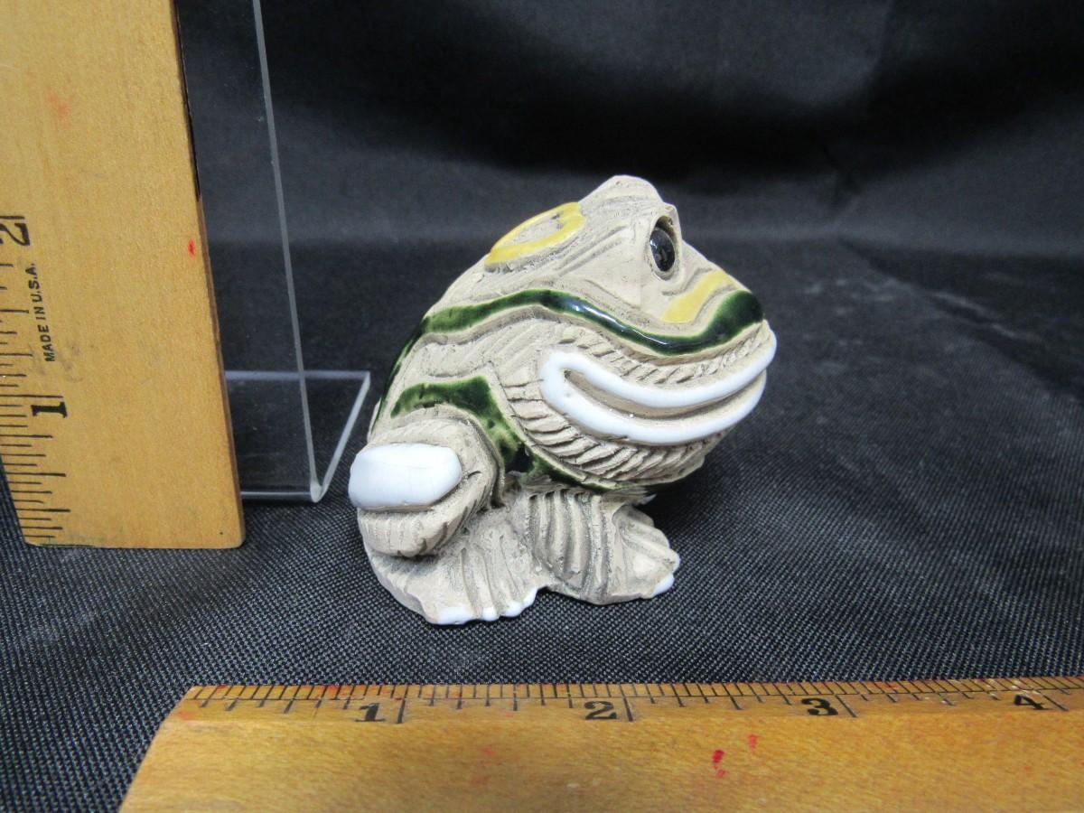 Vintage Artesania Riconada frog figurine. Carved frog with colorful enamel paint detail. Good condition. Under 3" size.