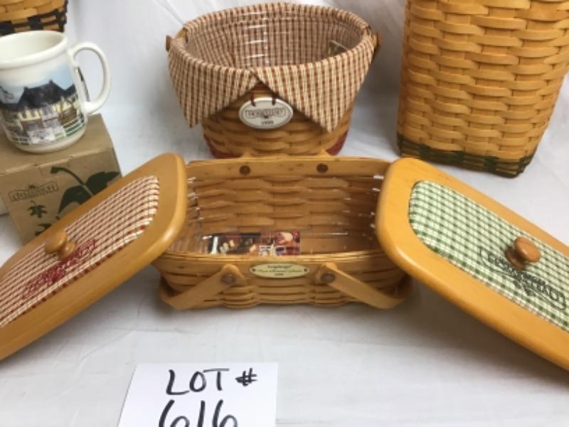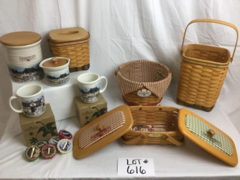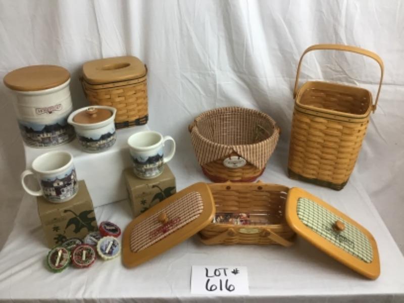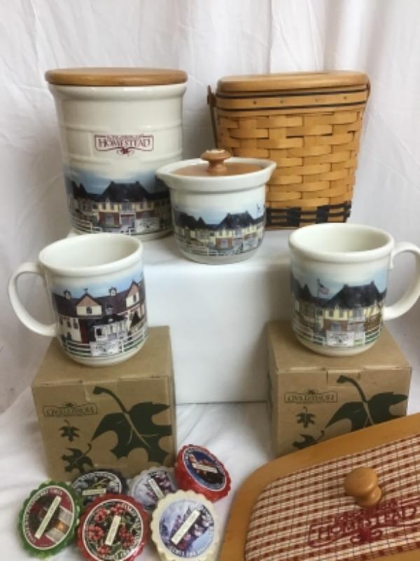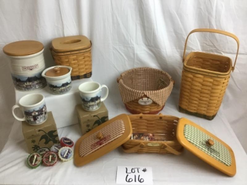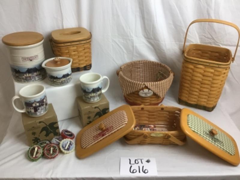 This fabulous Gift lot consists of 4 Baskets all with plastic liners, 1 has fabric liner in addition ( 2 lids are interchangeable with 1 basket ), 1 tissue top, 2pc Canister Set & 2 Matching mugs, and Yankee Potpourri Tarts