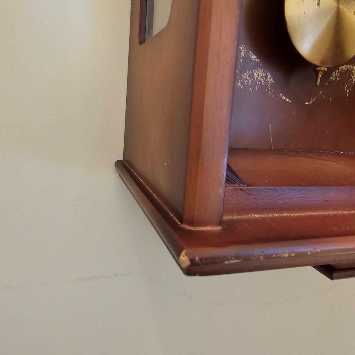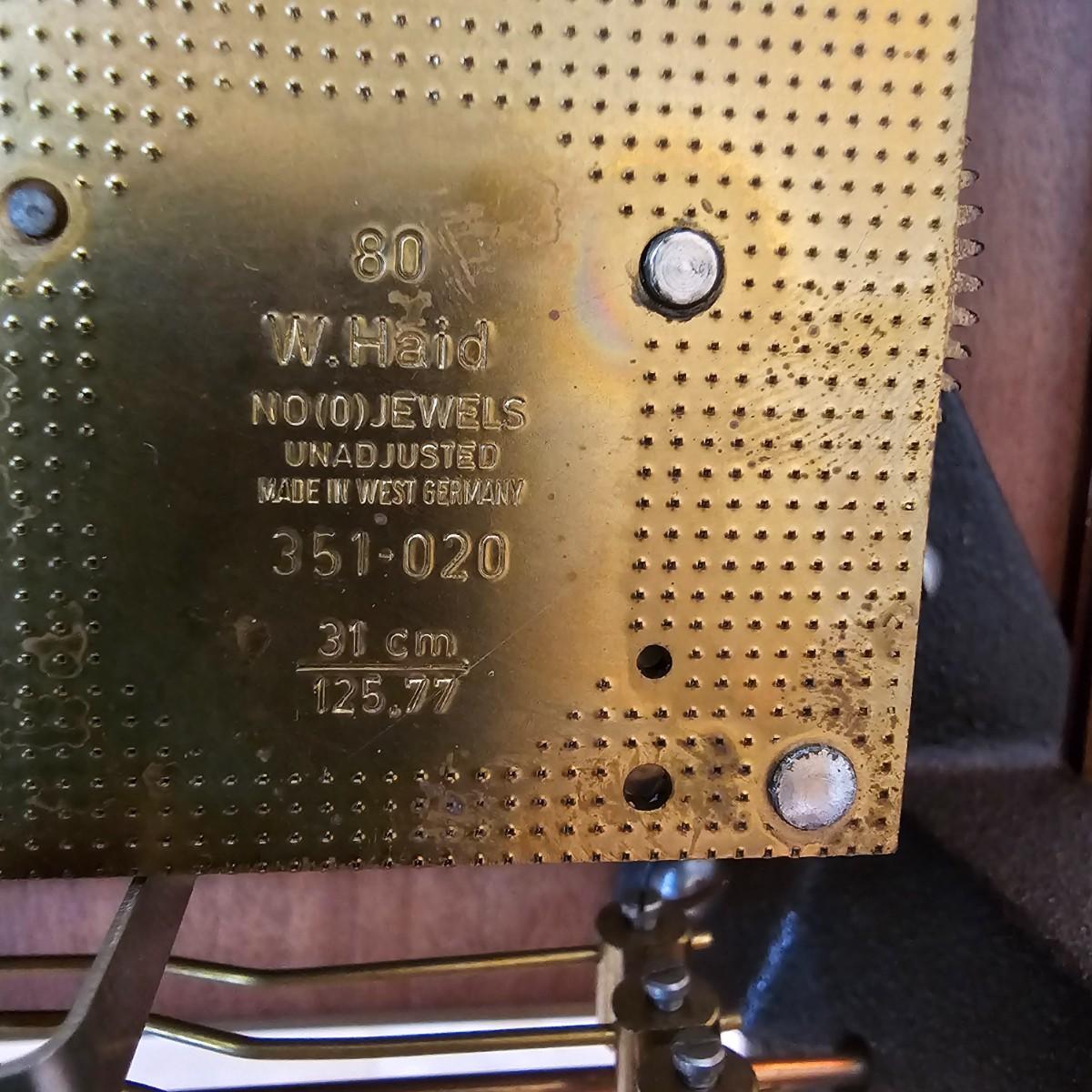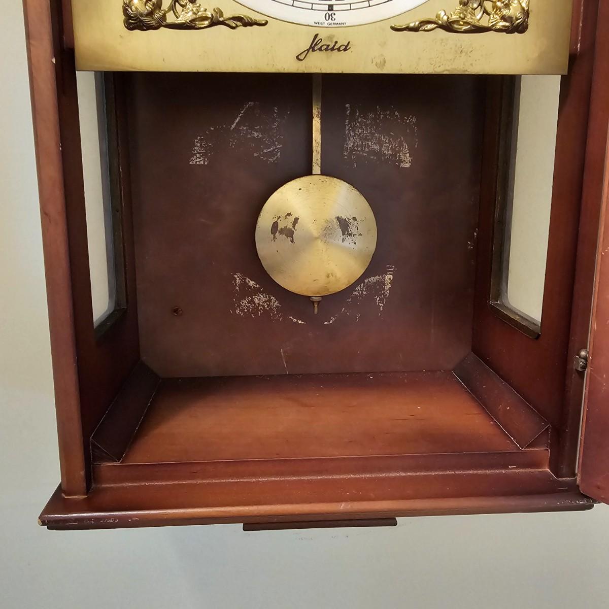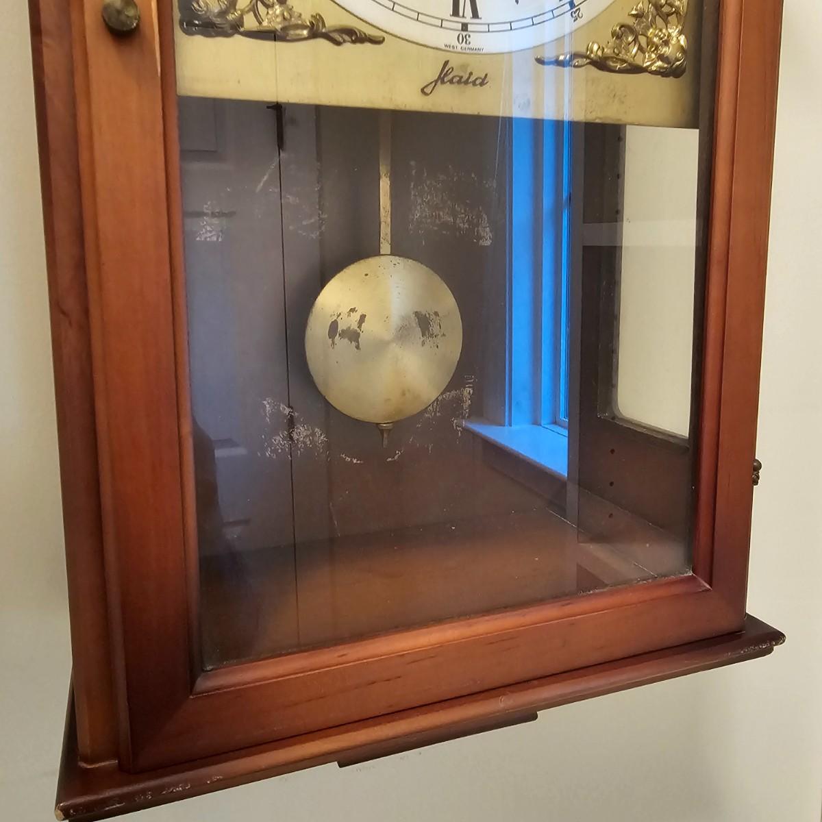 Charming small mechanical wall clock made by W. Haid from West Germany. Clock has domed wooden case with glass front door that opens to wind and set the clock. Winding key included. Back of clock has removable door for cleaning and adjusting the pendulum. Clock has Westminster chimes, but is not known if clock is currently working. Measures 9.5" x 5.5" x 19.5" H. There are several nicks and blemishes on case and pendulum appears to have been secured at some time with tape, which residue is still visible. See photos for details. Shipping available. Shipping can be costly. We suggest contacting our preferred local shipping provider, Postage Express, with dimensions and getting an estimate before bidding: 828-255-9250 or shipping@postageexpressnc.com
