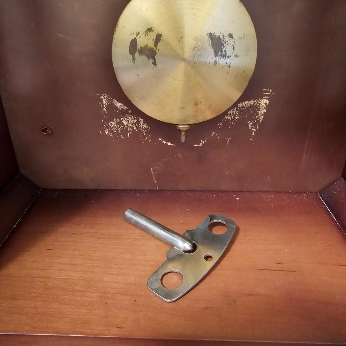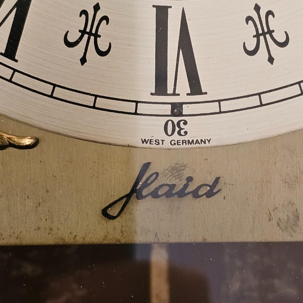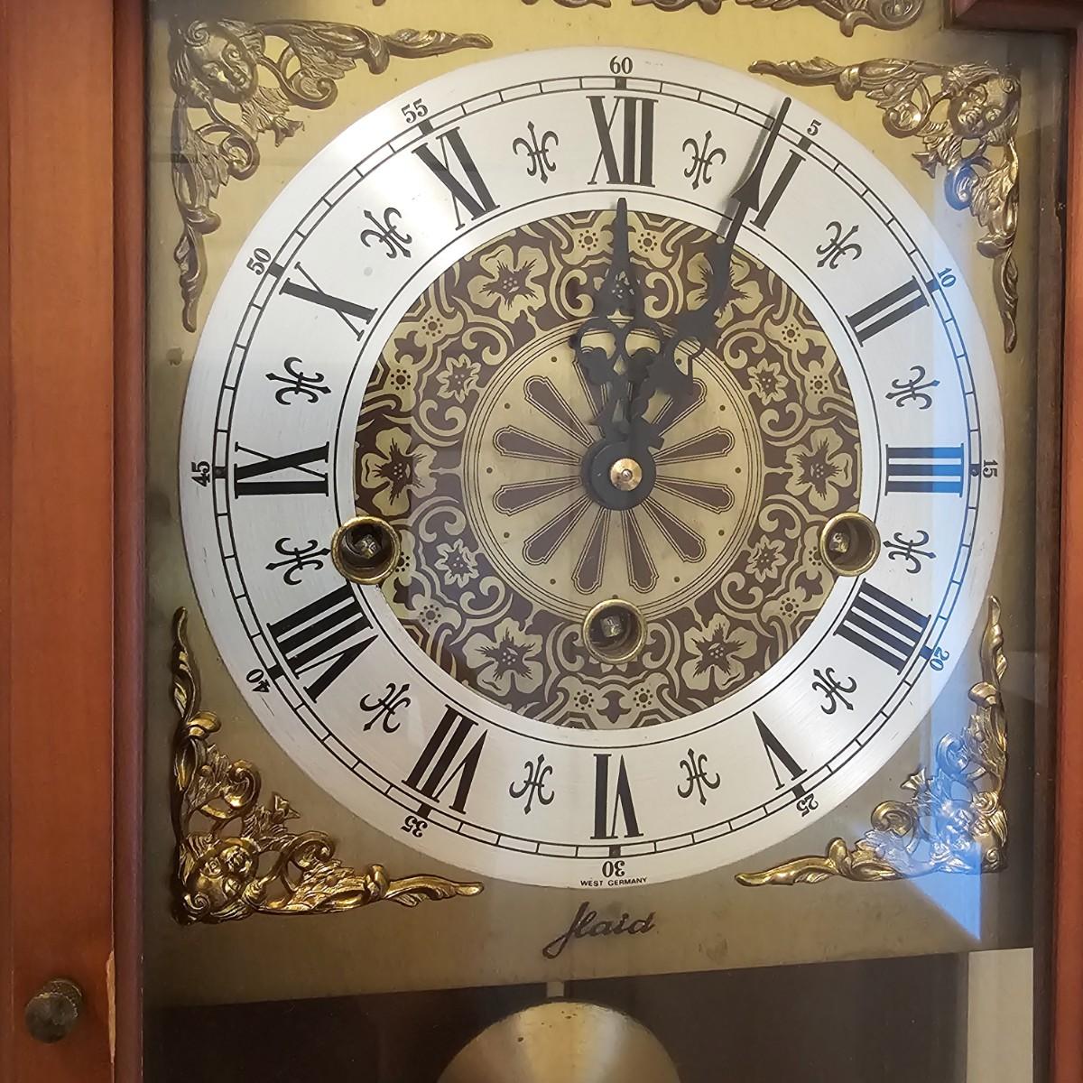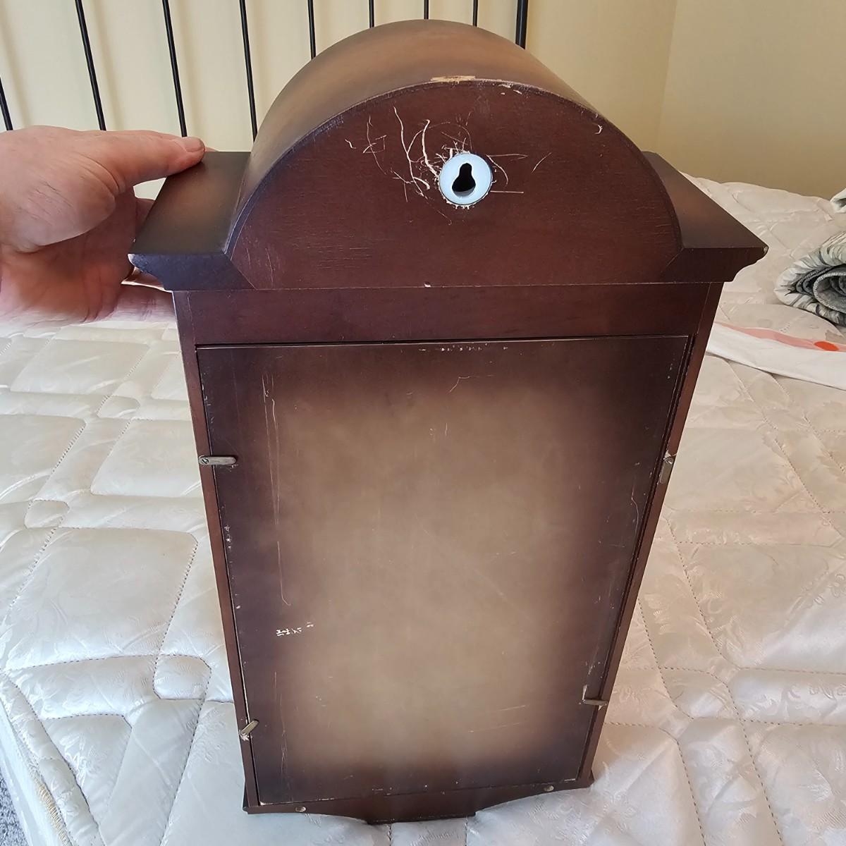 Charming small mechanical wall clock made by W. Haid from West Germany. Clock has domed wooden case with glass front door that opens to wind and set the clock. Winding key included. Back of clock has removable door for cleaning and adjusting the pendulum. Clock has Westminster chimes, but is not known if clock is currently working. Measures 9.5" x 5.5" x 19.5" H. There are several nicks and blemishes on case and pendulum appears to have been secured at some time with tape, which residue is still visible. See photos for details. Shipping available. Shipping can be costly. We suggest contacting our preferred local shipping provider, Postage Express, with dimensions and getting an estimate before bidding: 828-255-9250 or shipping@postageexpressnc.com