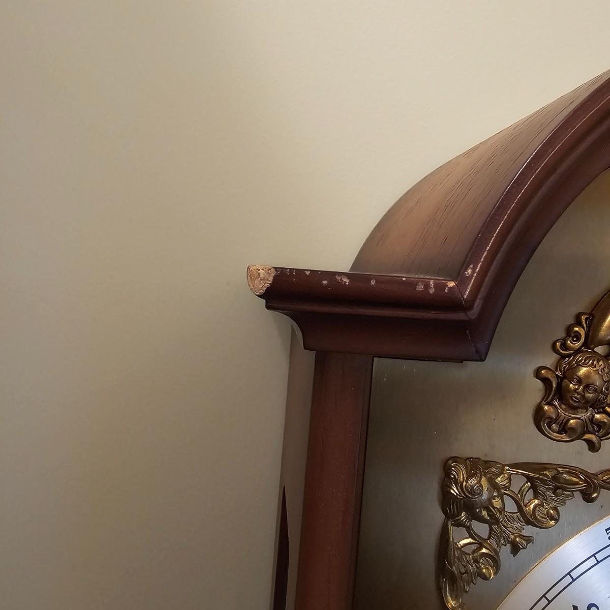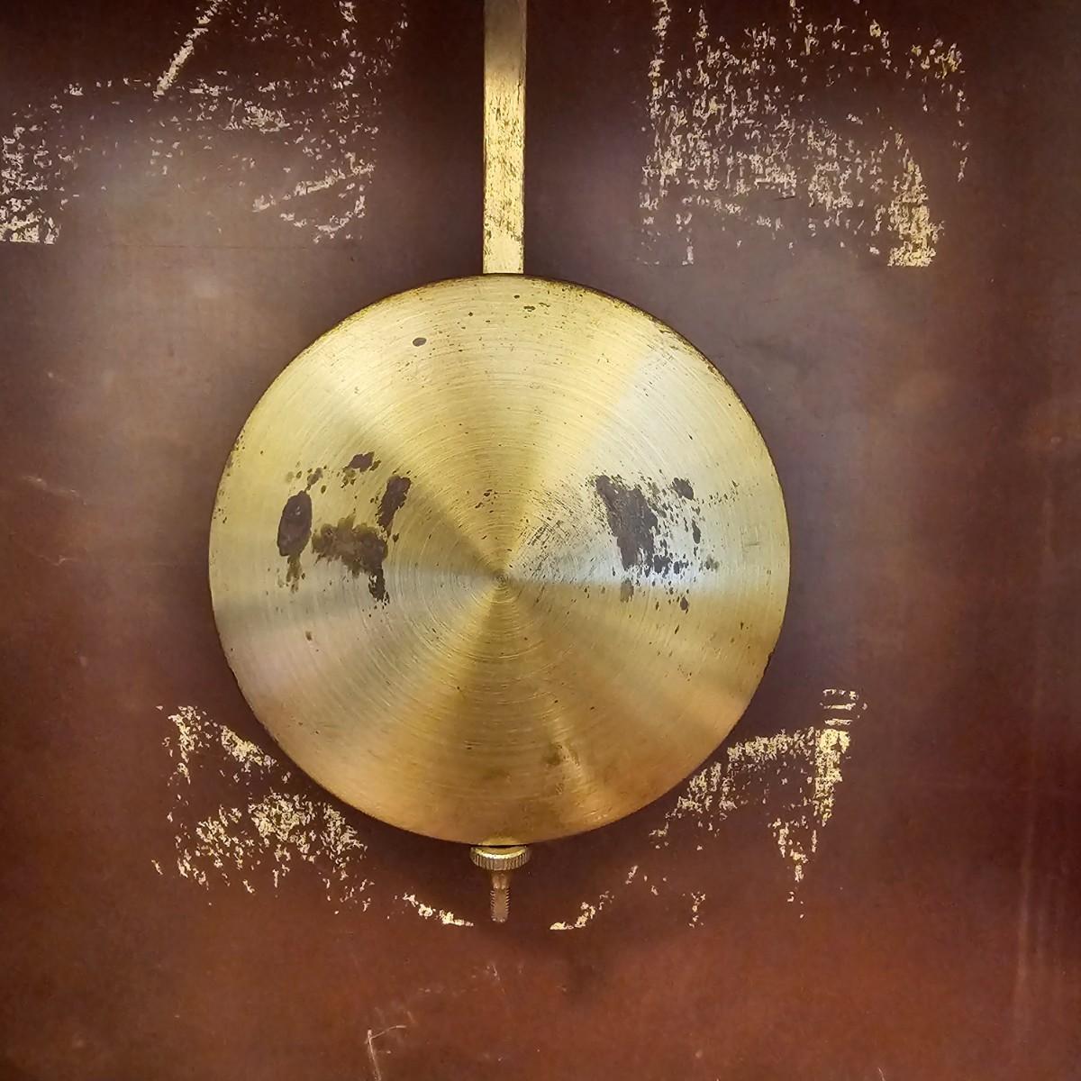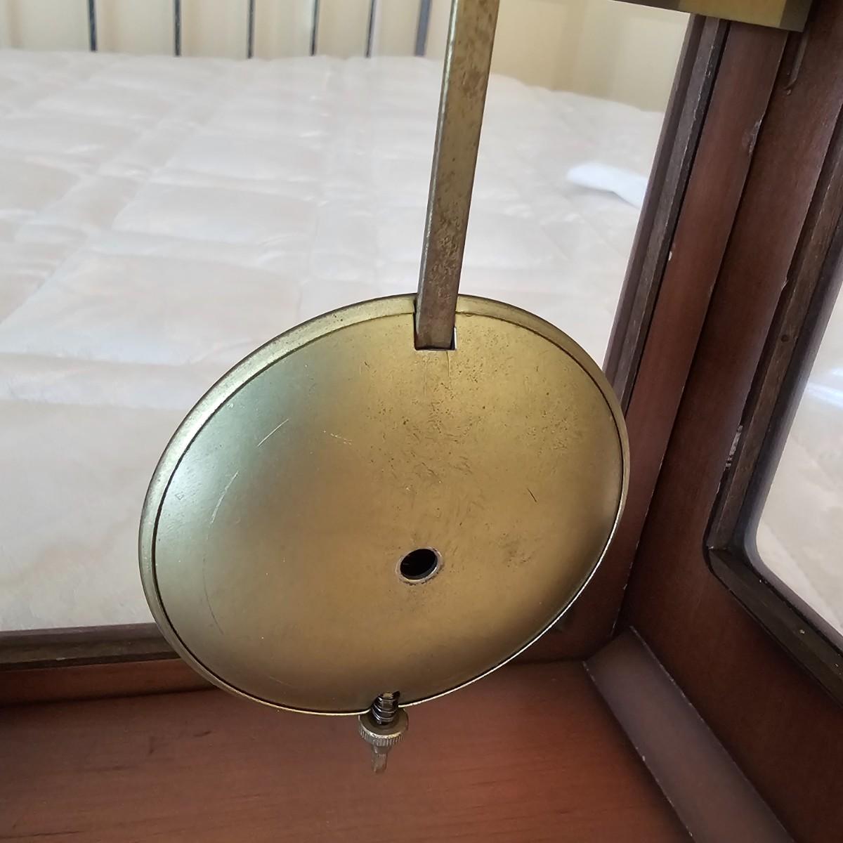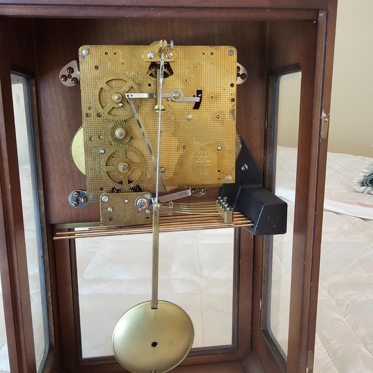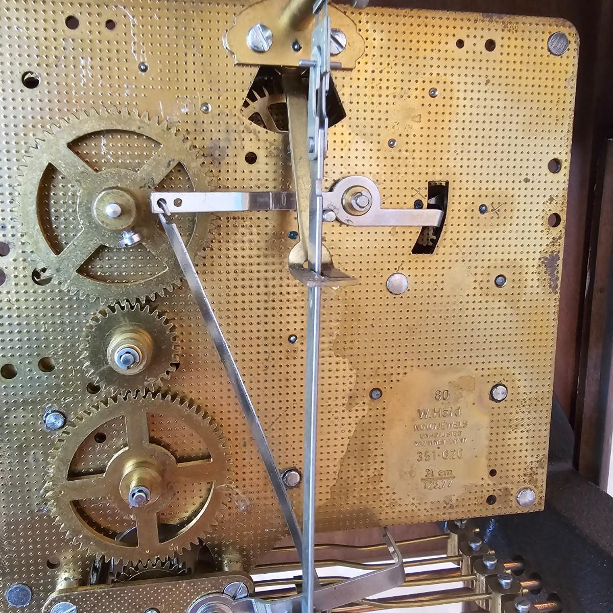Charming small mechanical wall clock made by W. Haid from West Germany. Clock has domed wooden case with glass front door that opens to wind and set the clock. Winding key included. Back of clock has removable door for cleaning and adjusting the pendulum. Clock has Westminster chimes, but is not known if clock is currently working. Measures 9.5" x 5.5" x 19.5" H. There are several nicks and blemishes on case and pendulum appears to have been secured at some time with tape, which residue is still visible. See photos for details. Shipping available. Shipping can be costly. We suggest contacting our preferred local shipping provider, Postage Express, with dimensions and getting an estimate before bidding: 828-255-9250 or shipping@postageexpressnc.com