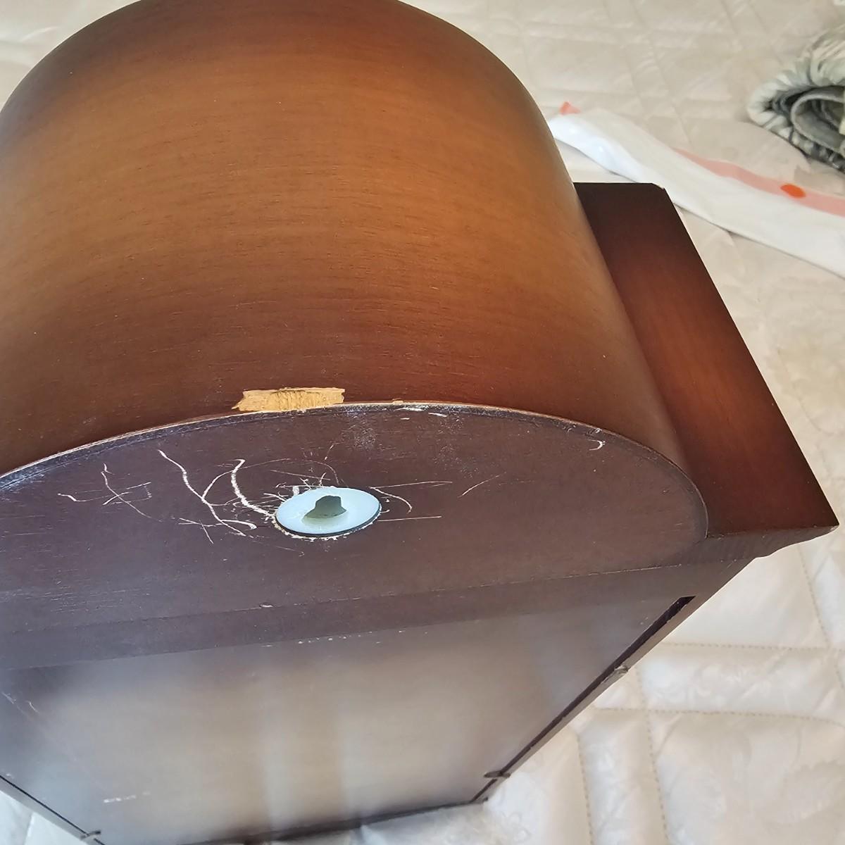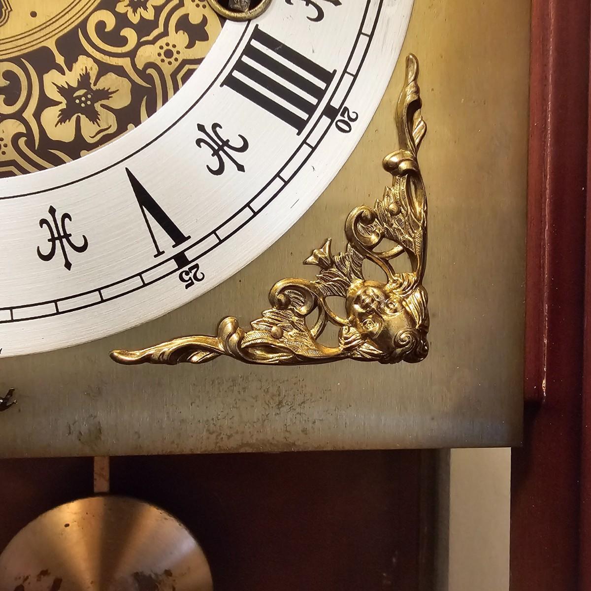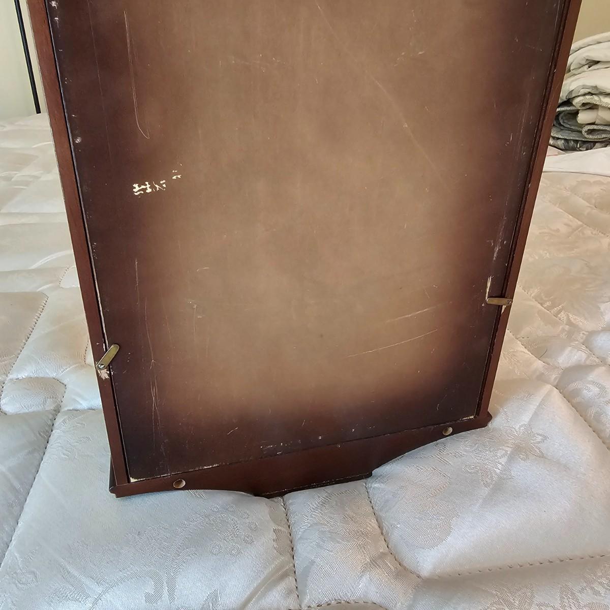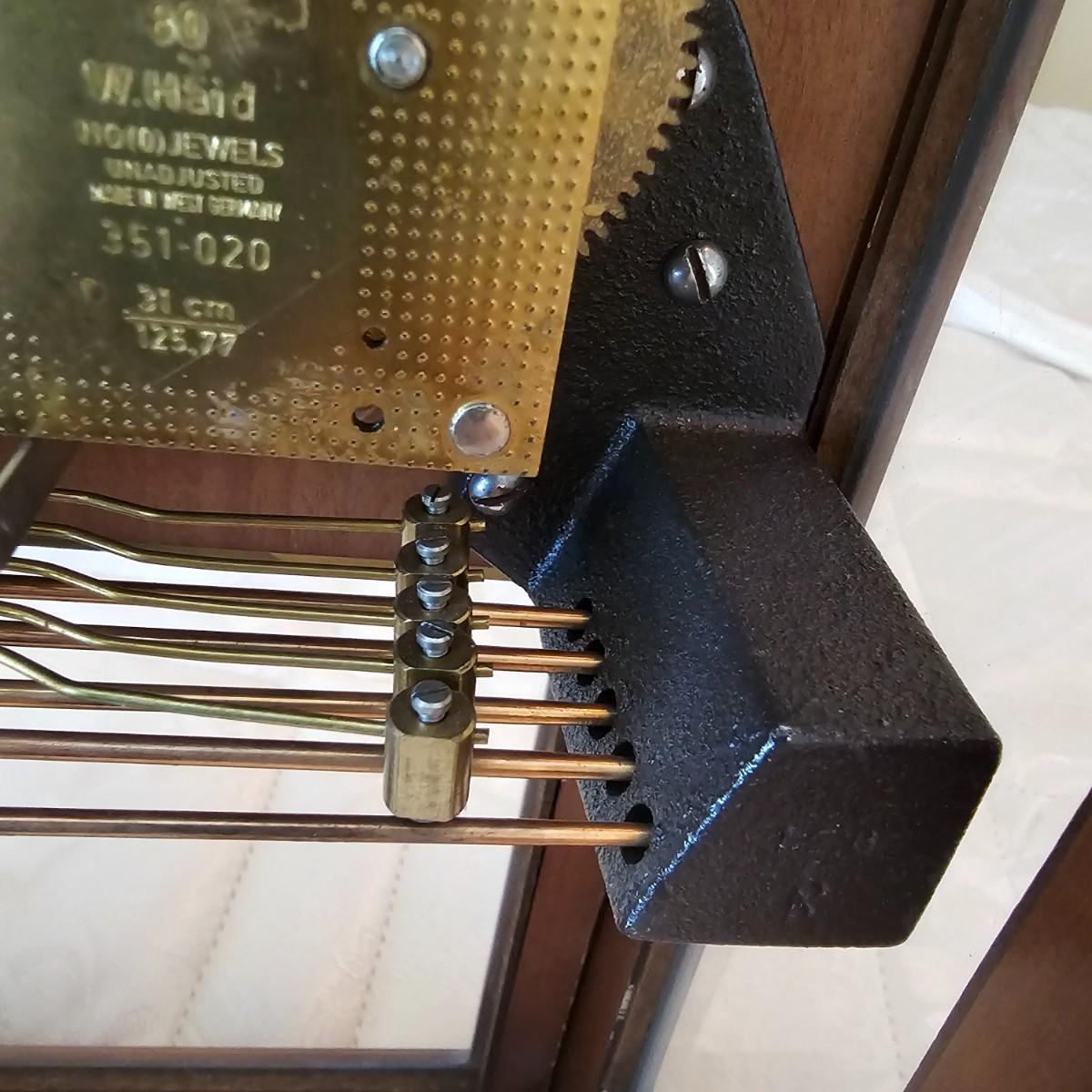 Charming small mechanical wall clock made by W. Haid from West Germany. Clock has domed wooden case with glass front door that opens to wind and set the clock. Winding key included. Back of clock has removable door for cleaning and adjusting the pendulum. Clock has Westminster chimes, but is not known if clock is currently working. Measures 9.5" x 5.5" x 19.5" H. There are several nicks and blemishes on case and pendulum appears to have been secured at some time with tape, which residue is still visible. See photos for details. Shipping available. Shipping can be costly. We suggest contacting our preferred local shipping provider, Postage Express, with dimensions and getting an estimate before bidding: 828-255-9250 or shipping@postageexpressnc.com