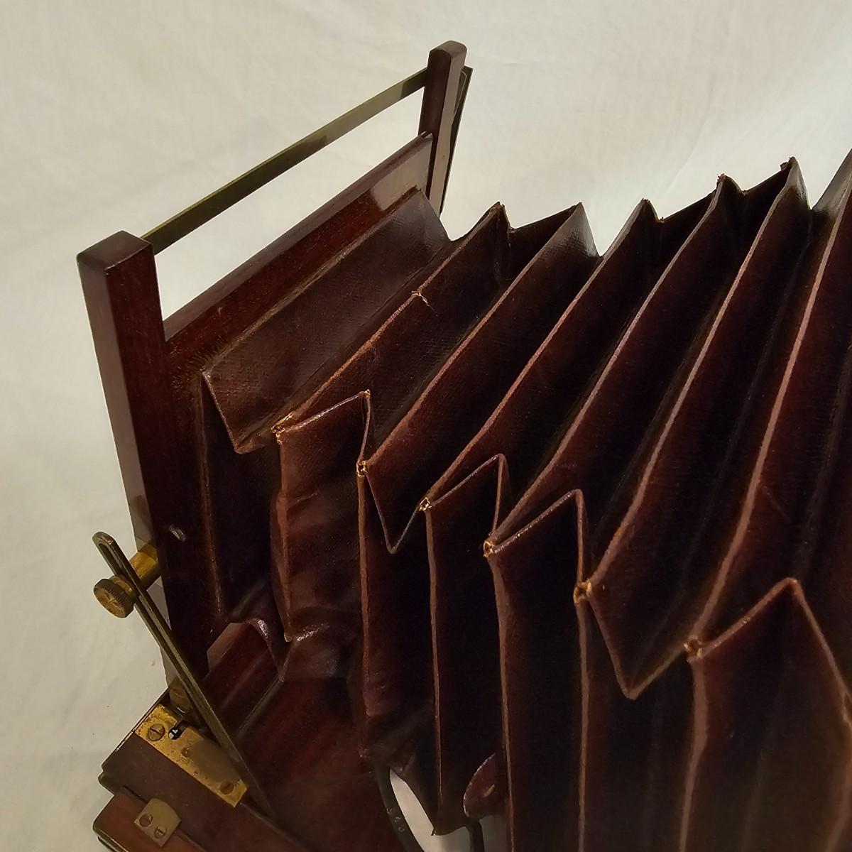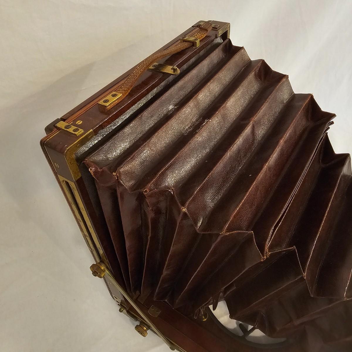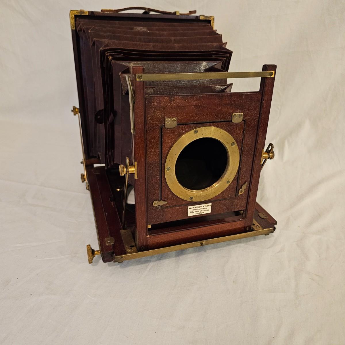 Grace and beauty out of the past, this brass and mahogany view camera by W. Watson & Sons of London has probably seen the world in it's day. Designed to shoot 6" x 8" or smaller sheet film, this item has a threaded lens mount board and opens, extends and bends for just the right exposure. All brass hardware and fixtures for durability. No tripod, lens or film holders with this. Open the camera measures 10" x 11.5" x 11.5"H and will extend some beyond that. Closed, it is only 2 5" thick. Some scratches and tarnish on parts. Own a piece of history. See photos for details. Shipping available.