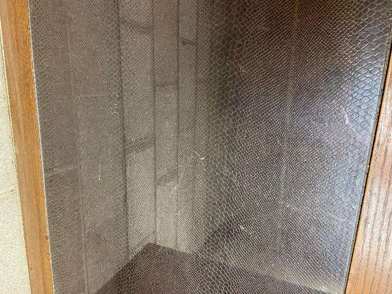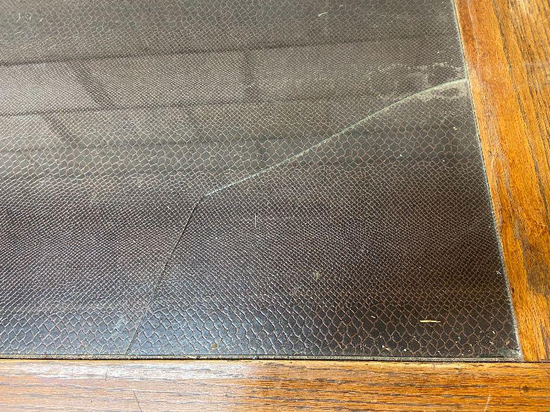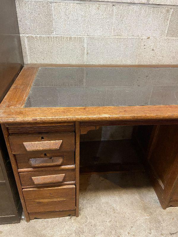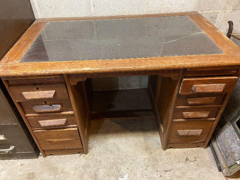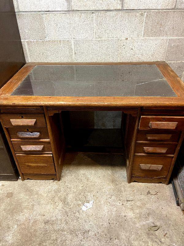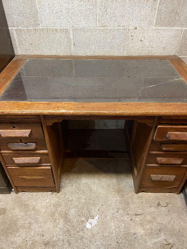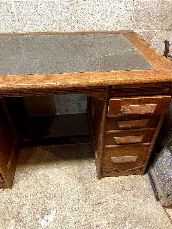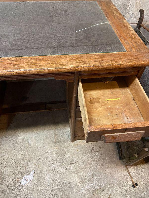 The glass on top is broken, but can easily be replaced. This is a good, sturdy, antique with great patina. Must come up basement ramp and one step.
