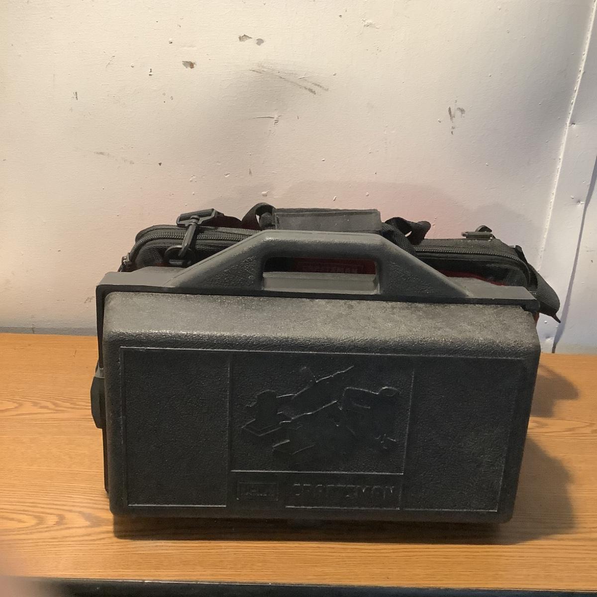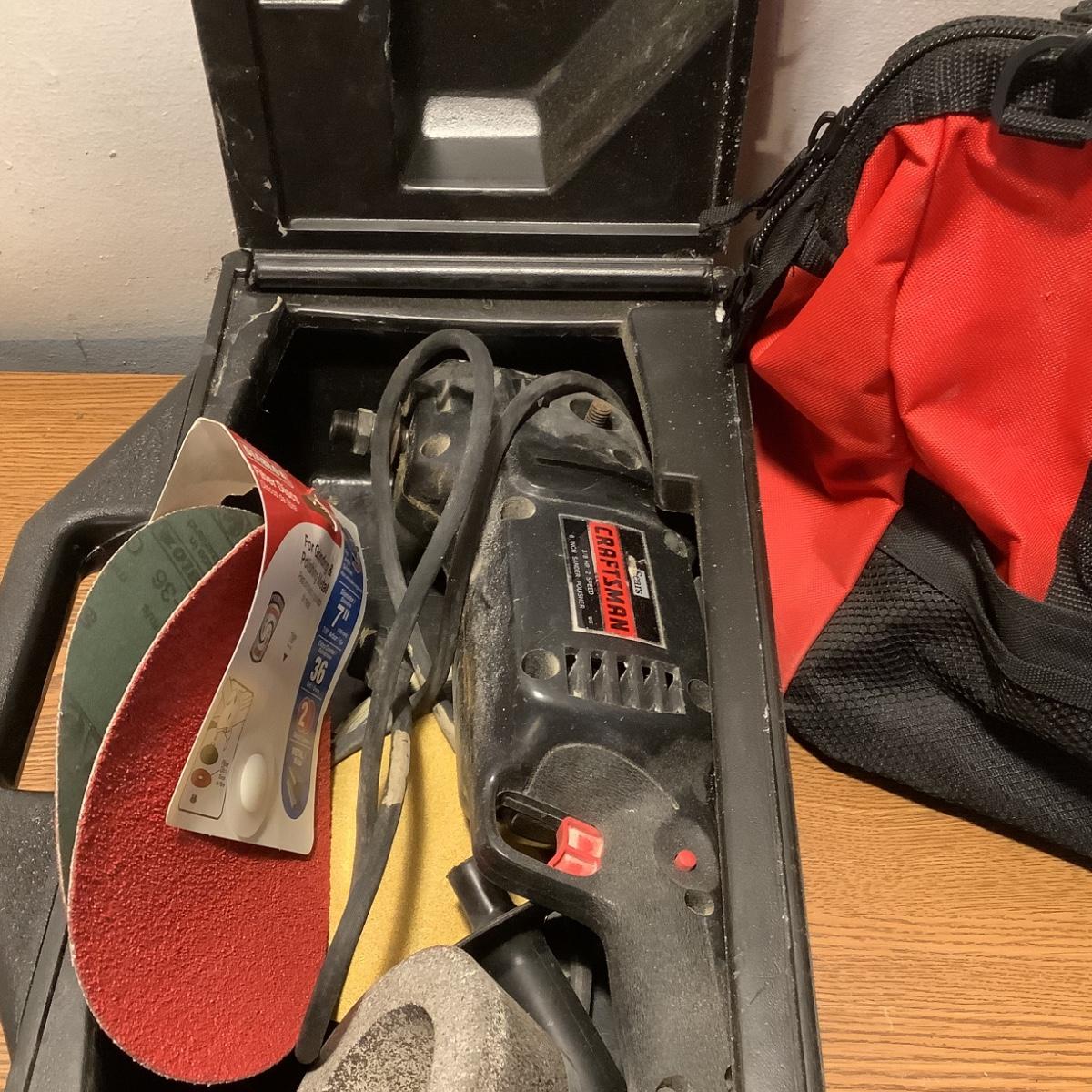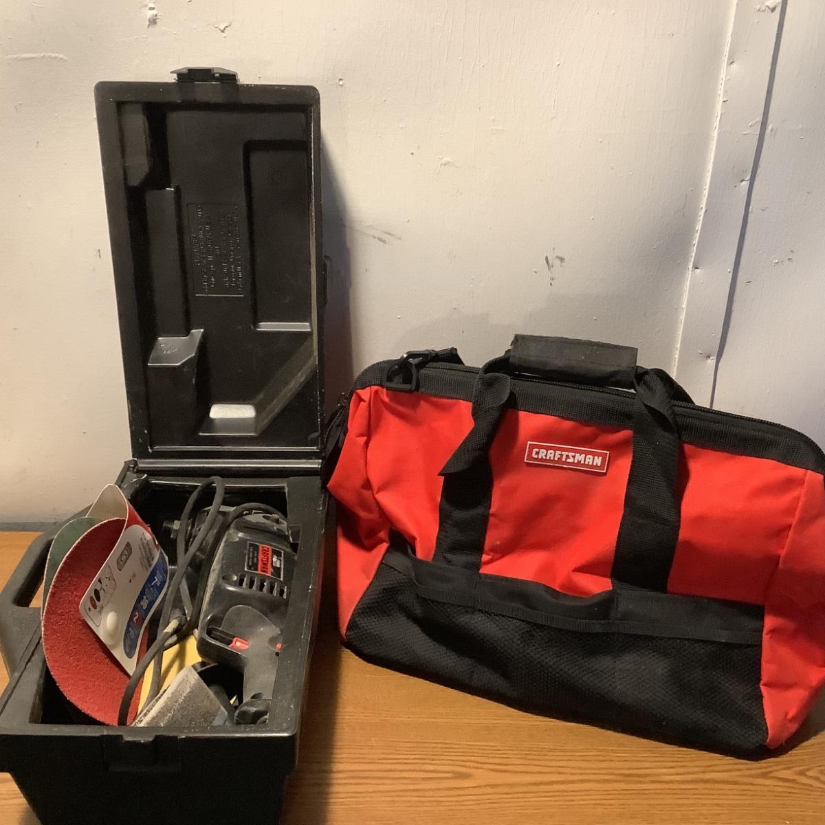Craftsman red tool bag (empty), Stanley hand held electric grinder.