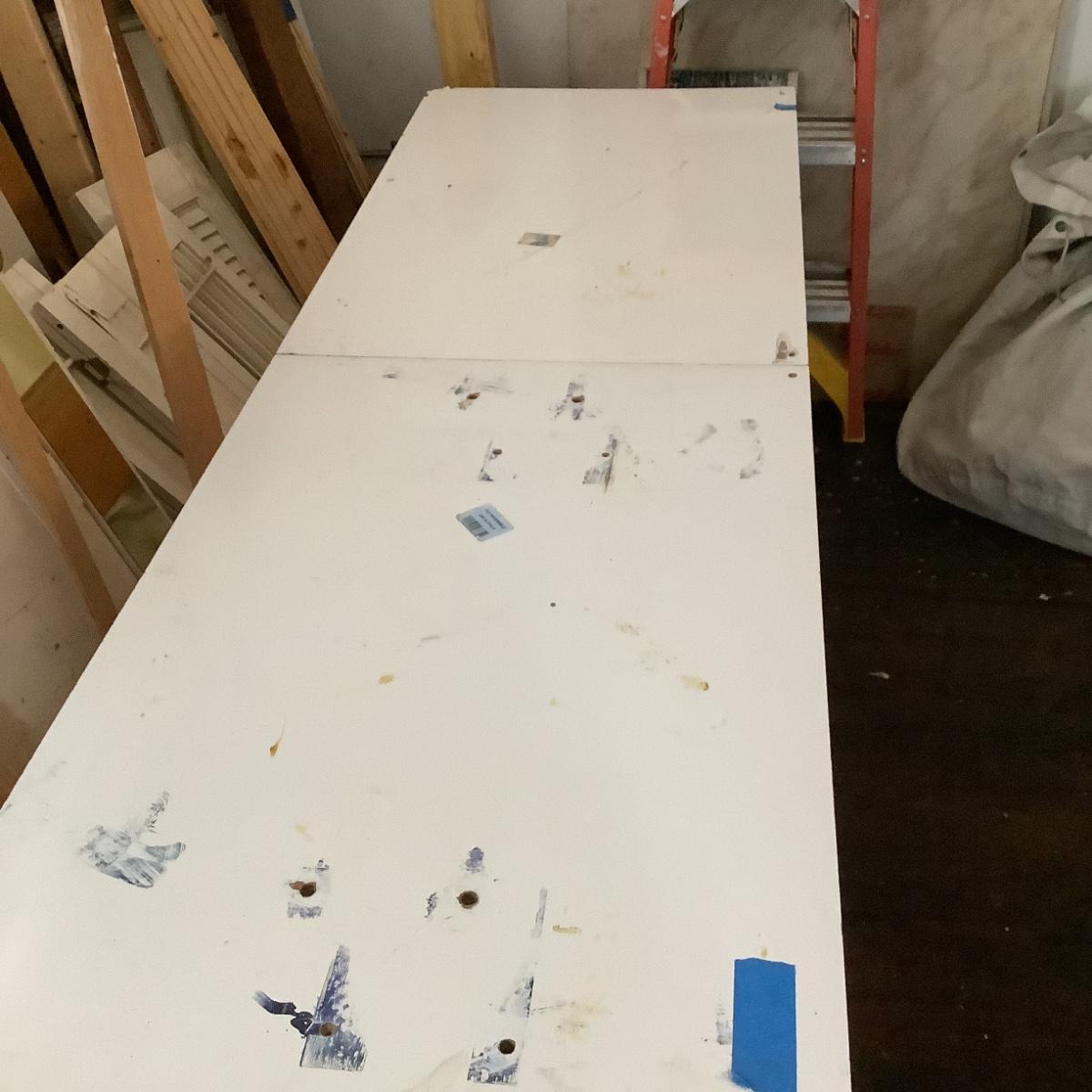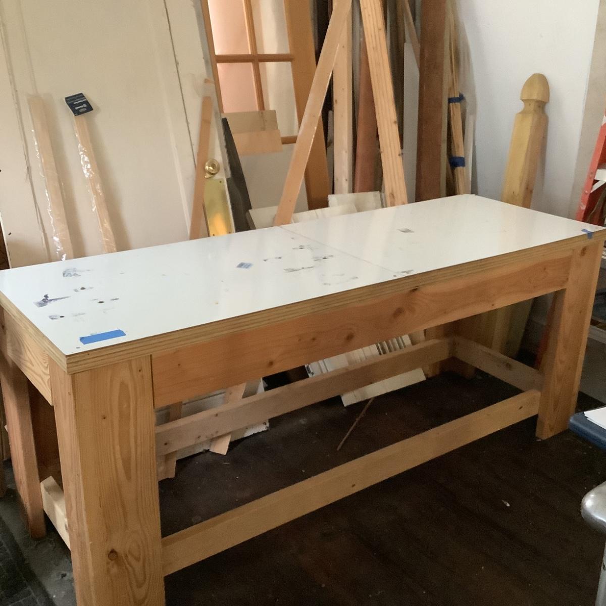 The workbench is custom made, measures 24" deep x 6' long x 29.5" high. It is pine with a white laminate top.