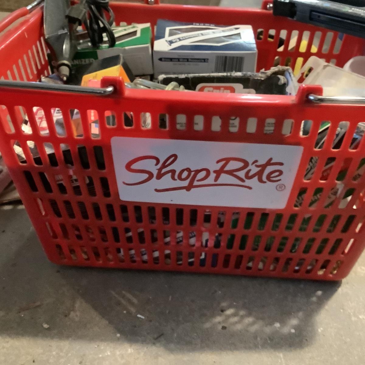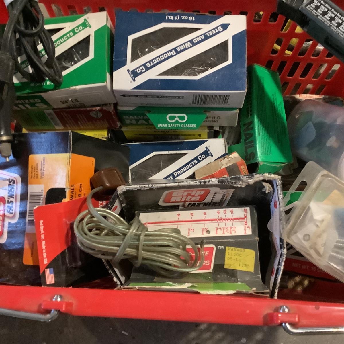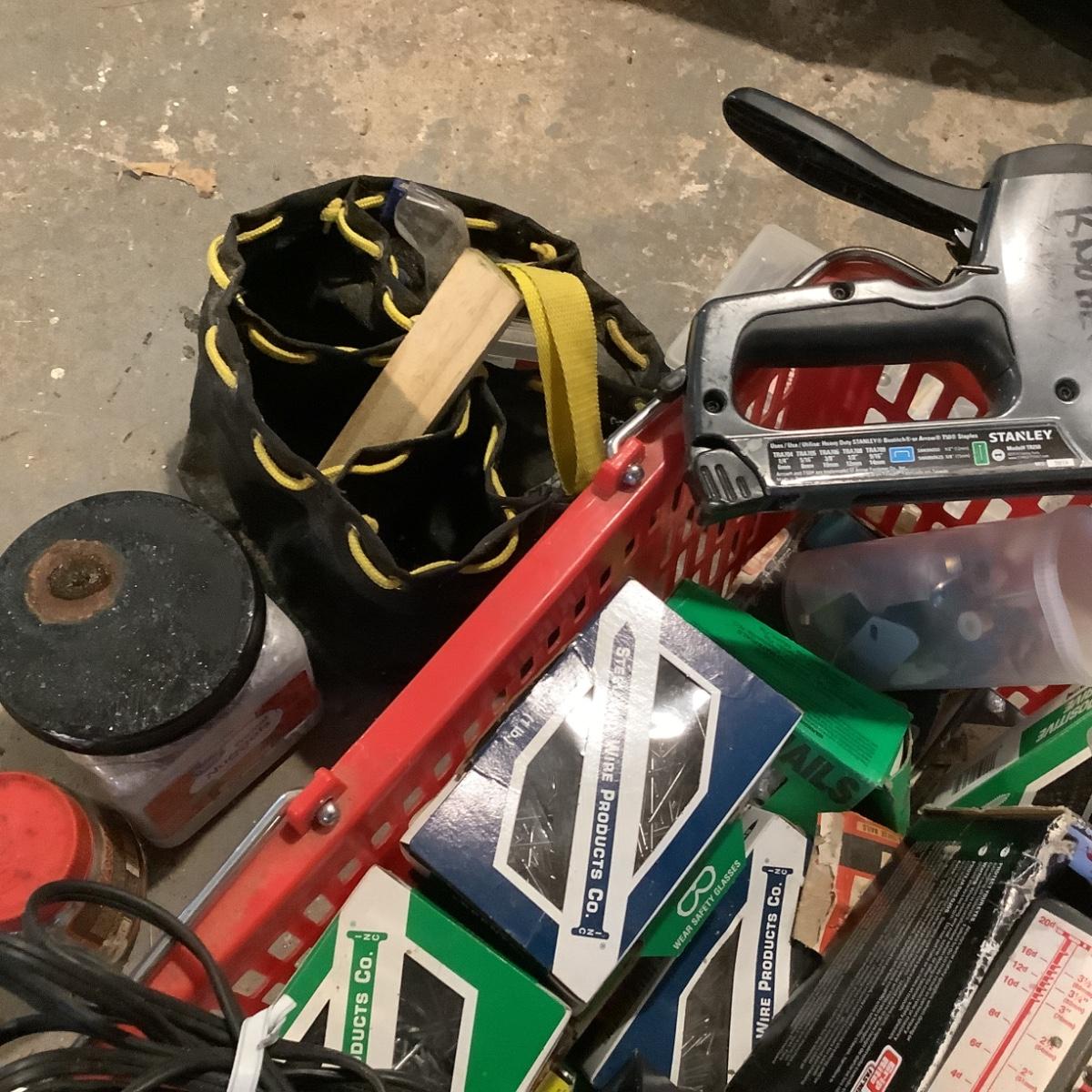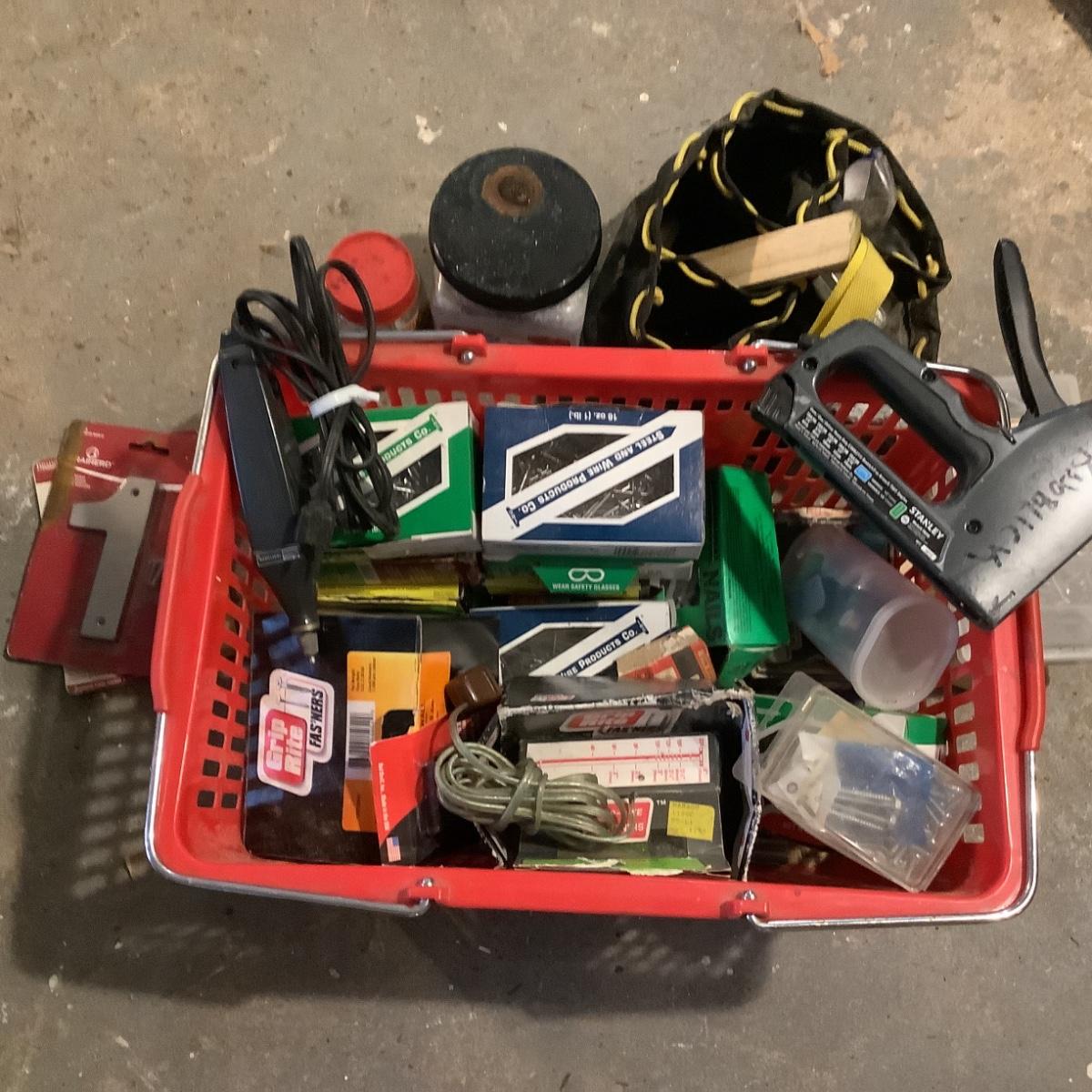 Basket is full of all sorts of nails, bolts, washers, bucket organizer, stapler and much more.