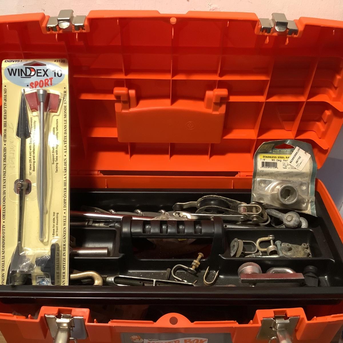 The toolbox is full of marine tools, deck plates, cleats, etc.